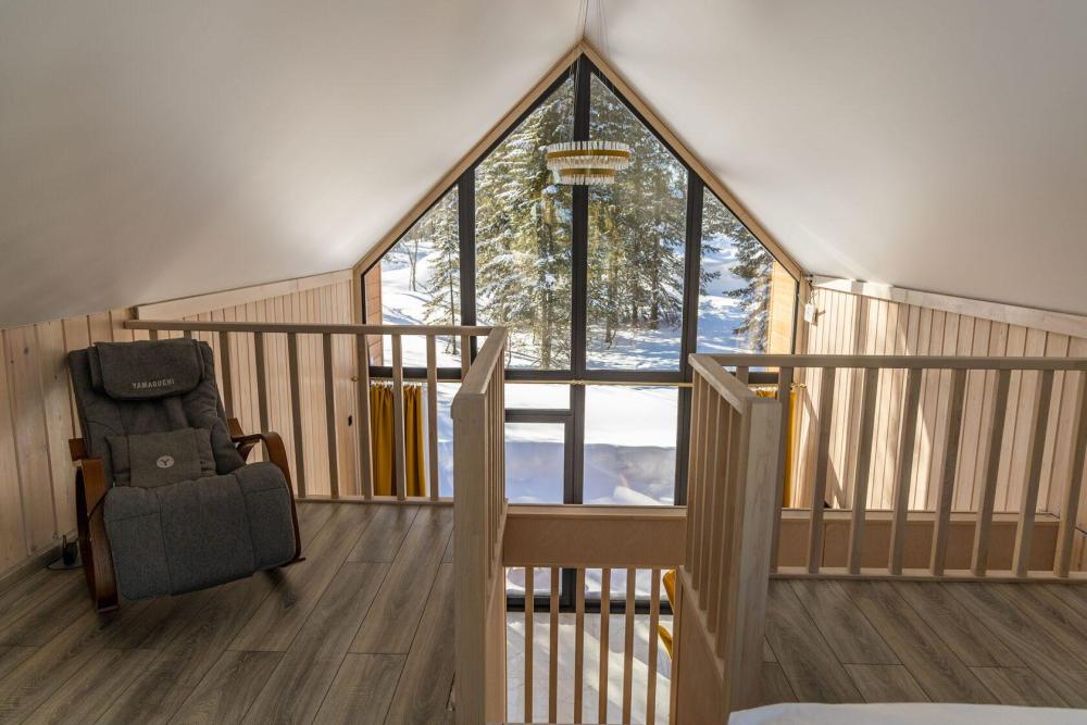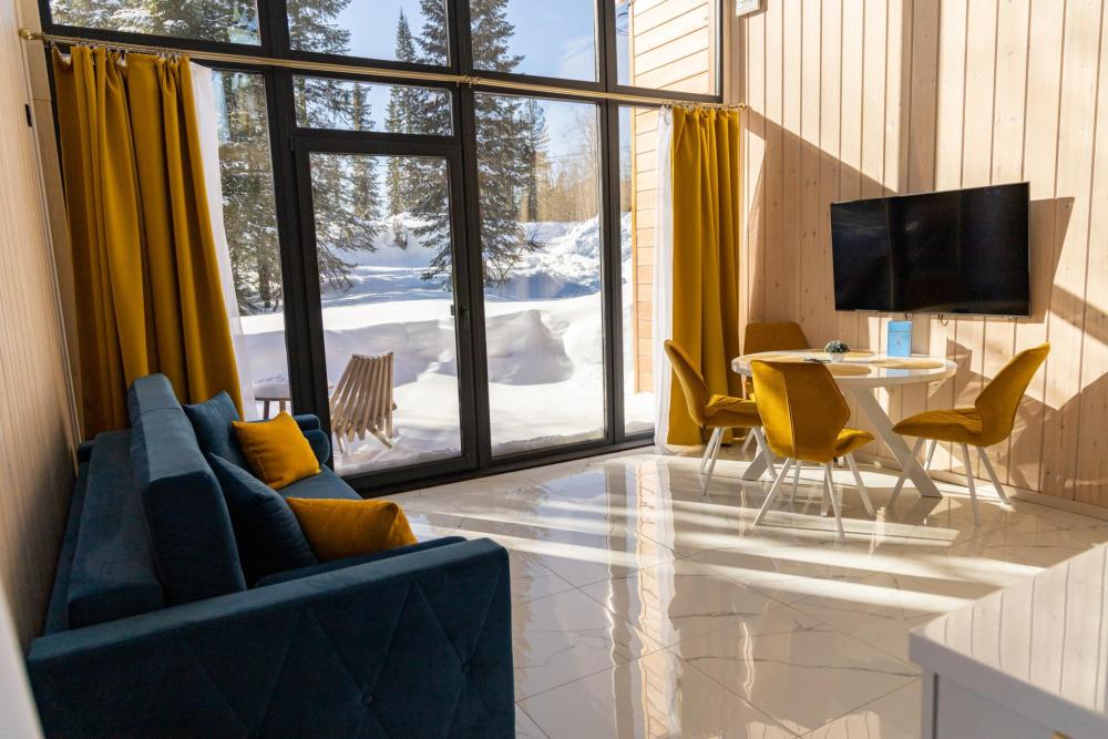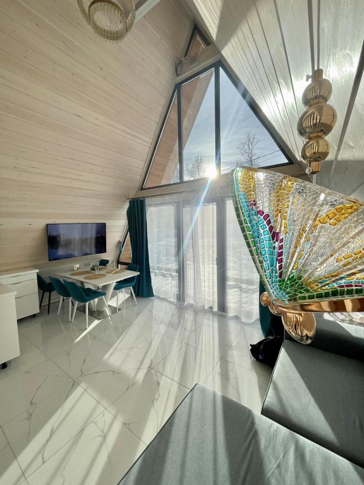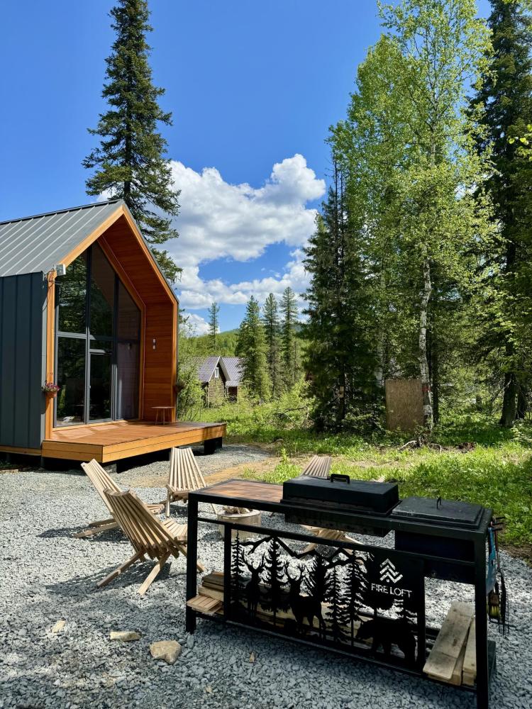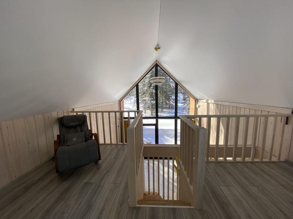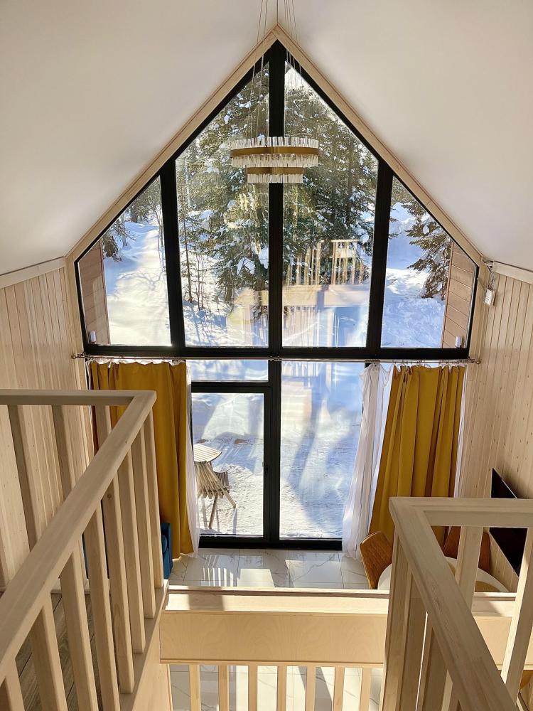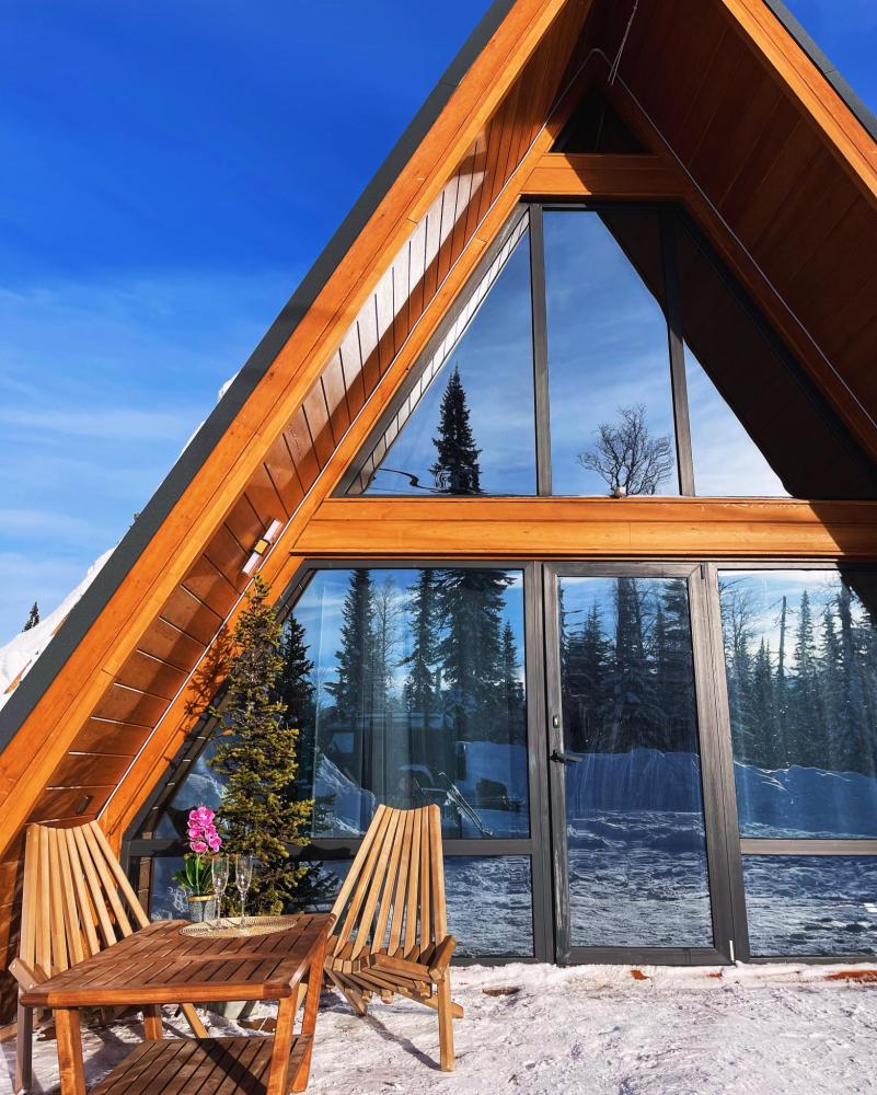 Современный дом в стиле А-фрейм рассчитан на 8 гостей, 6 основных и 2 дополнительных места. Первый этаж: гостиная с раскладным диваном и кухонной зоной, 2 изолированных спальни с двуспальными кроватями, с/у с душевой кабиной. Второй этаж: спальня с панорамными окнами и двуспальной кроватью.