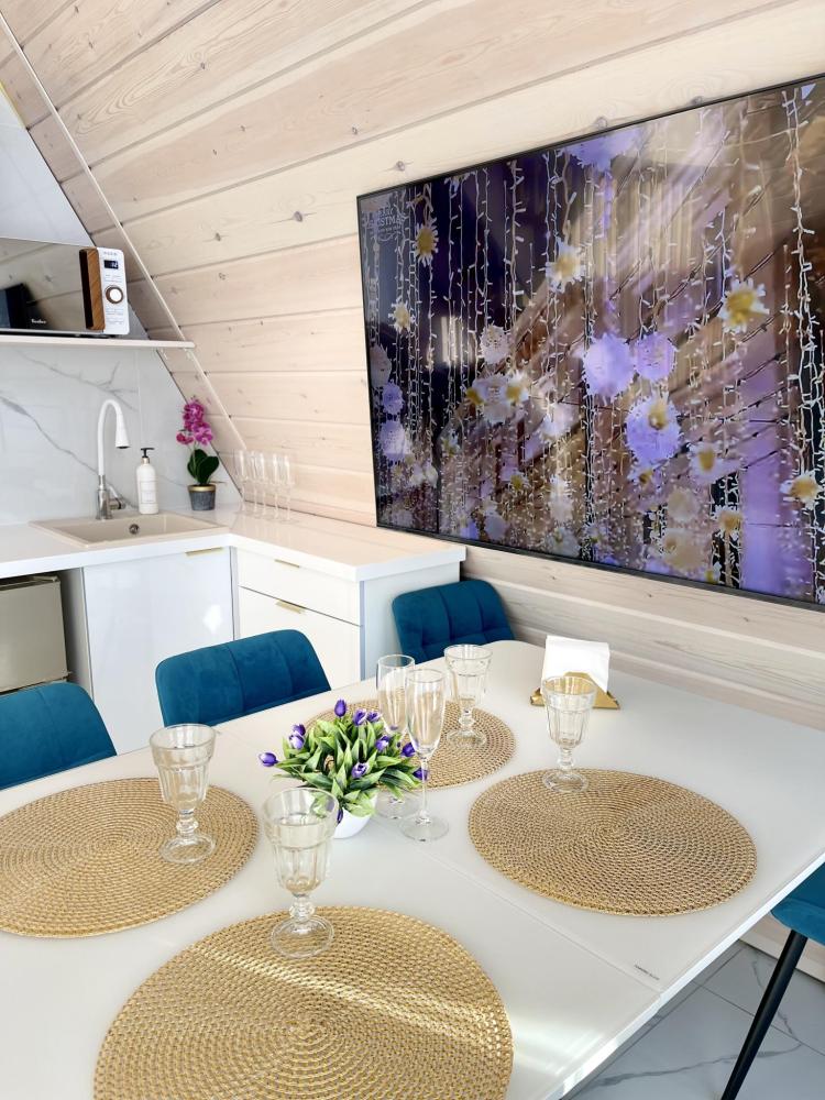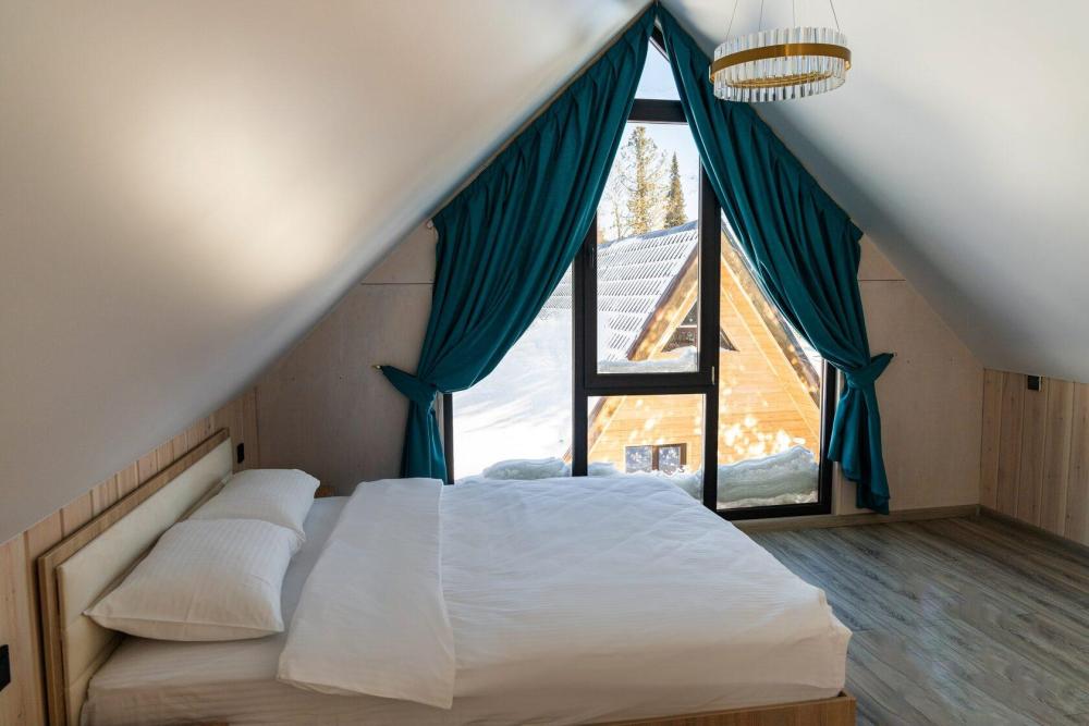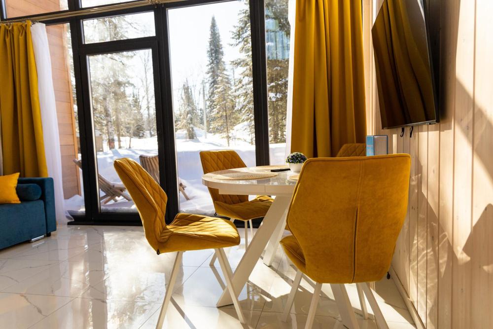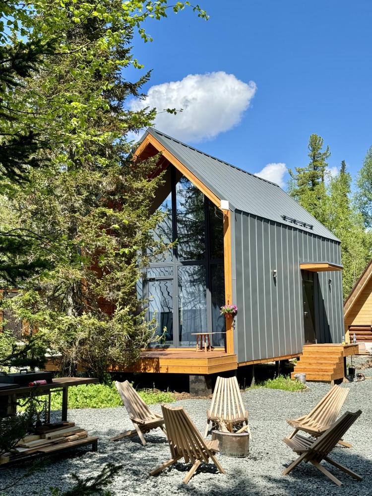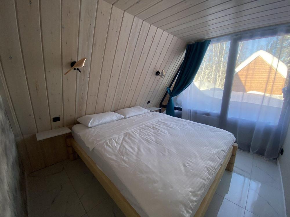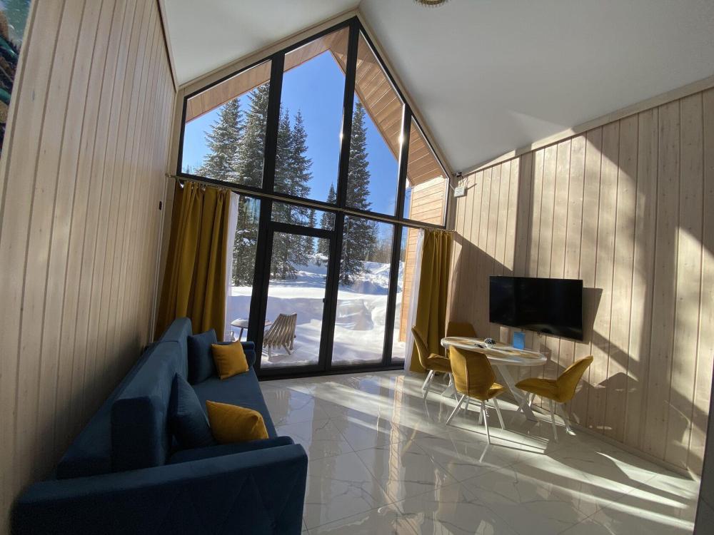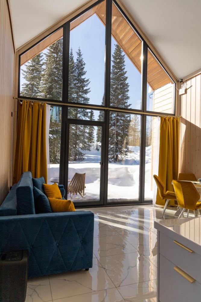 Современный дом в стиле А-фрейм рассчитан на 8 гостей, 6 основных и 2 дополнительных места. Первый этаж: гостиная с раскладным диваном и кухонной зоной, 2 изолированных спальни с двуспальными кроватями, с/у с душевой кабиной. Второй этаж: спальня с панорамными окнами и двуспальной кроватью.