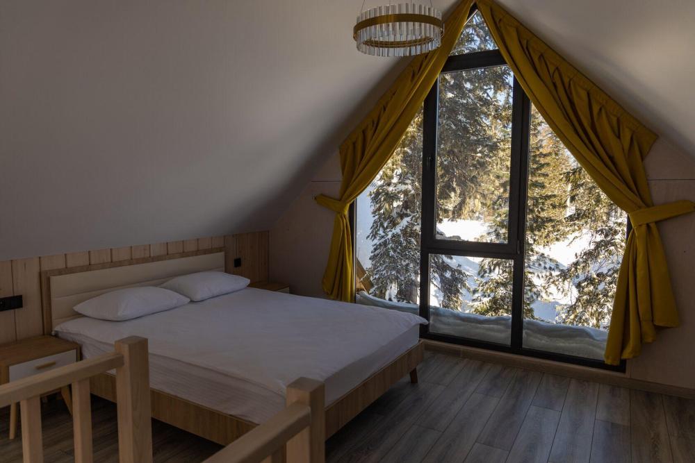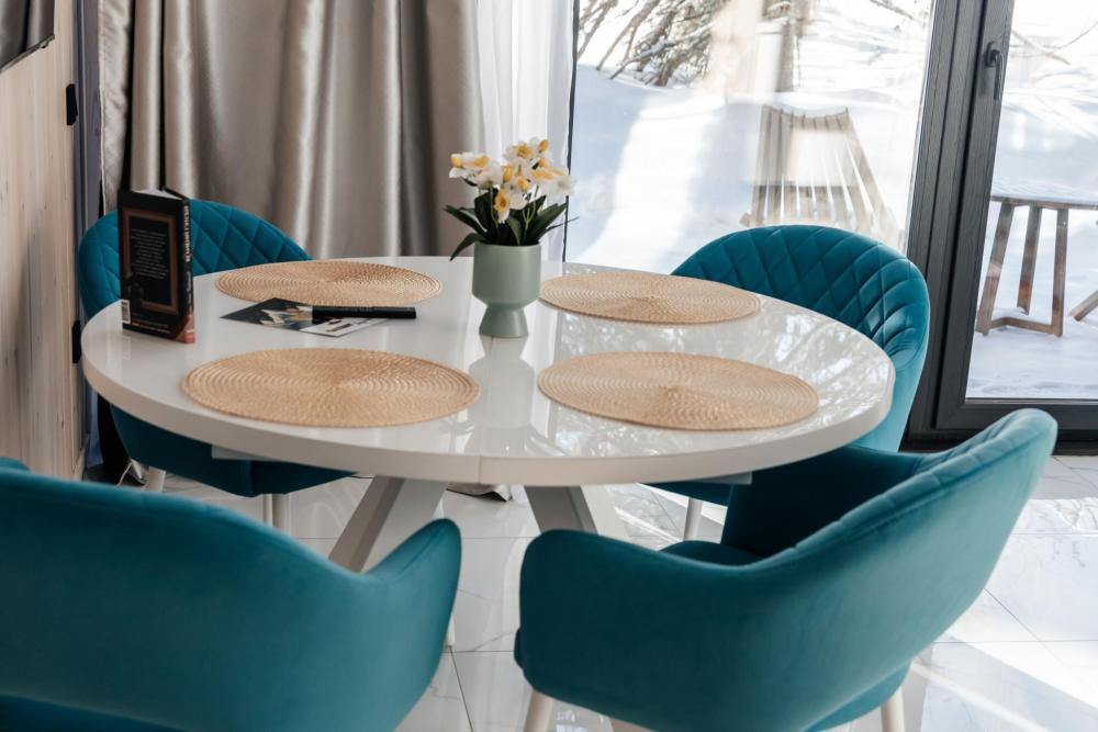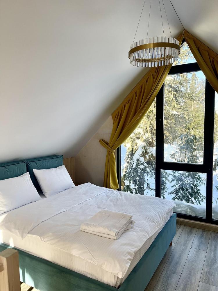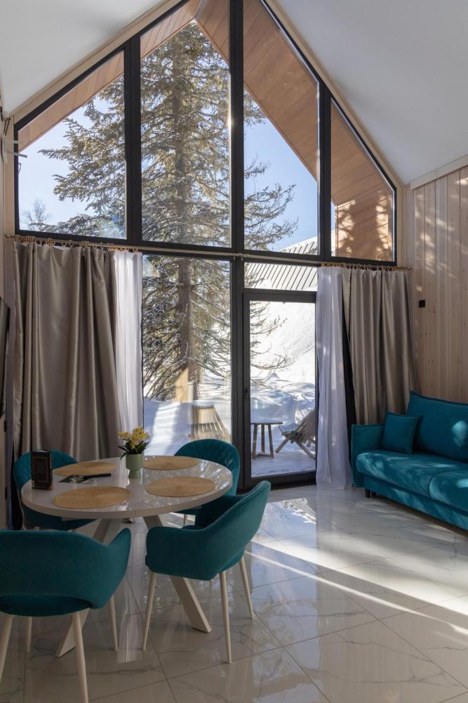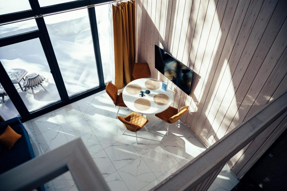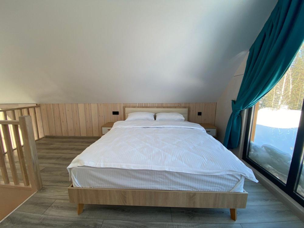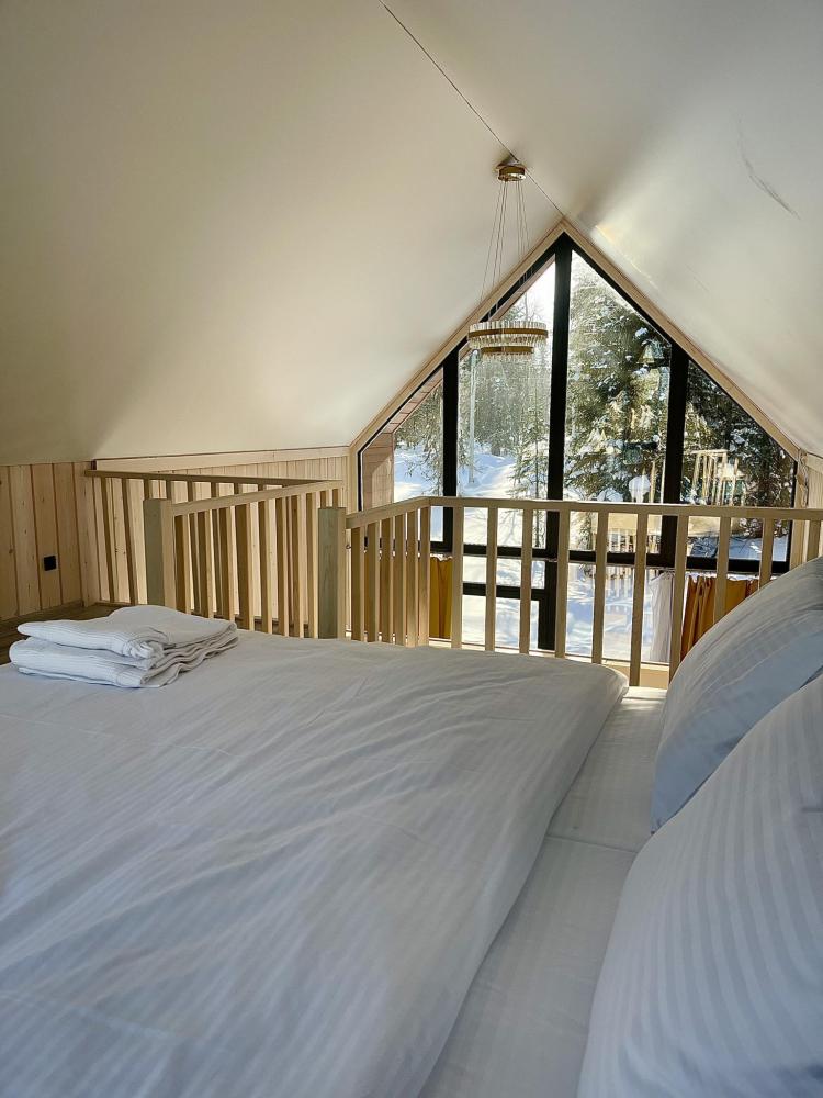 Современный дом в стиле А-фрейм рассчитан на 8 гостей, 6 основных и 2 дополнительных места. Первый этаж: гостиная с раскладным диваном и кухонной зоной, 2 изолированных спальни с двуспальными кроватями, с/у с душевой кабиной. Второй этаж: спальня с панорамными окнами и двуспальной кроватью.