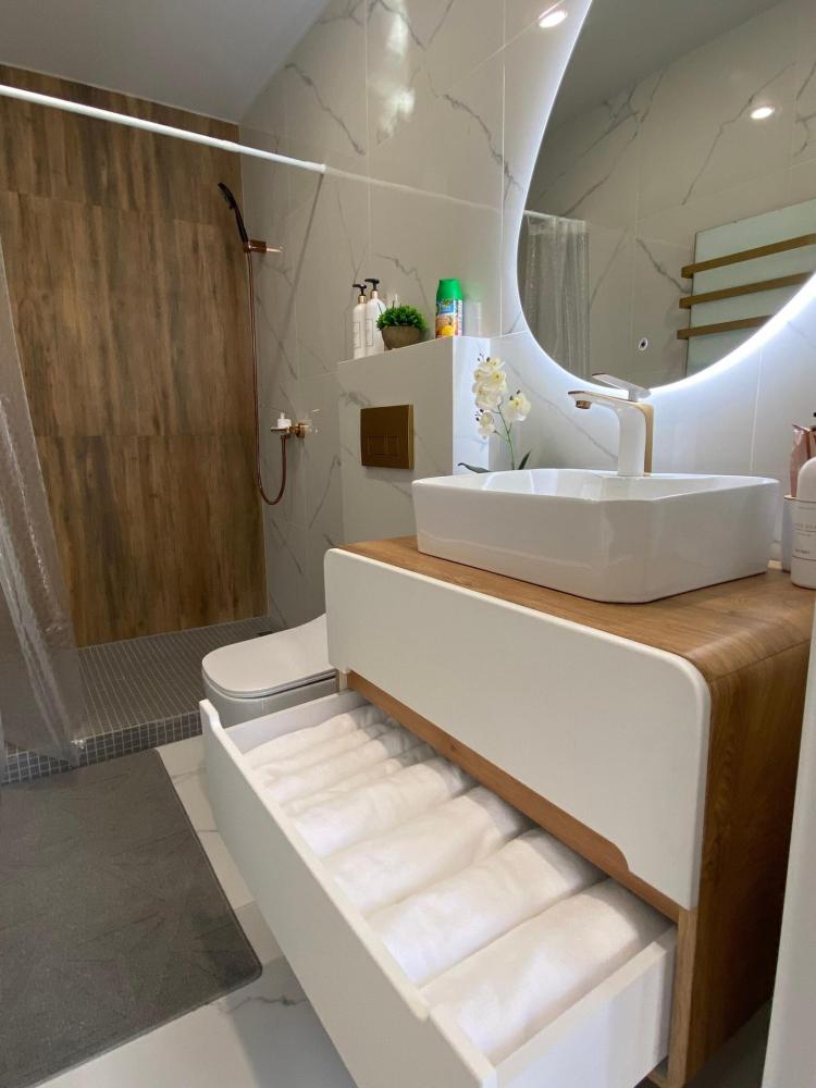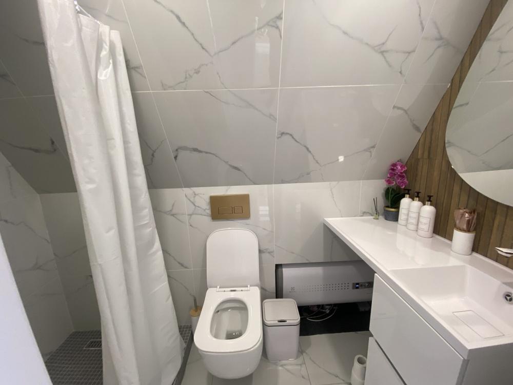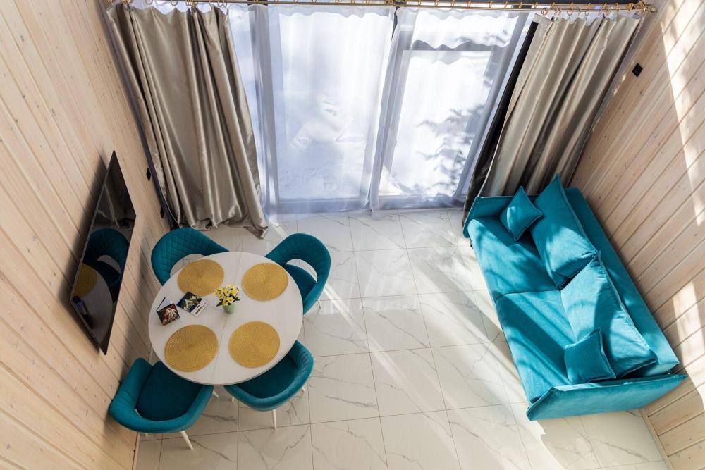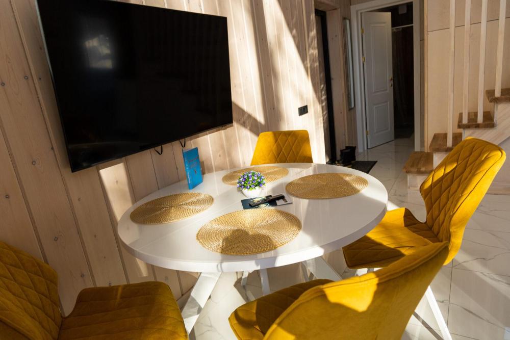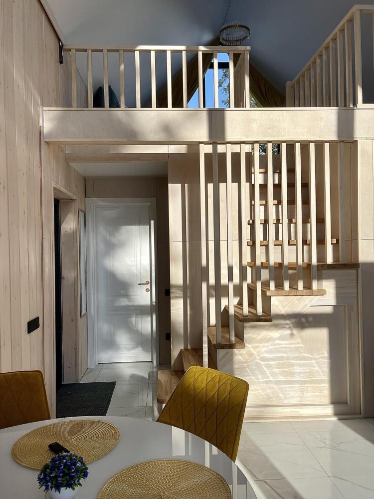 Современный дом в стиле барнхаус рассчитан на 6 гостей: 4 основных и 2 дополнительных места. На первом этаже: гостиная с раскладным диваном и кухонной зоной, изолированная спальня с двуспальной кроватью, с/у с душевой кабиной. На втором этаже: спальня с панорамными окнами, двуспальной кроватью и массажным креслом Yamaguchi.