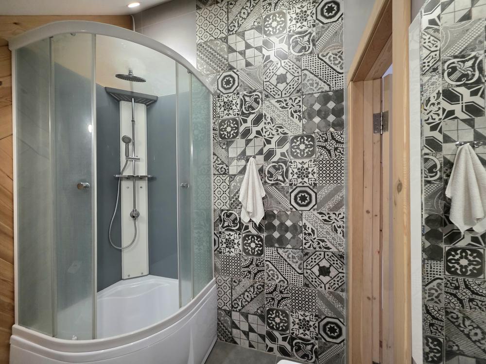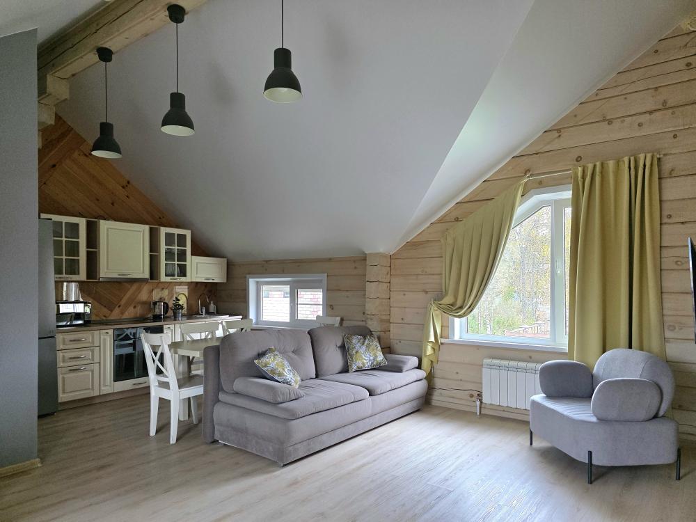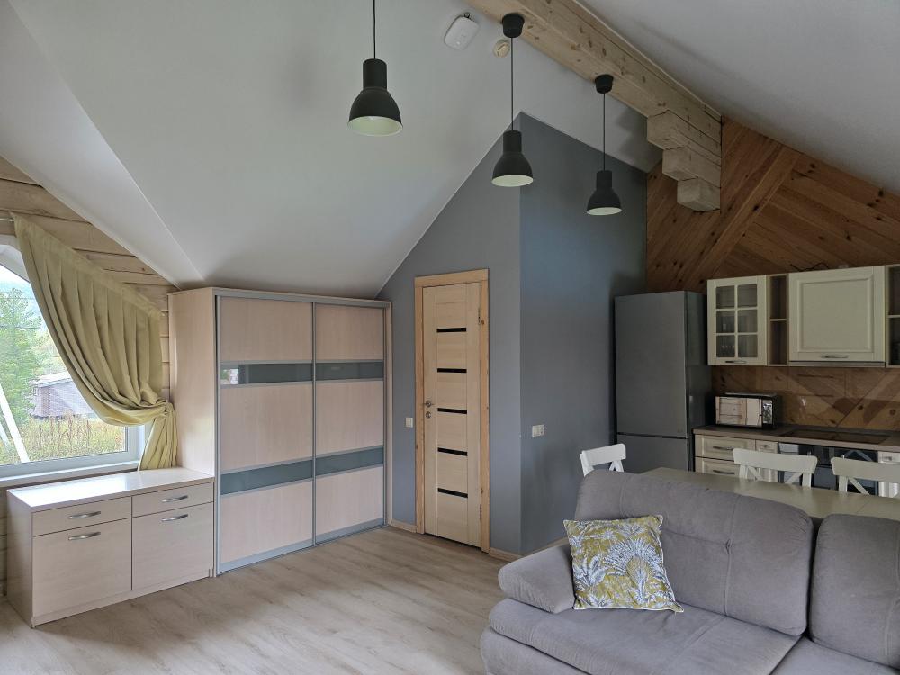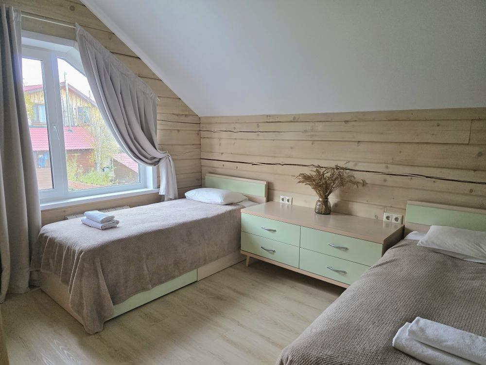 На первом этаже просторная гостиная-студия. Обеденная зона с вместительным столом, рассчитанным на 10 человек. Современная кухня с встроенной техникой: духовой шкаф, варочная панель, холодильник, СВЧ-печь, посудомоечная машина, вытяжка, чайник. К вашему распоряжению вся необходимая посуда для приготовления пищи и сервировки. Лаунж зона в гостиной включает в себя: диван, кресло-качалку, переносной столик под напитки, телевизор с акустической системой. Входная зона оборудована лавочками и местами для обуви. В отдельной гардеробной: удобные сетки для аксессуаров, крепление для оборудования, крючки и плечики для одежды. В комнате сделана дополнительная вентиляция для более качественной просушки вещей и оборудования. Санузел на первом этаже. На втором этаже располагаются три спальни. Две из них с двуспальными кроватями и личными ванными комнатами. Одна спальня имеет выход на балкон. Третья спальня с двумя односпальными кроватями и своей ванной комнатой в коридоре. Коттедж рассчитан на 8 человек, с возможность предоставления двух дополнительных мест для детей. Также есть возможность объединения двух домов, смежная дверь между гостиными открывается для удобства большой компании.