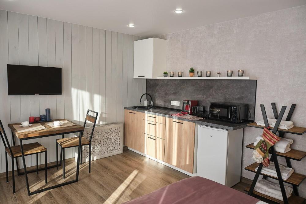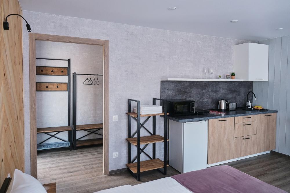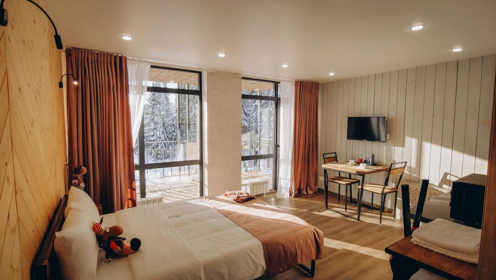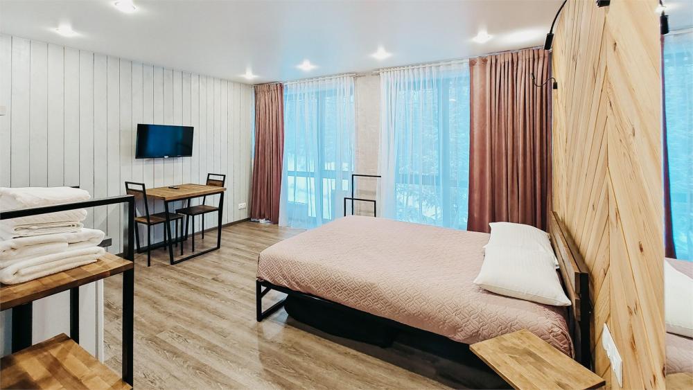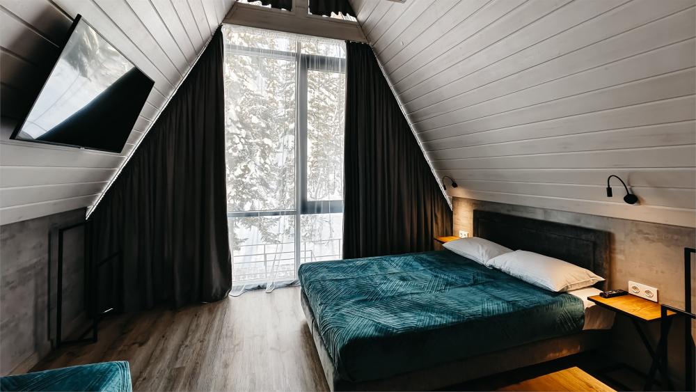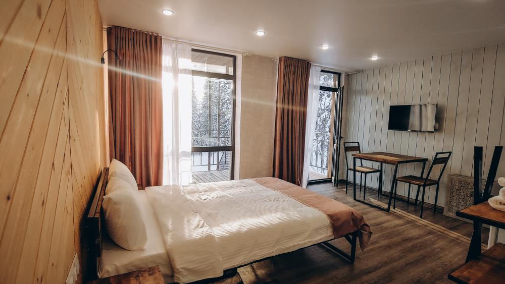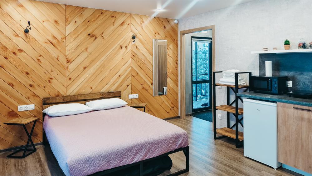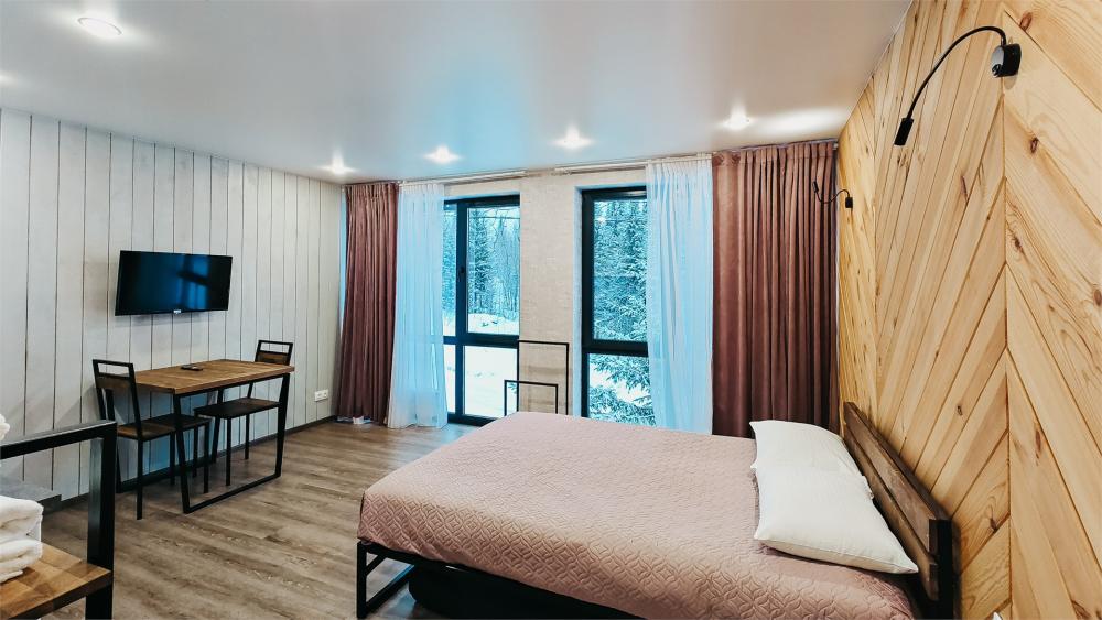 Номер студия общей площадью 25 кв.м. для размещения до 3-х гостей. В номерах выполнен стильный дизайнерский ремонт с применением качественных строительных и отделочных материалов. Современные инженерные технологии позволяют обеспечивать в номерах комфортную температуру и климат. Витражное остекление в пол наполняет студию светом, создавая атмосферу воздушности и лёгкости. Из окон открывается вид на хвойный лес и заснеженные вершины гор с одной стороны и уютный внутренний двор с балконом с другой стороны.