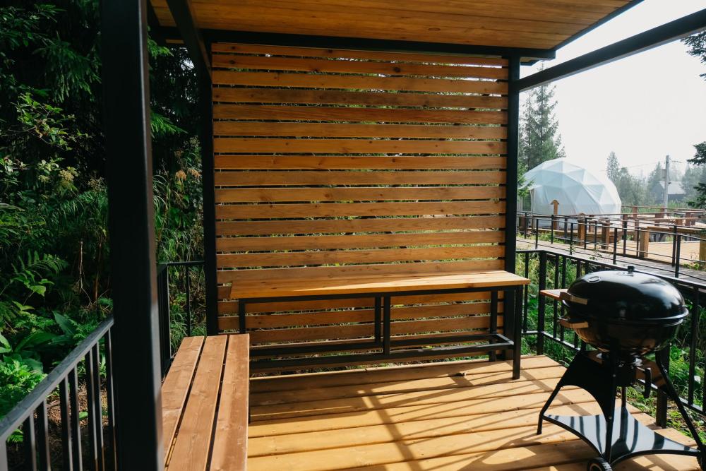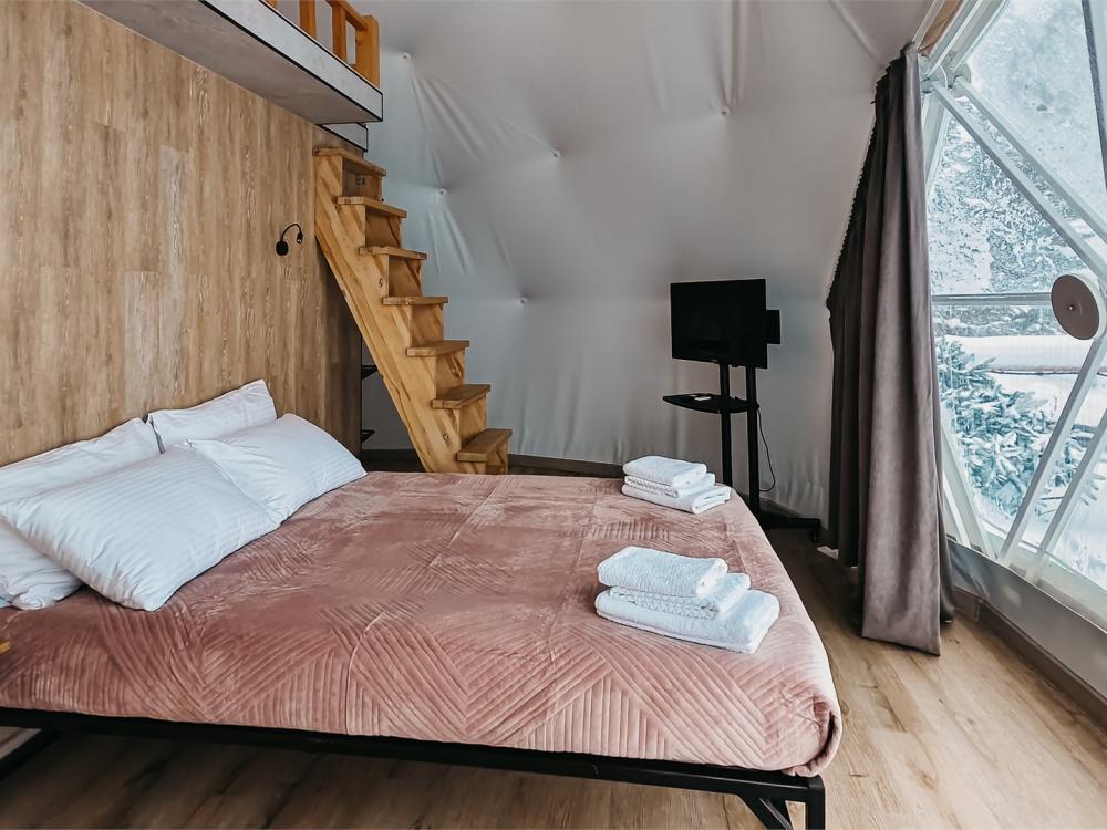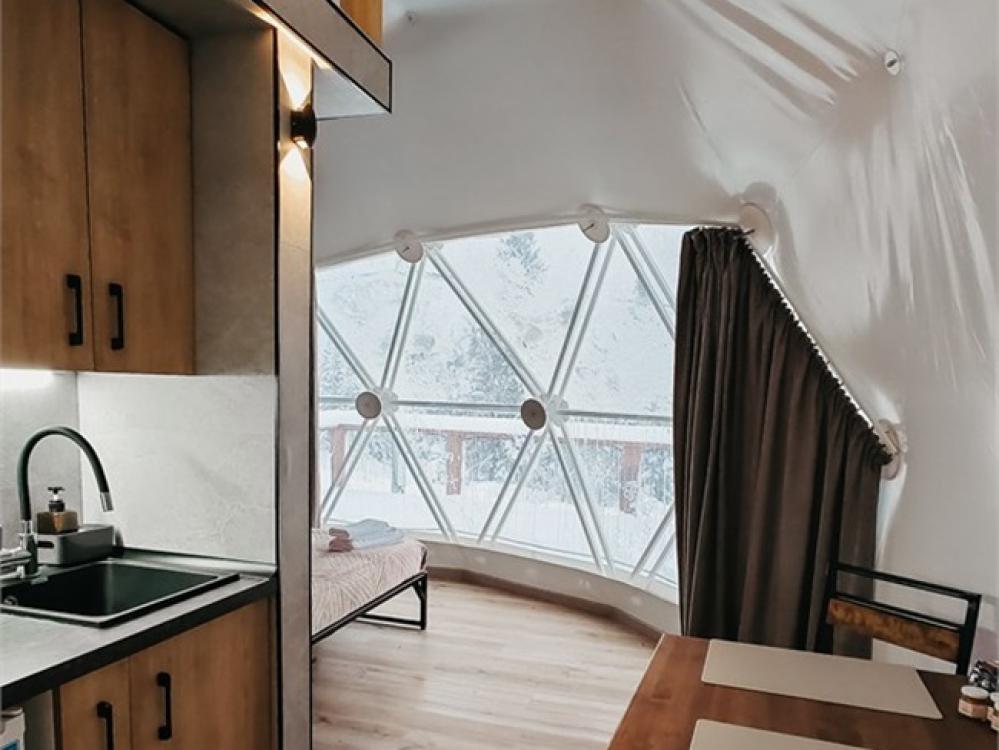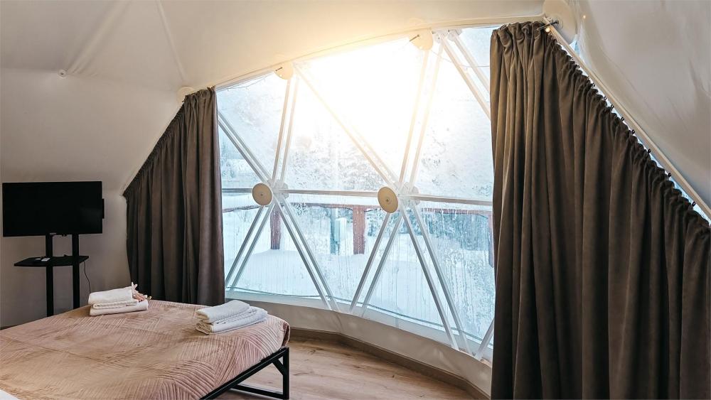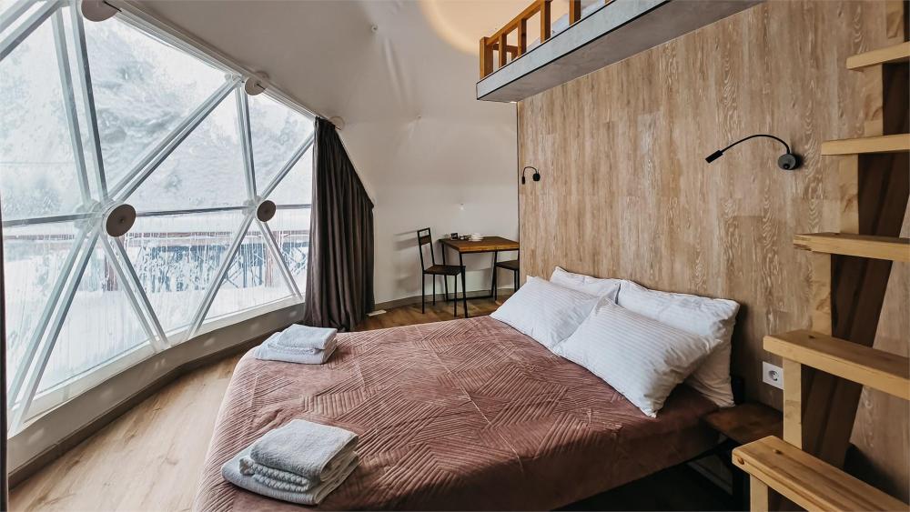 Современный дом в форме полусферы общей площадью 32 кв.м. для размещения до 4-х гостей. Дом оснащен всем необходимым для комфортного отдыха с дизайнерским ремонтом, выполненным качественными строительными материалами. Из панорамного окна открывается вид на хвойный лес и заснеженные вершины гор. Перед сферой отсутствуют иные строения. Глэмпинг расположен на отдельной террасе в отдалении от других зданий, что обеспечивает гостям тишину и уединение.