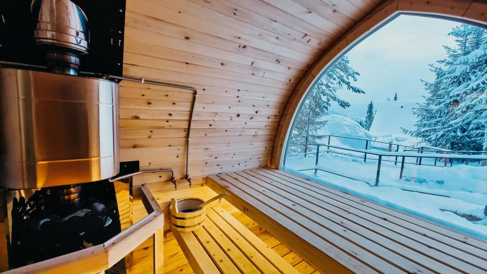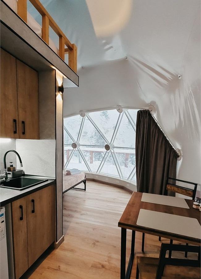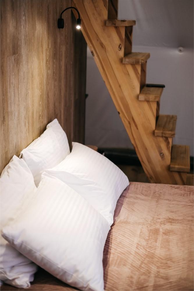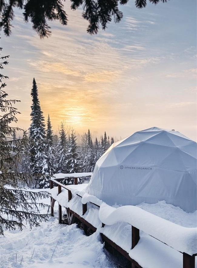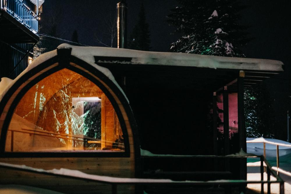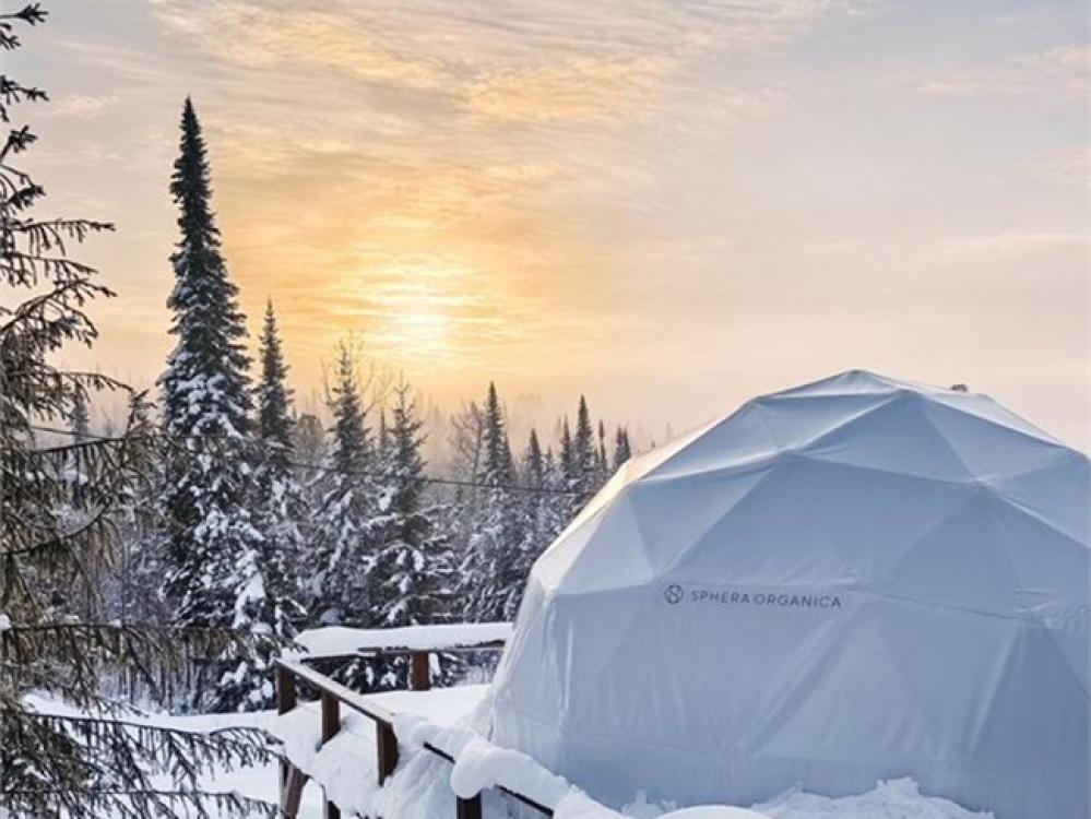 Современный дом в форме полусферы общей площадью 32 кв.м. для размещения до 4-х гостей. Дом оснащен всем необходимым для комфортного отдыха с дизайнерским ремонтом, выполненным качественными строительными материалами. Из панорамного окна открывается вид на хвойный лес и заснеженные вершины гор. Перед сферой отсутствуют иные строения. Глэмпинг расположен на отдельной террасе в отдалении от других зданий, что обеспечивает гостям тишину и уединение.