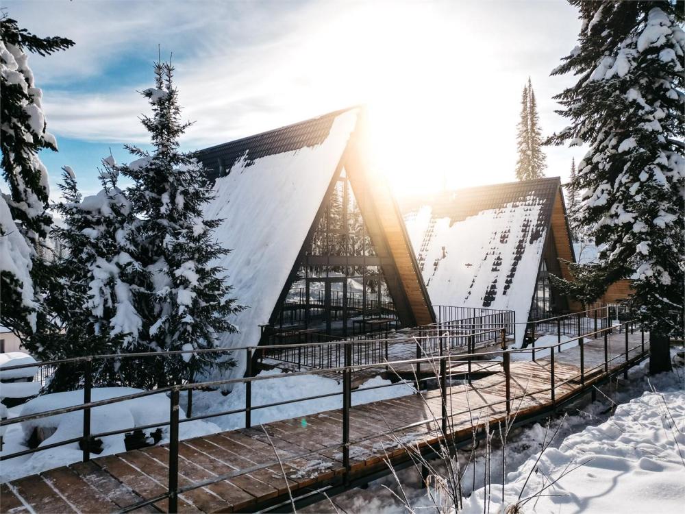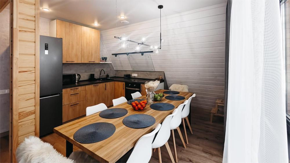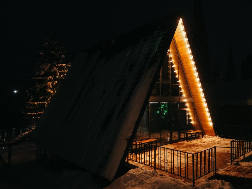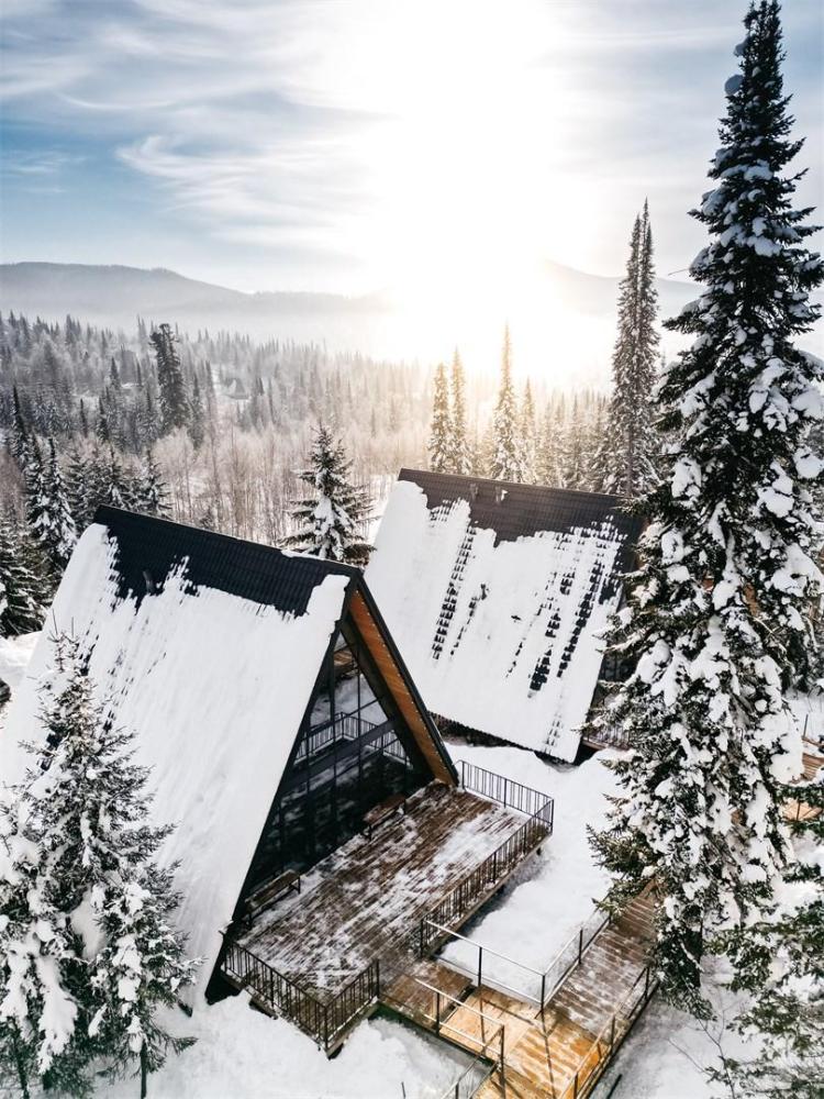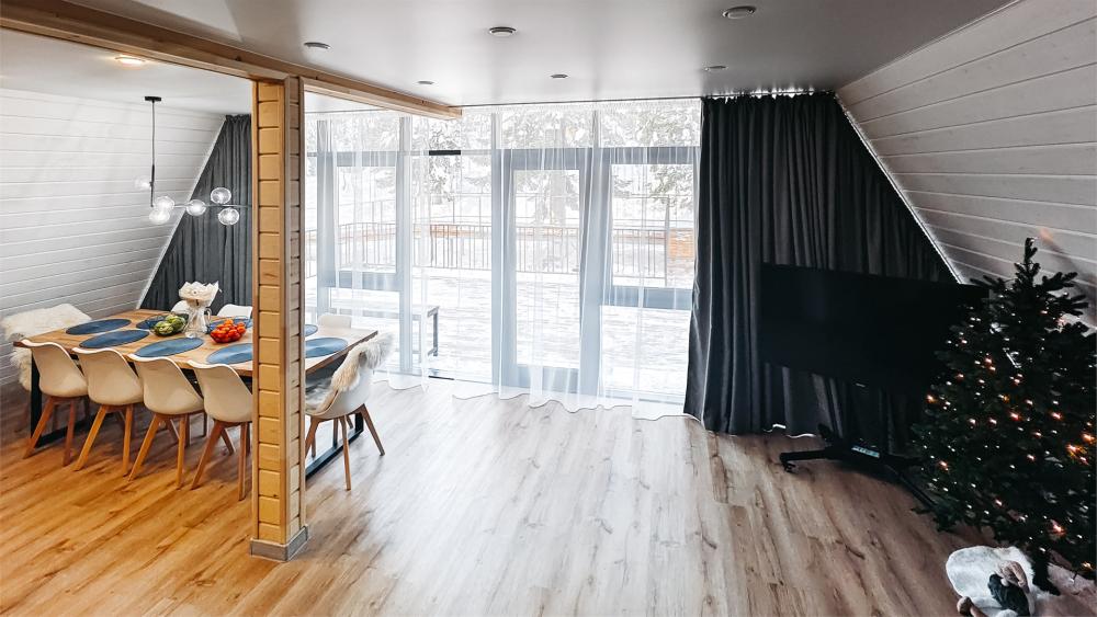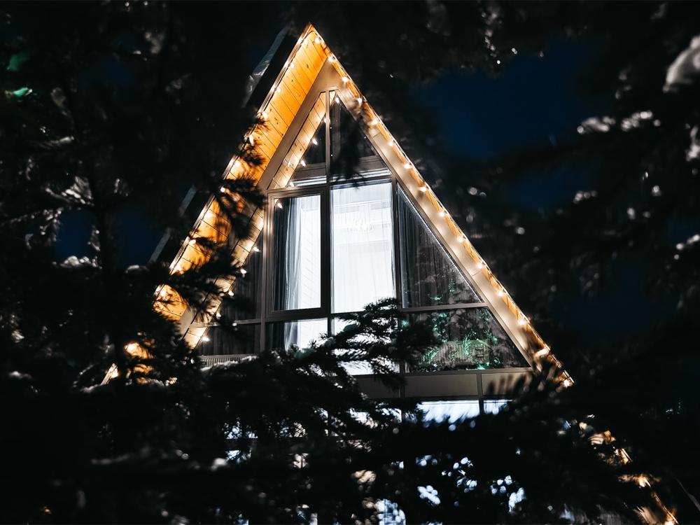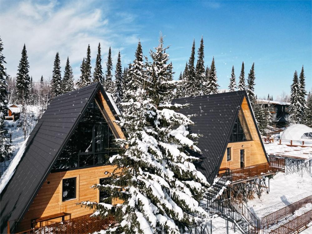 Дом двухэтажный в стиле А-фрейм общей площадью 130 кв.м. для размещения до 10-ти гостей. Современный дом в форме треугольника, оснащенный всем необходимым для комфортного отдыха. В доме выполнен стильный дизайнерский ремонт качественными строительными материалами. Витражное остекление в пол наполняет помещения светом, создавая атмосферу воздушности, лёгкости и создаёт ощущение близости к природе. Из окон открывается вид на хвойный лес и заснеженные вершины гор с одной стороны и уютный внутренний двор с террасой с другой стороны.