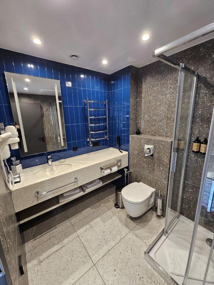 Просторный однокомнатный номер в Лофт-стиле с двуспальной кроватью, заготовлен комплектом гигиенических средств. Для вашего удобства в номере размещена сушилка для обуви, мини-бар и чайная станция. В качестве дополнительного места в номере размещен раскладной пуф / диван – ( 1850*65см) в разложенном виде, для вашего ребенка. С помощью системы "Умный дом" возможно регулировать температурный режим в номере, и теплый пол в ванной и в коридоре. Голосовое управление номером. Ремонт в 2025 году.