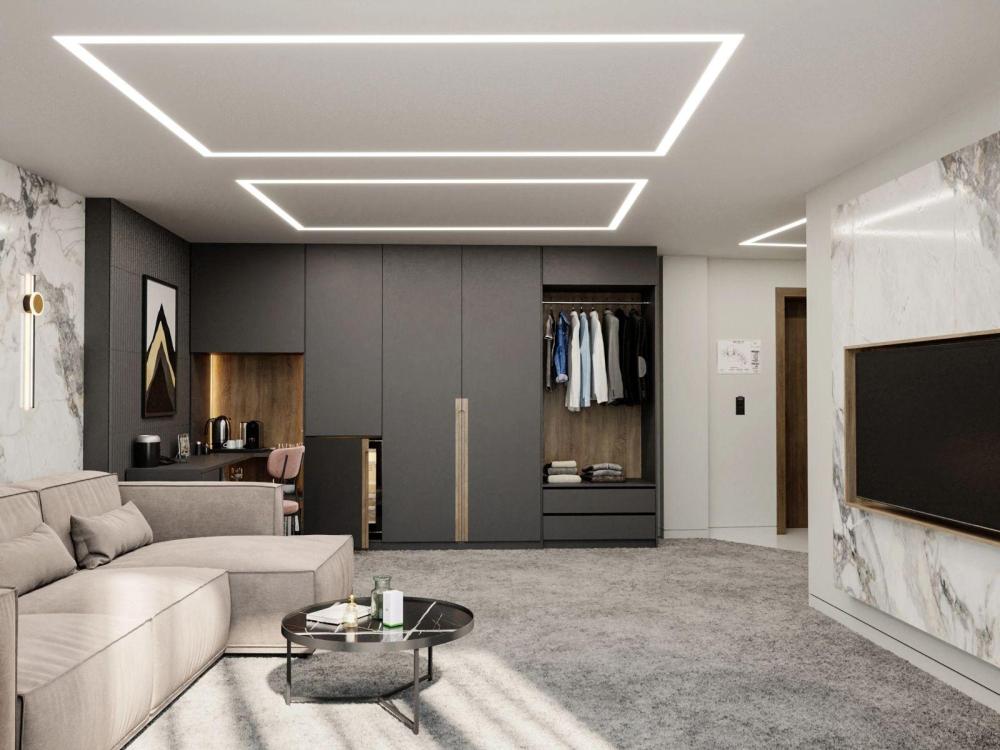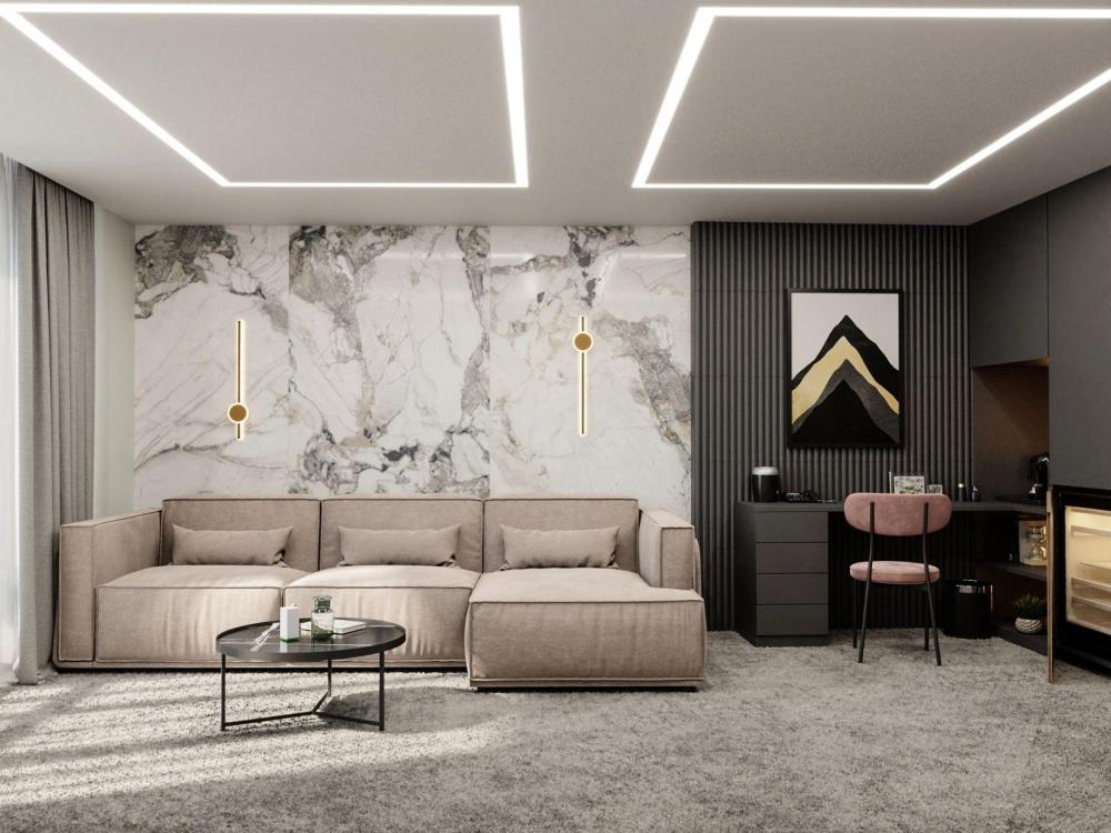 Двухкомнатный люксовый номер, включает в себя гостиную и спальню с завораживающим панорамным видом на горы. Предусмотрено все необходимое: капсульная кофе-машина, теплый пол, полный комплект гигиенических средств, сейф и многое другое. Также присутствует регулировка температуры в номере с помощью системы "умный дом".