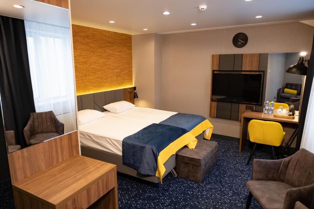 Однокомнатный номер с двуспальной кроватью в стиле Loft. В номере гостей ждет всё для комфортного пребывания: теплый пол, комплекты гигиенических средств, black-out шторы и вся необходимая техника. Присутствует регулировка температуры в номере с помощью системы "умный дом".