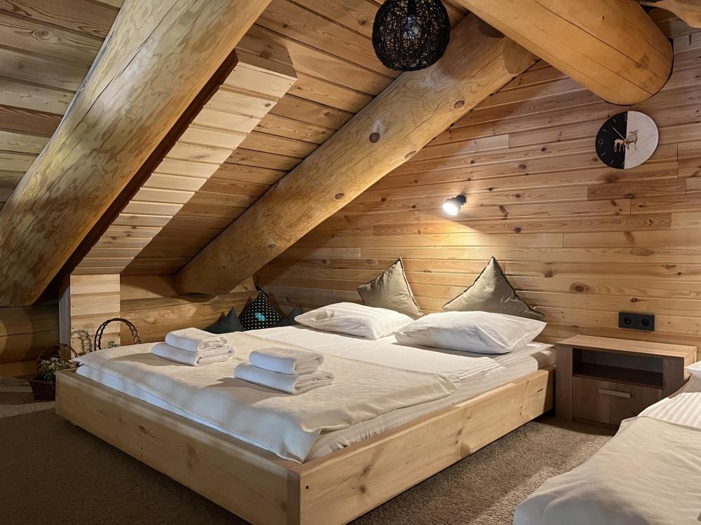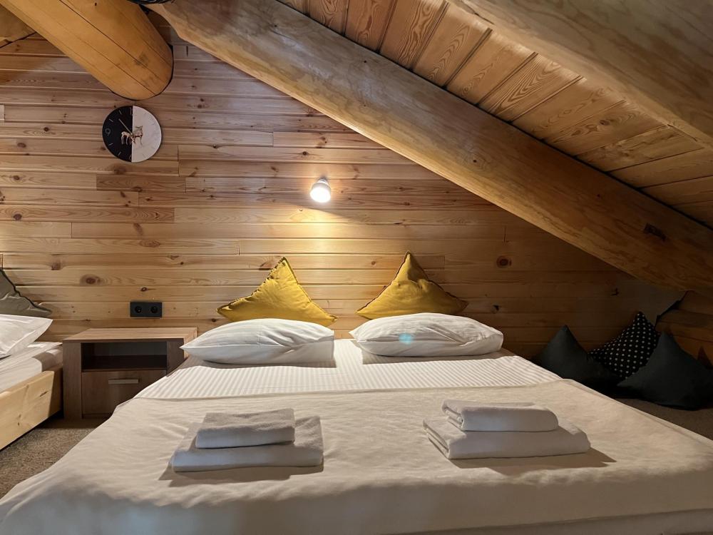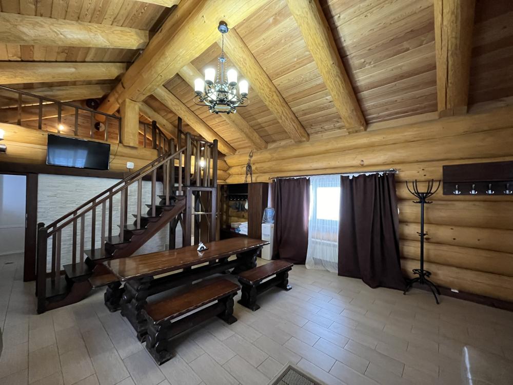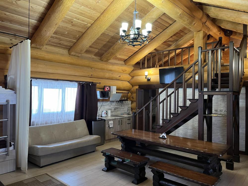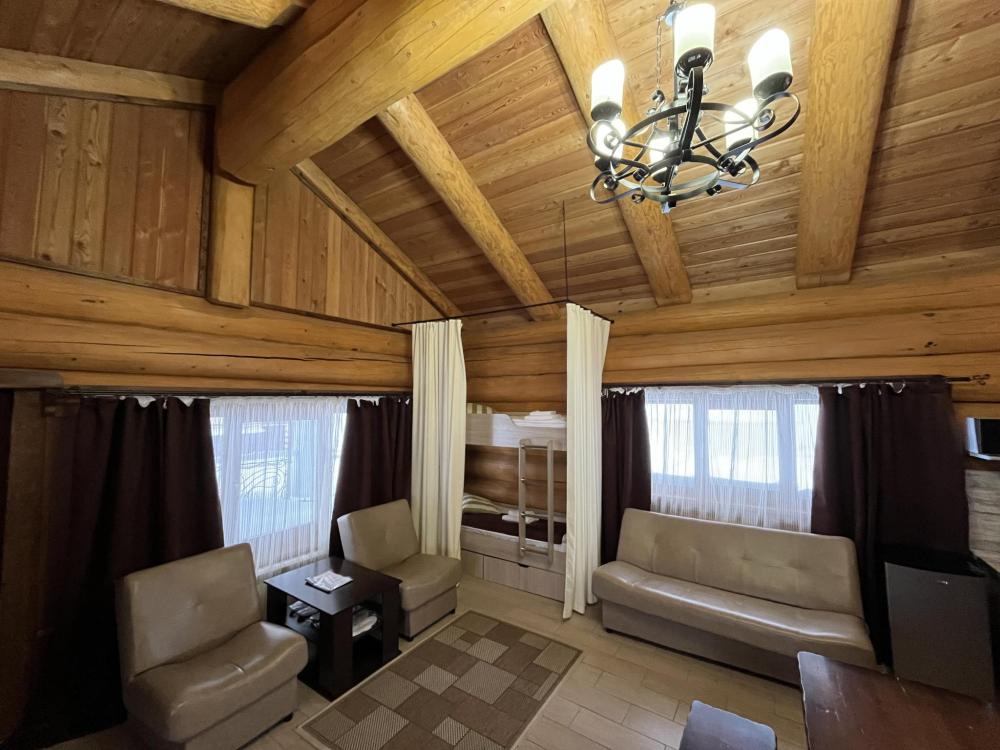 Просторный двухуровневый гостевой дом из сибирского кедра с сауной для отдыха семьей или хорошей компанией. Большая терраса с видом на горы и лес. На первом уровне уютная гостиная с оборудованной кухонной зоной и сауной. ТВ, Wi-Fi, мини-холодильник, мягкая мебель, деревянная мебель, комплекты для сауны. Санузел раздельный: фен, косметические и гигиенические средства, комплект полотенец, халаты, тапочки, полотенцесушитель, зеркало. В номере шесть спальных мест – на первом уровне двухъярусная кровать, на втором уровне две двуспальные кровати. Дополнительные места не предусмотрены.