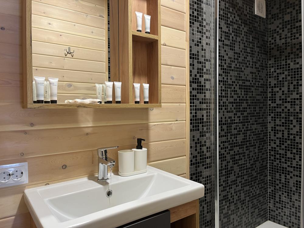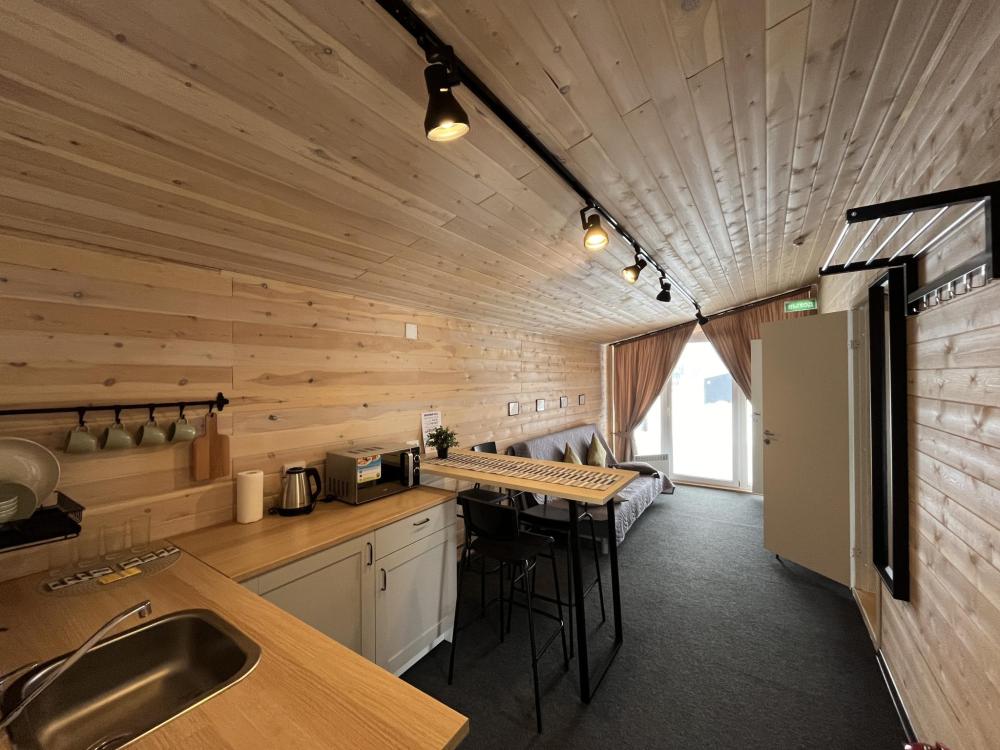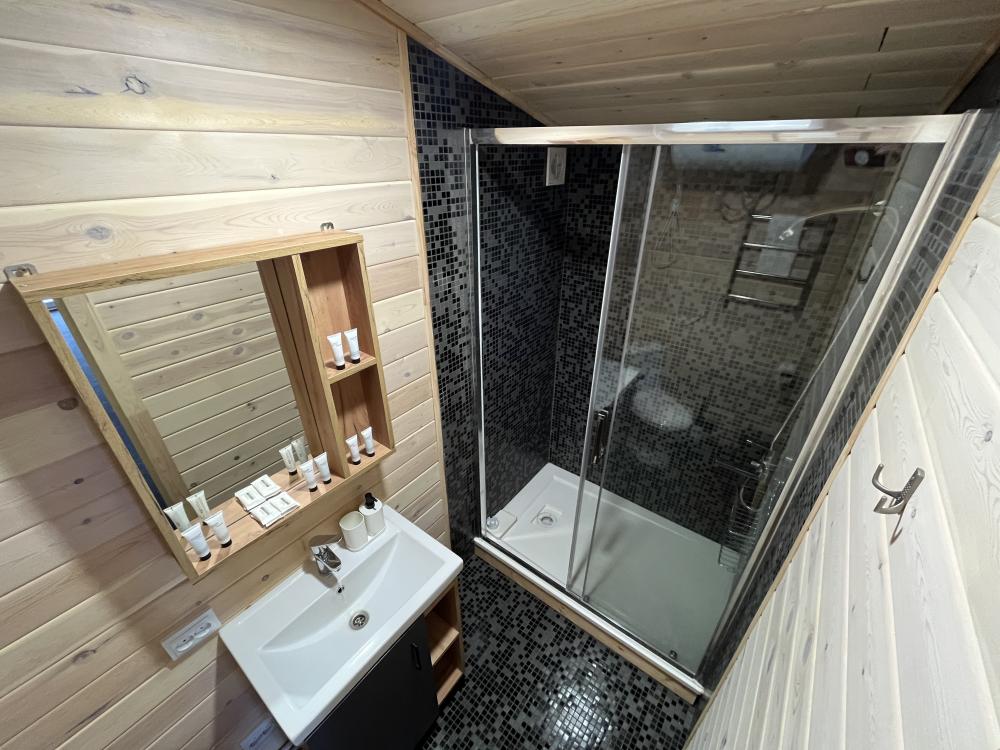 Отдельно стоящий модульный домик с двумя спальнями, гостиной и кухонной зоной для семейного отдыха или небольшой компании. Панорамные окна с видом на лес и горы добавят вашему отдыху нотки романтики. Спальни одной с двуспальной кроватью и двумя односпальными, шкаф для одежды, прикроватные тумбы. Кухонная зона – набор посуды, электрический чайник, микроволновая печь, мини-холодильник, барный стол, стулья. ТВ, Wi-Fi. Санузел совмещенный, душевая кабинка, фен, косметические и гигиенические средства, комплект полотенец, тапочки, полотенцесушитель, зеркало. Дополнительные места не предусмотрены .