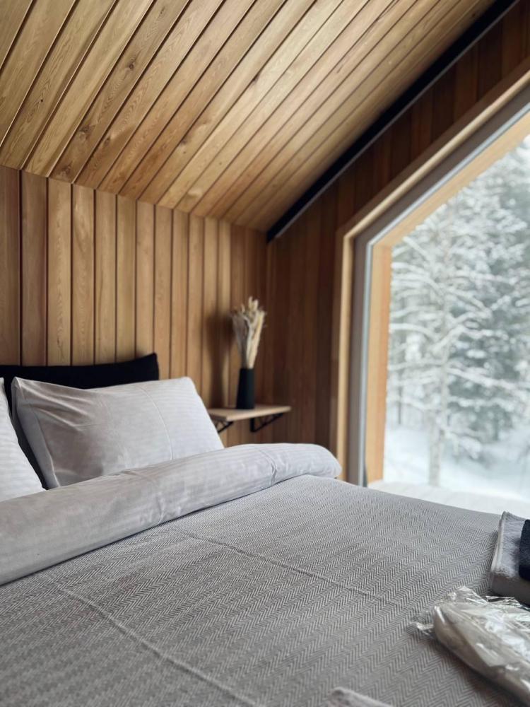 Намного понравился глэмпинг комплекс Зима-Лето. Мы остановились в очень комфортабельных трехкомнатных домиках на четырех человек. Они стильно оформлены и имеют панорамные окна, открывающие прекрасный вид на горы и закат. Расположение комплекса немного возвышается, позволяя насладиться хорошим обзором на окружающую местность. Вай-фай работает стабильно, а в домиках есть удобный душ с непрерывным горячим водоснабжением. Одним из больших плюсов является удаленность гостиницы от остальных кластеров, что позволяет настояще отдохнуть в тишине. На самом деле, эта гостиница является первой при въезде в Шерегеш, а не последней. Она расположена возле трассы Панорама, после сектора Е. До продуктового квартала можно доехать за 3 минуты на машине. В комплексе также есть снегоходная школа с самым большим парком снегоходов в аренду. Есть также баня - просторный деревянный дом из брусьев. Кафе на территории отсутствуют, но это не проблема, потому что после активного дня на горе можно без проблем заказать еду к домику. В домиках имеются чайник, холодильник, микроволновка и посуда. Кроме того, в каждом домике есть большое помещение с полками для хранения лыж и обуви, поэтому не нужно искать, где это все разместить.