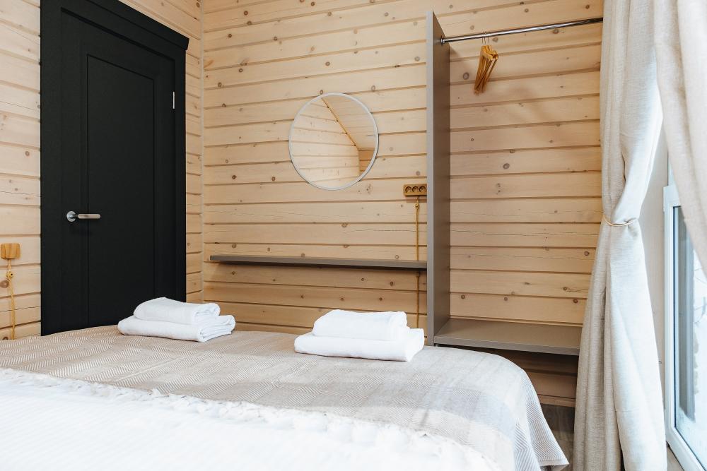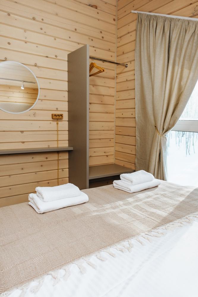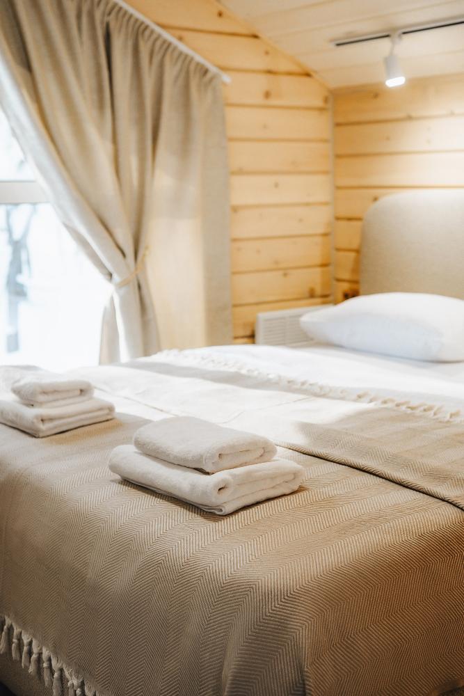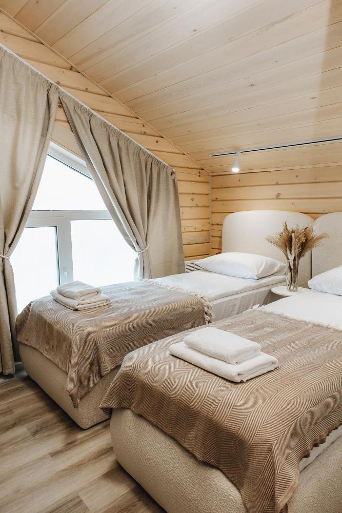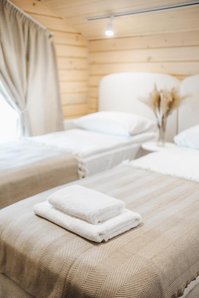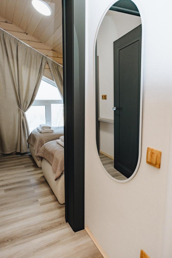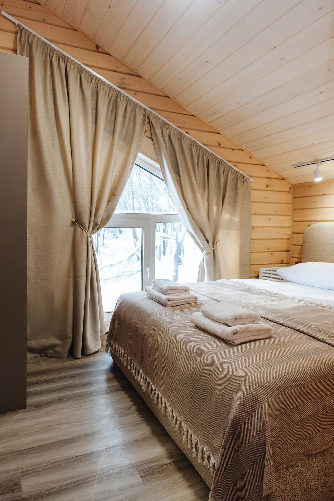 В входной группе расположена гардеробная зона в которой есть: стиральная машина, сушилки для обуви. На первом этаже расположены: солнечная гостиная, обеденная зона с большим столом, площадью 50кв2м, выполненная в светлых тонах, 2 стильных дивана, которые при необходимости легко трансформируется в спальные места, огромный телевизор диагональ 85 дюймов, колонка Алиса. Просторная кухонная зона оснащена современной техникой имеются все необходимые мелочи. Для комфортного отдыха и вкусных блюд кухня оснащена: духовой шкаф; большая варочная панель; микроволновая печь; посудомоечная машина; большой холодильник; чайник; СВЧ печь; кофемашина; тостер; столовые приборы и посуда. Полноценный санузел. На второй этаж ведет лестница с подсветкой. На втором этаже расположены: 4 спальни мансардного типа с панорамным видом. Эргономичная мебель и дизайнерский интерьер создают атмосферу спокойствия и релаксации. Белоснежное постельное белье и мягкие полотенца премиального качества. 2 полноценных ванных комнаты.