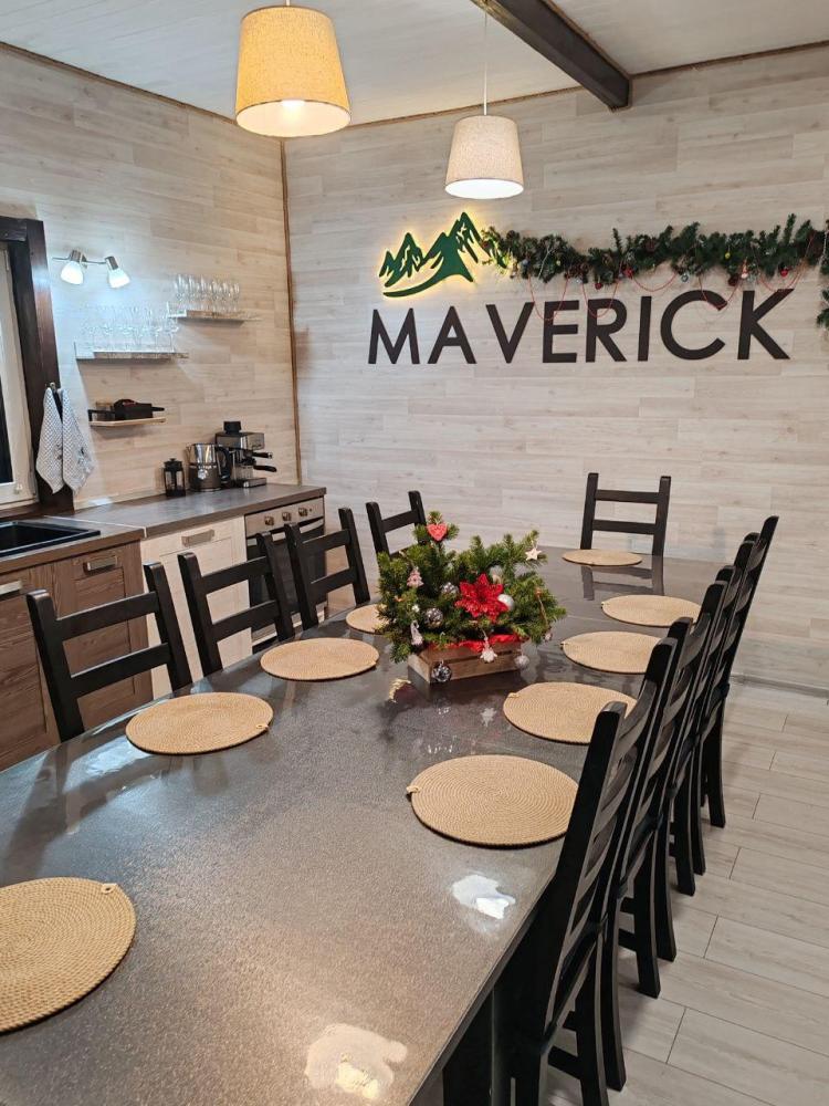 Маверик Дом 1 — 160 м², 2 этажа, до 14 человек. Просторная прихожая с сушилкой для лыж и ботинок. Кухня-гостиная: холодильник, плита, духовка, мультиварка, микроволновка, посудомоечная машина, кофеварка, полный набор посуды и бокалов. Чай, кофе, соль и сахар — всегда в наличии. 2 гостиные (1 и 2 этаж) с раскладными диванами, TV, аэрохоккеем, Xbox, настольными играми, колонкой и светомузыкой. 5 спален с двуспальными кроватями (в одной — доп. диван-кровать), детская кроватка. 2 санузла с душевыми кабинами, стиральной машиной, полотенцами, феном, гелем для душа, шампунем и мылом. Wi-Fi, подписка Кинопоиск, подогрев пола.