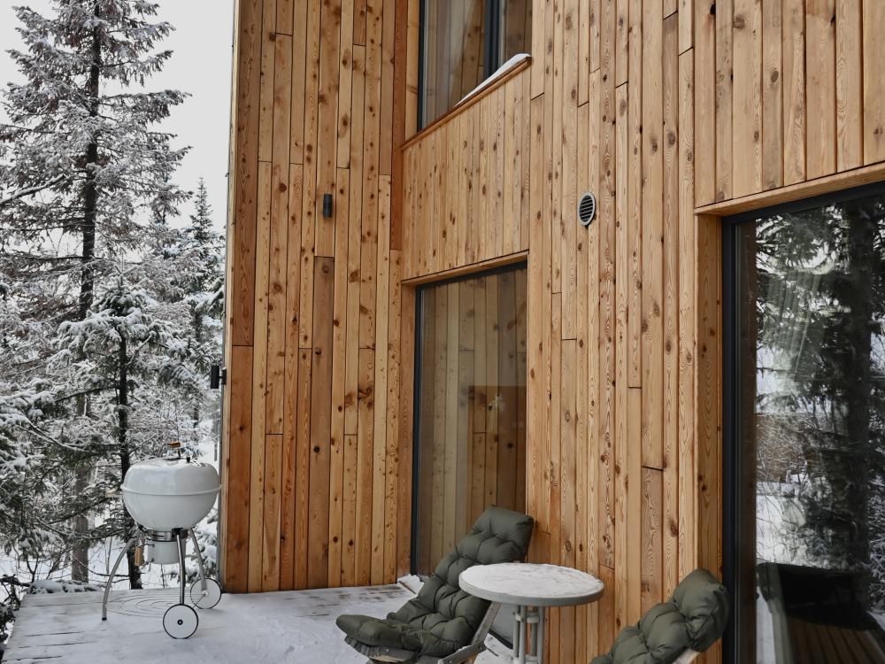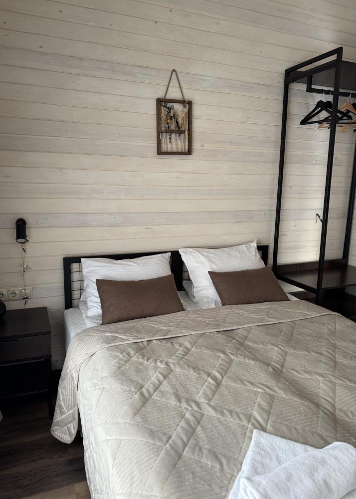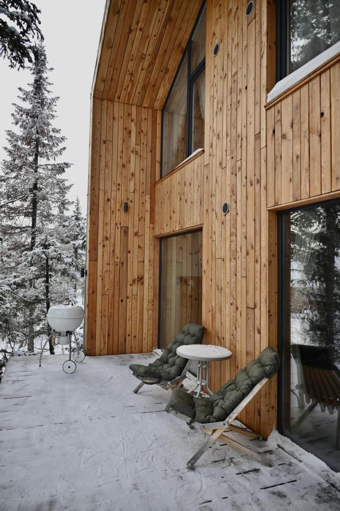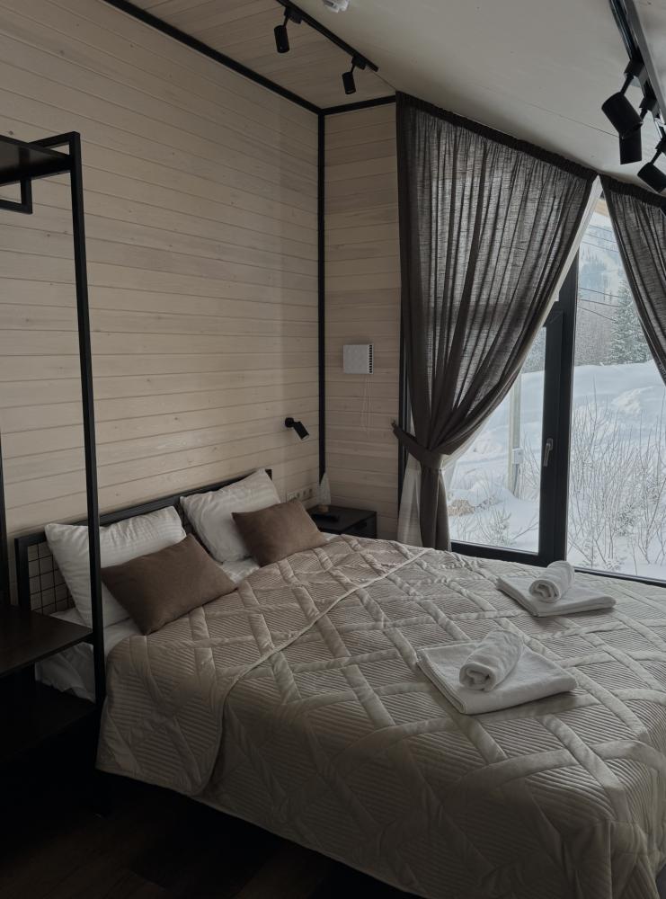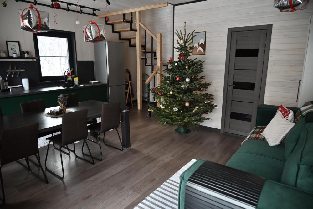 Современный комфортабельный двухэтажный гостевой дом на 6 гостей, построен в стиле барнхаус. Панорамное остекление с видом на лес. Отдельный вход. В доме две раздельные спальни с двухспальными кроватями 160*200. Два санузла с душевыми и стиральной машиной. Косметика для душа и белоснежные полотенца для каждого гостя. На первом этаже расположена гостиная с раскладным диваном и большим телевизором с функцией SmartTV, кухня, оборудованная бытовой техникой и посудой. Сушка для горнолыжных ботинок. Собственная терраса с шезлонгами.