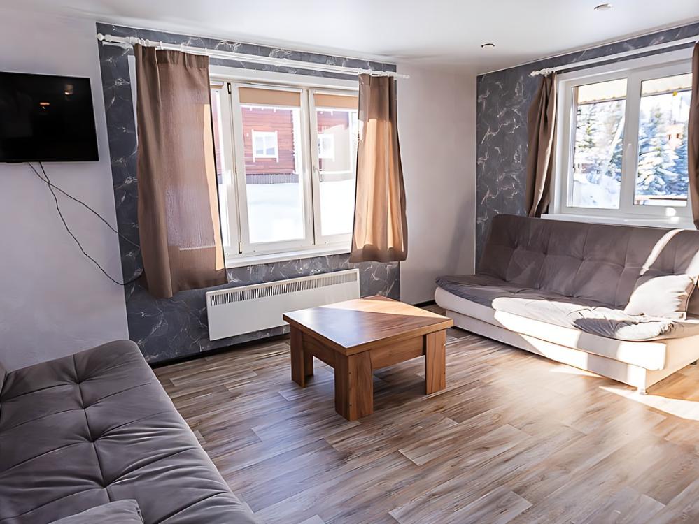 Благоустроенный двухэтажный коттедж. 1 этаж: полностью оснащенная кухня (варочная панель, духовой шкаф, микроволновая печь, холодильник, блендер, посудомоечная машина, стиральная машина, набор посуды). Зона гостиной с большим столом и современным телевизором, раскладной диван (2 спальных места), просторный санузел с раковиной, унитазом и душевой кабиной. 2 этаж: 2 спальни с двуспальными кроватями, 1 спальня с односпальной кроватью и диван на 2 человека. Санузел с раковиной и унитазом. Отопление от электро котла на первом этаже теплый пол на втором батареи. Суммарно предусмотрено 9 спальных мест. Wi-fi, мощная беспроводная колонка. Депозит: 10000 рублей.