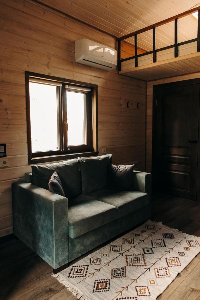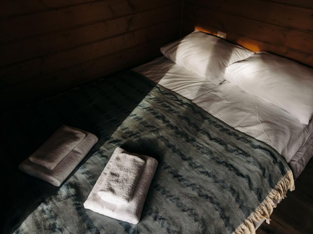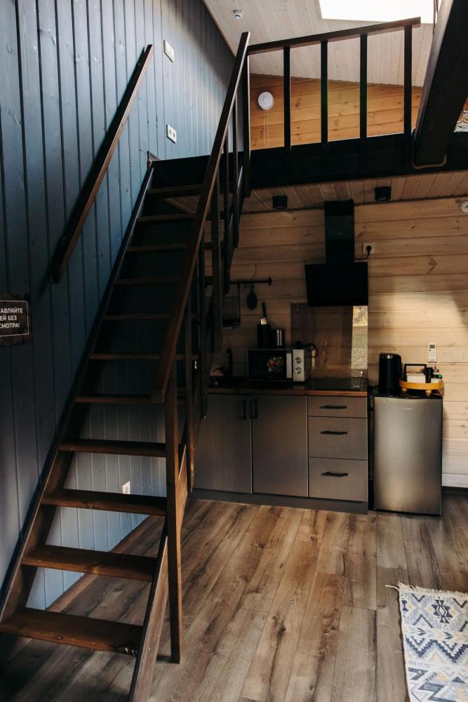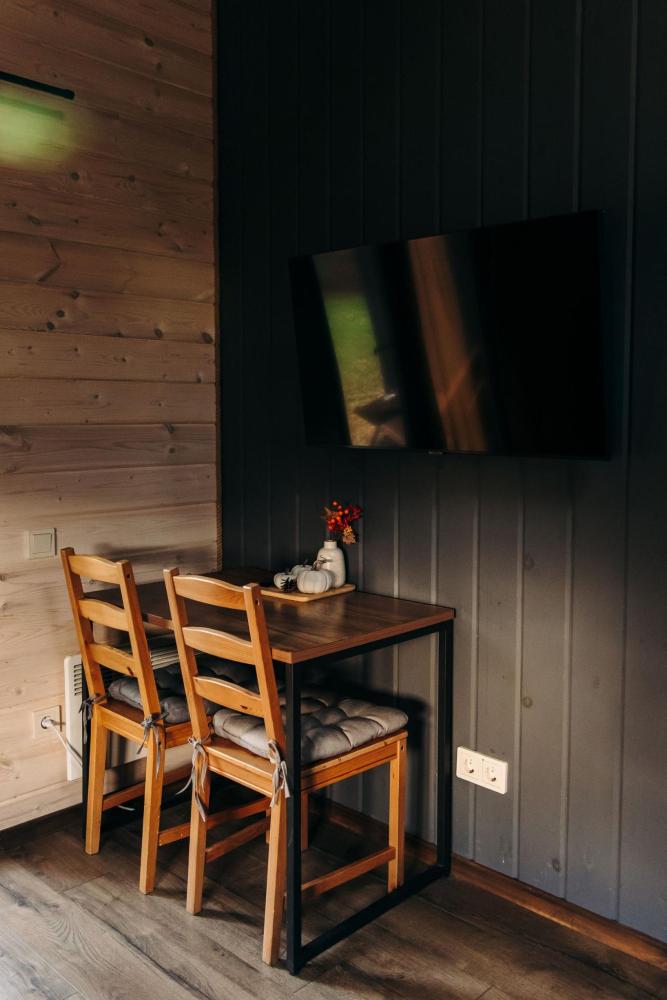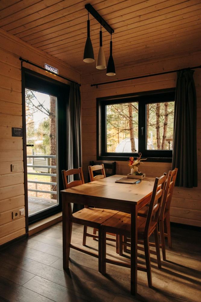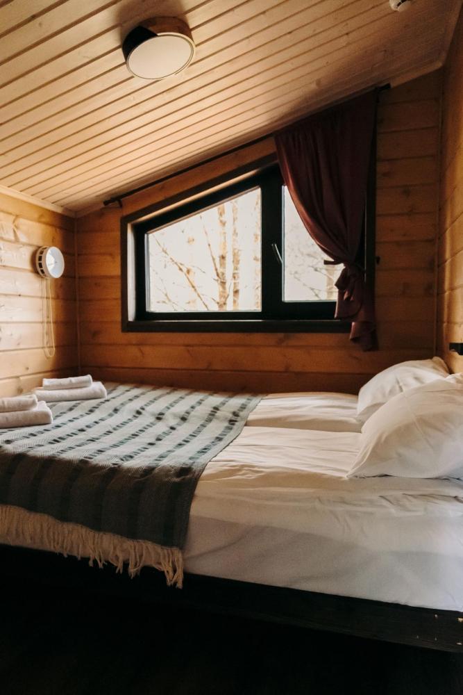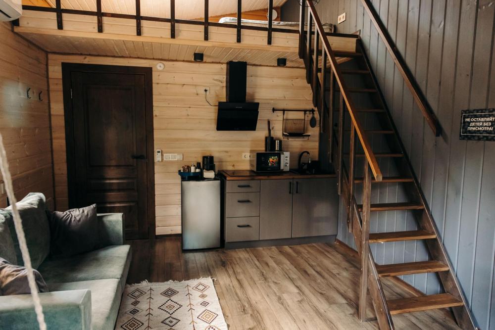 Домики оснащены всем необходимым для комфортного отдыха. В них есть мини-кухня с посудой, плитой, чайником и холодильником, собственная ванная комната с душем, телевизор, обогреватель.
