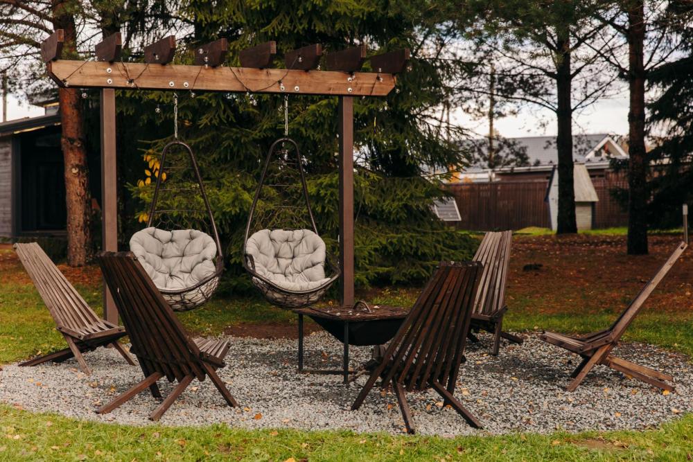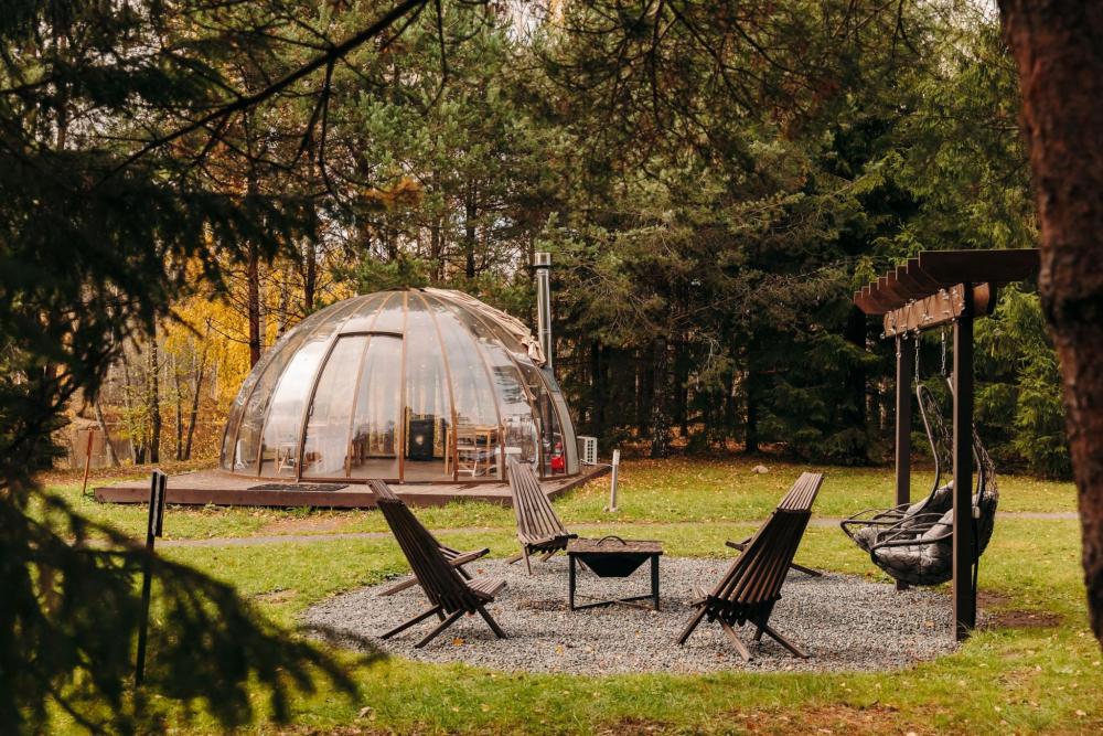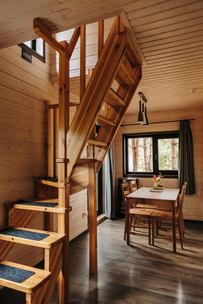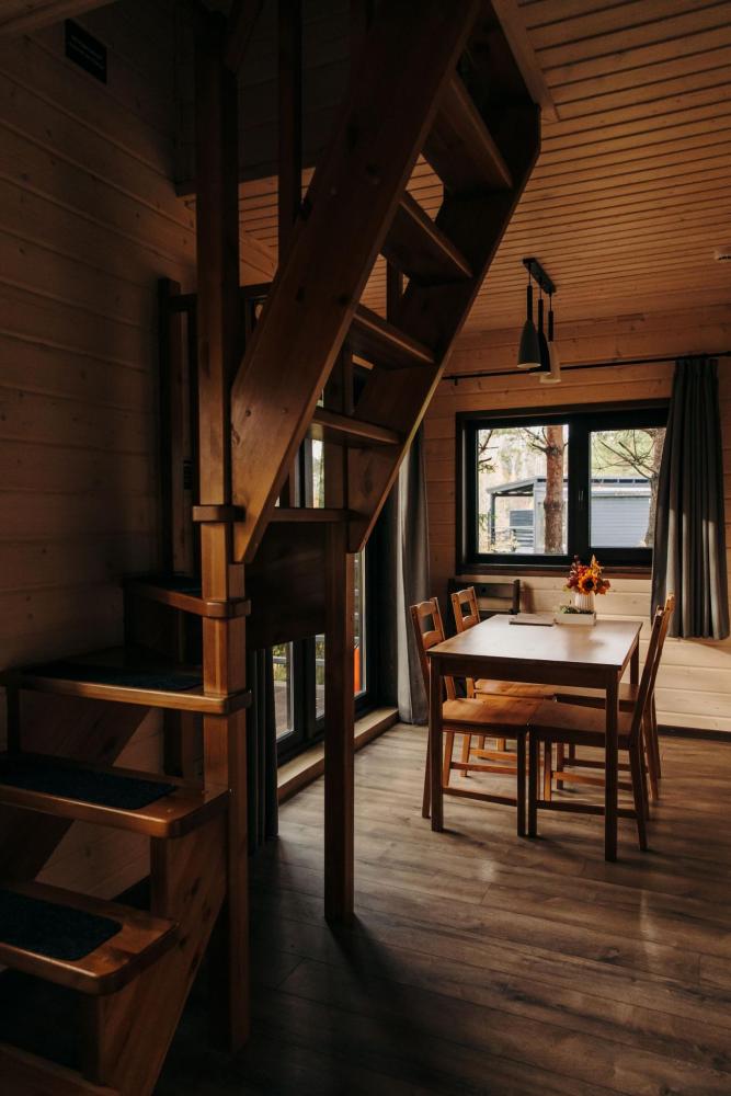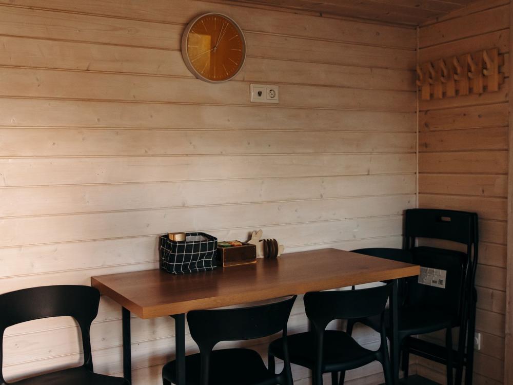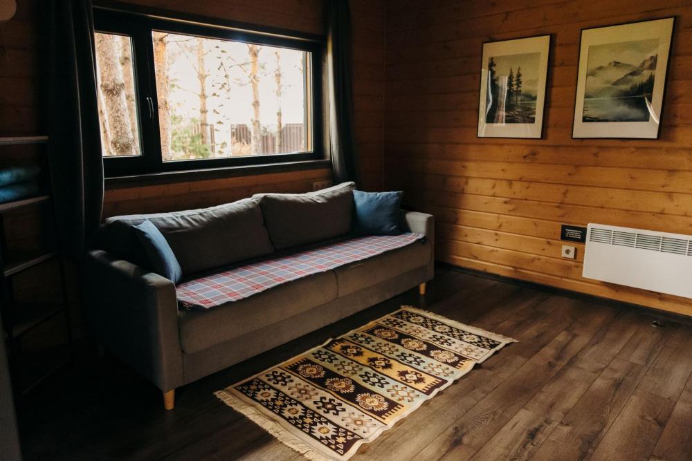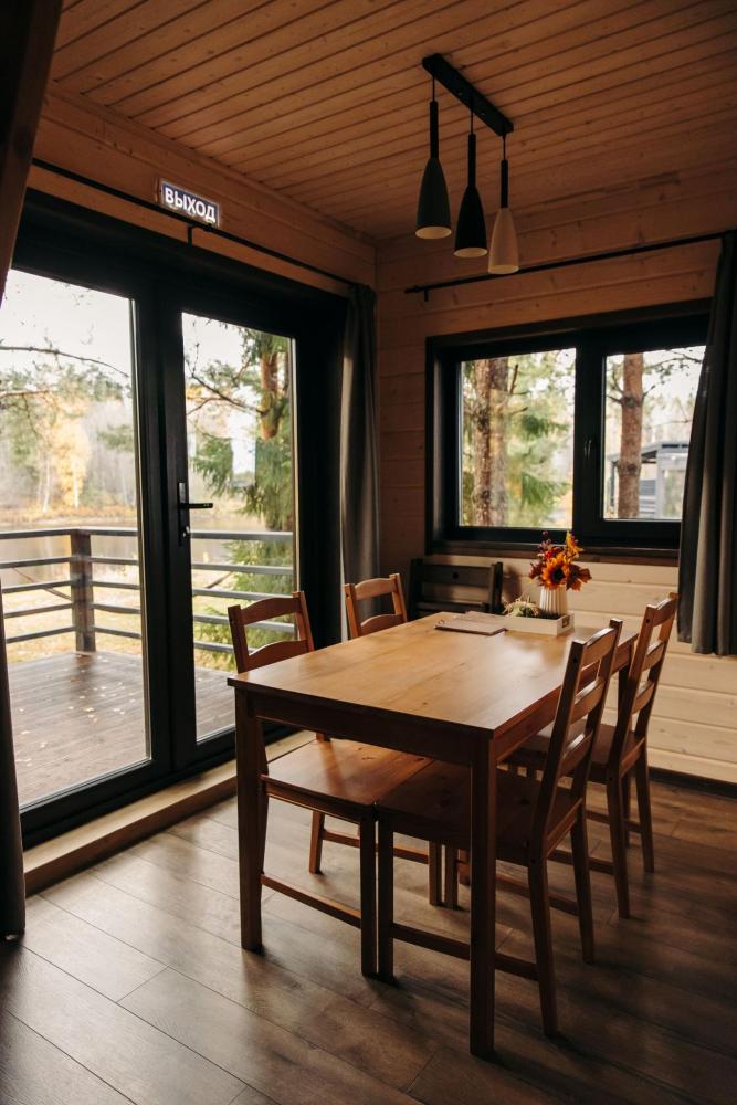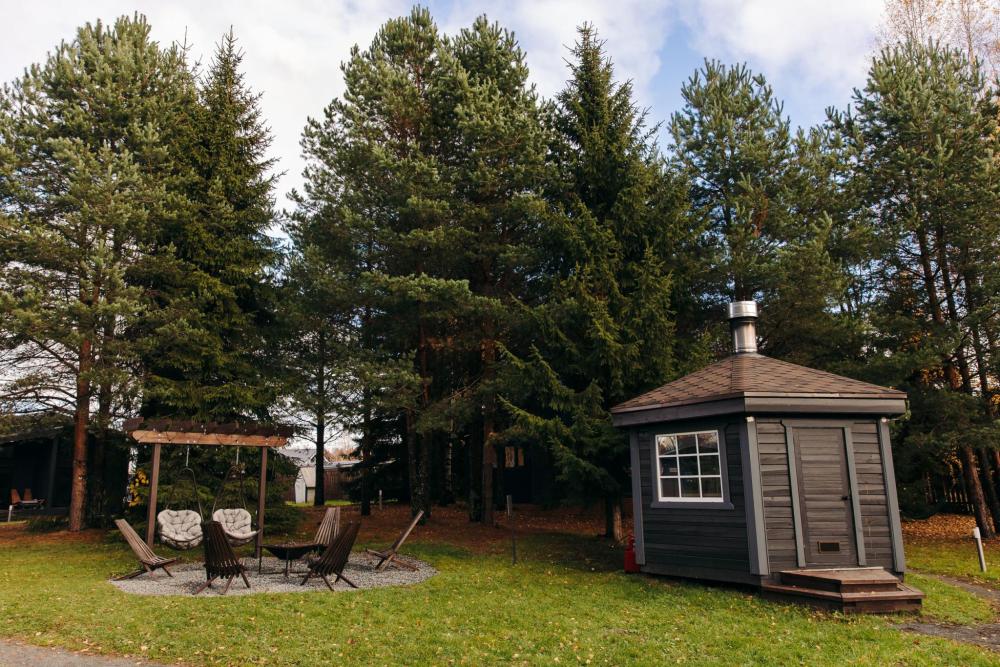 Домики оснащены всем необходимым для комфортного отдыха. В них есть мини-кухня с посудой, плитой, чайником и холодильником, собственная ванная комната с душем, телевизор, обогреватель.