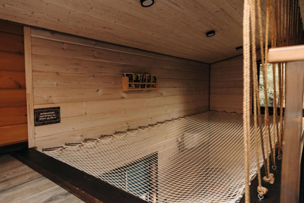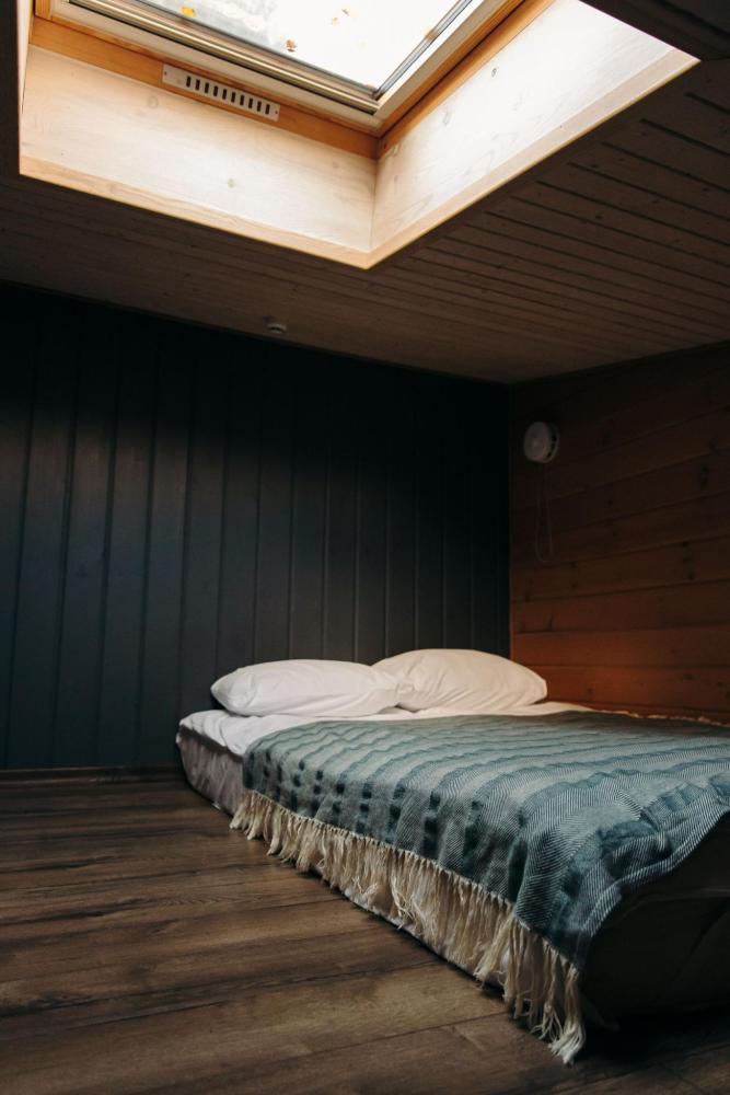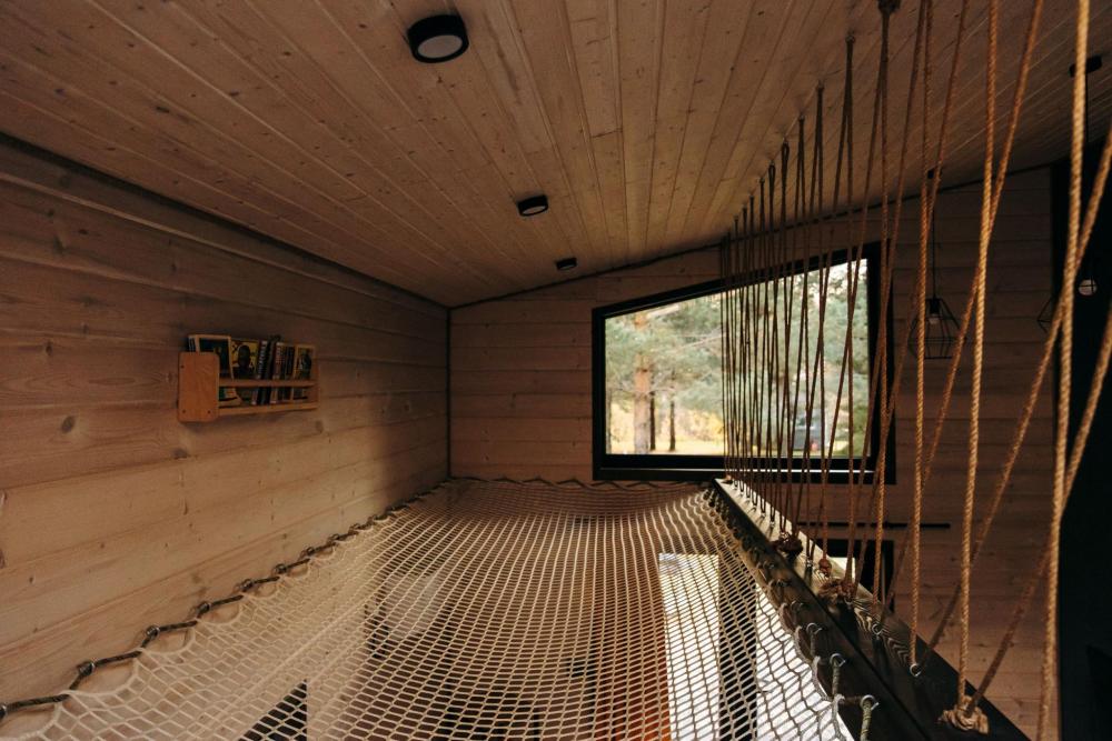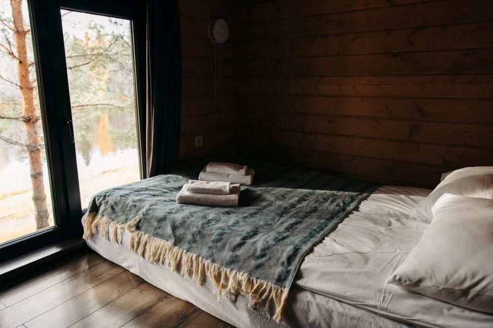 · Две спальни с двуспальными высокими матрас-кроватями на втором этаже с видовыми окнами в пол на лес и реку
