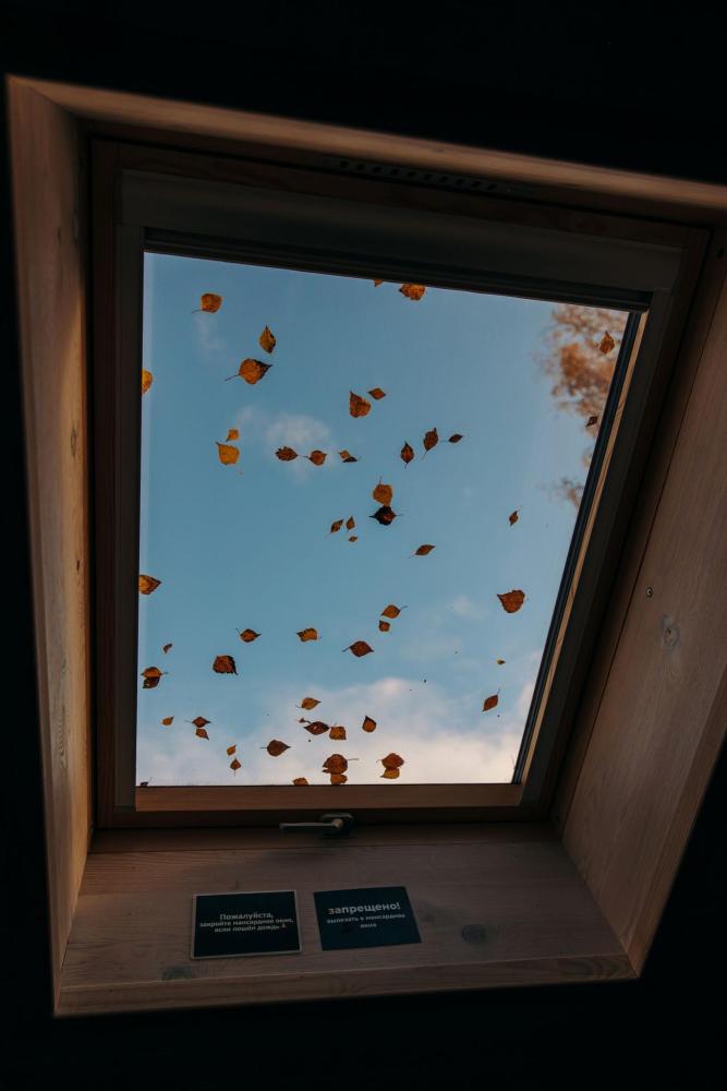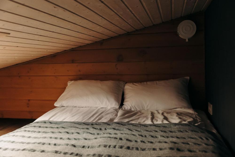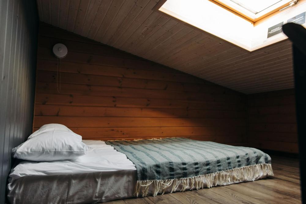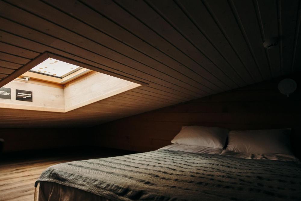 · Спальное место в лофте с мансардным окном и видом на небо и деревья