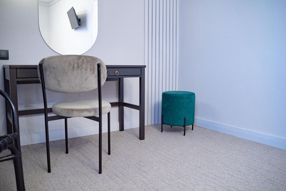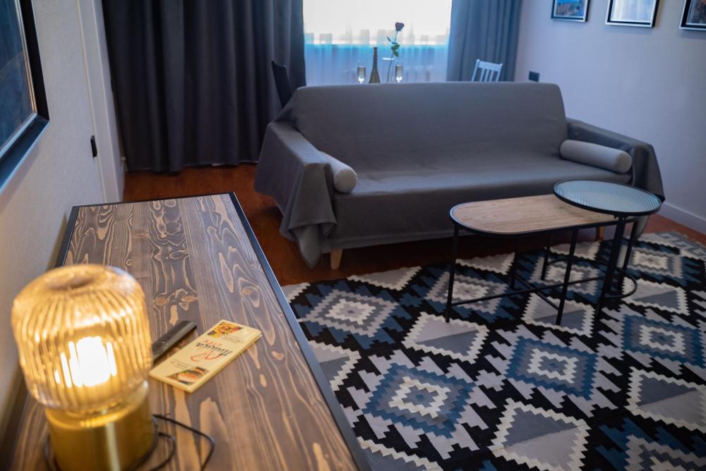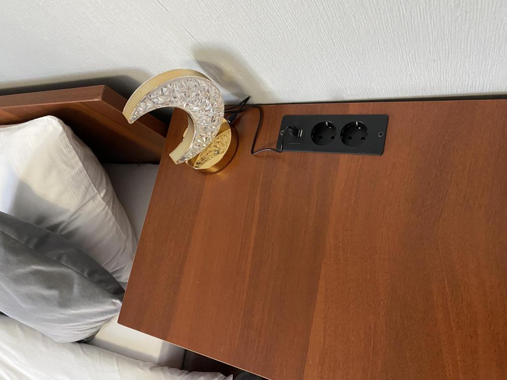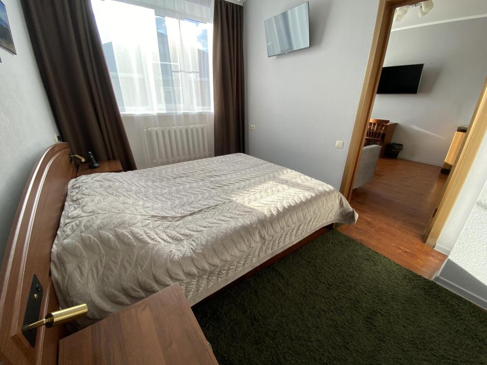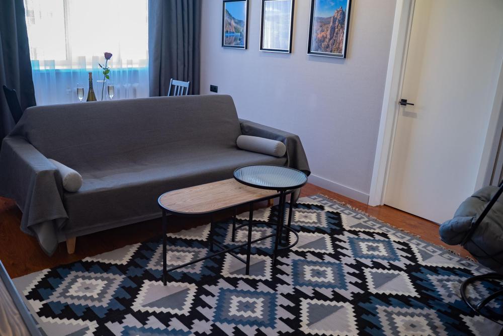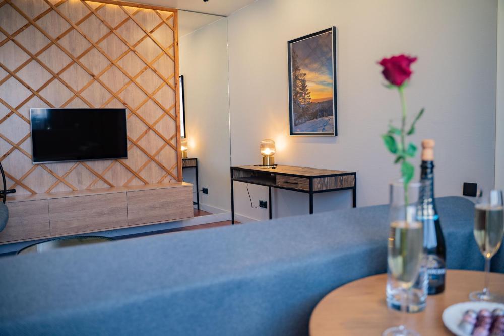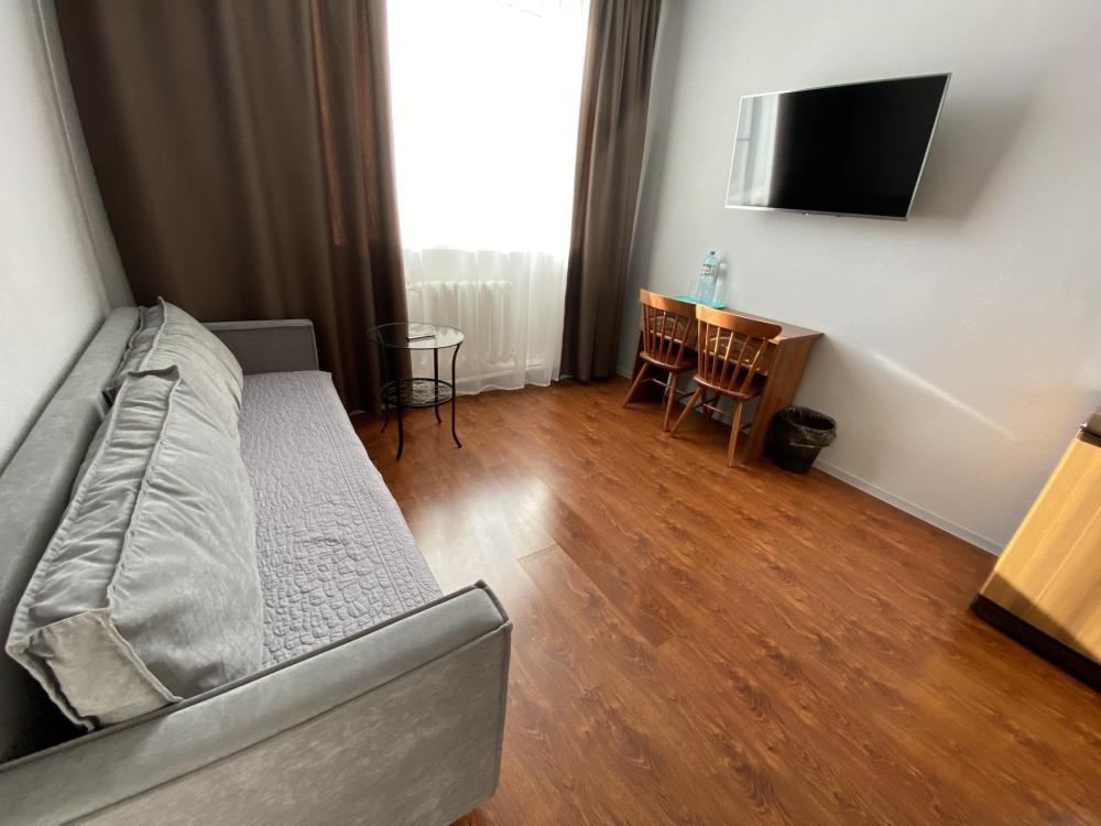 Номер полулюкс представляет собой двухкомнатный номер с одной большой кроватью в спальне и раскладным диваном в гостинной. В каждой комнате предусмотрен смарт ТВ с подключенными платными каналами. А также в номере есть рабочий стол, макияжный стол, холодильник, чайник с чашками, умная колонка Алиса, кондиционер, фен, душевая кабинка.