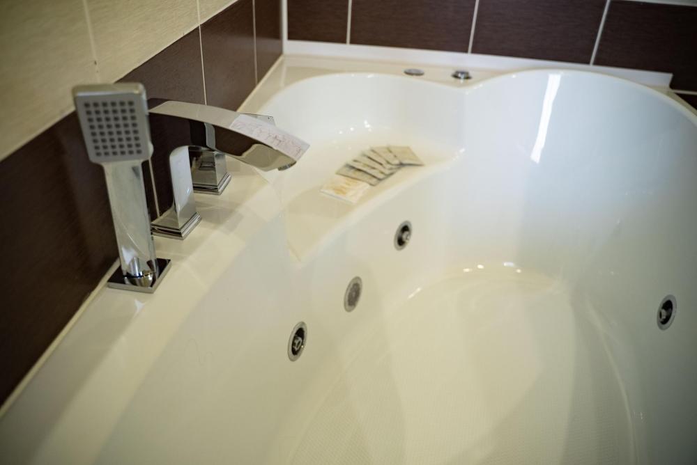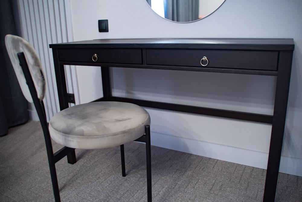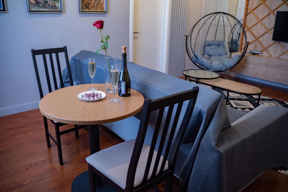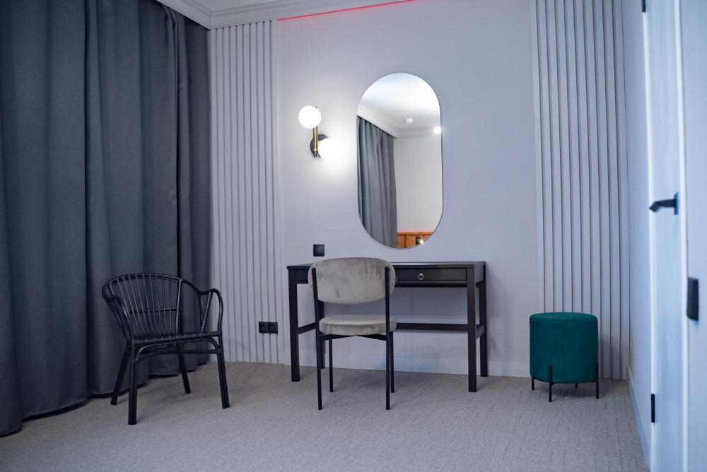 В спальне расположена двухспальная кровать, макияжный стол, смарт ТВ, умная колонка Алиса, на полу - ковровой покрытие, плотные шторы, красивая подсветка. В гостинной есть раскладной диван, качели, рабочий стол, кухонный стол, журнальный столик. Также номер оборудован: джакузи, феном, кондиционером, СВ печью, чайником с чашками и посудой, холодильником. В номере есть халаты, тапочки, косметические средства.