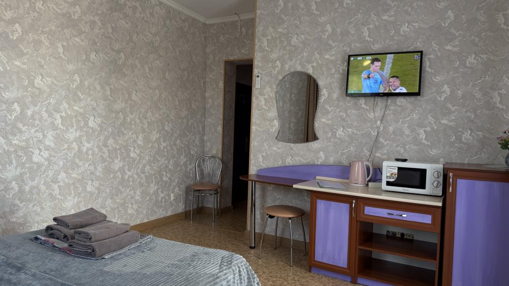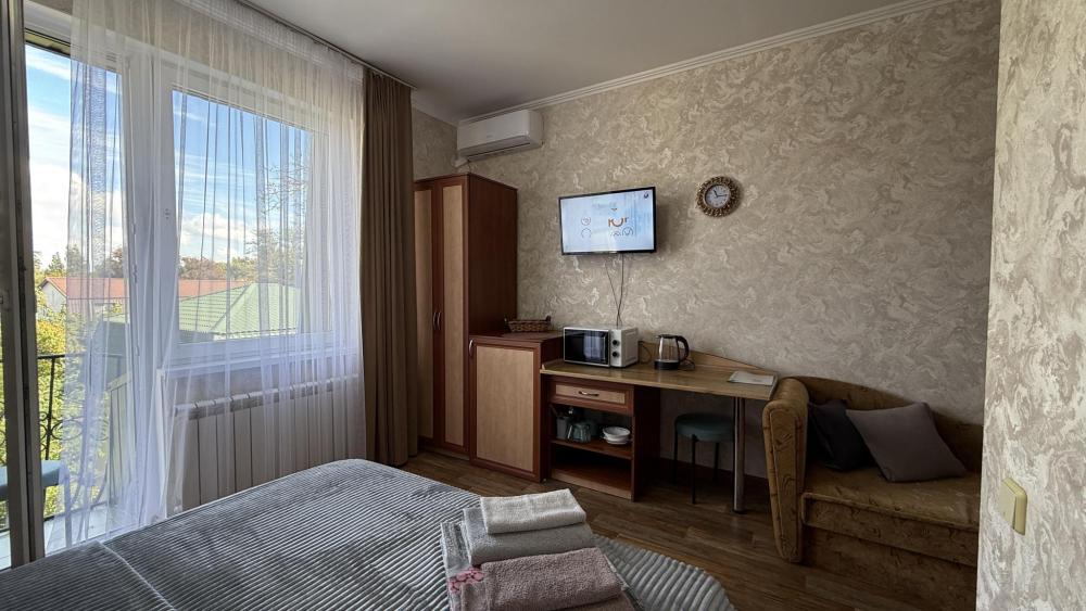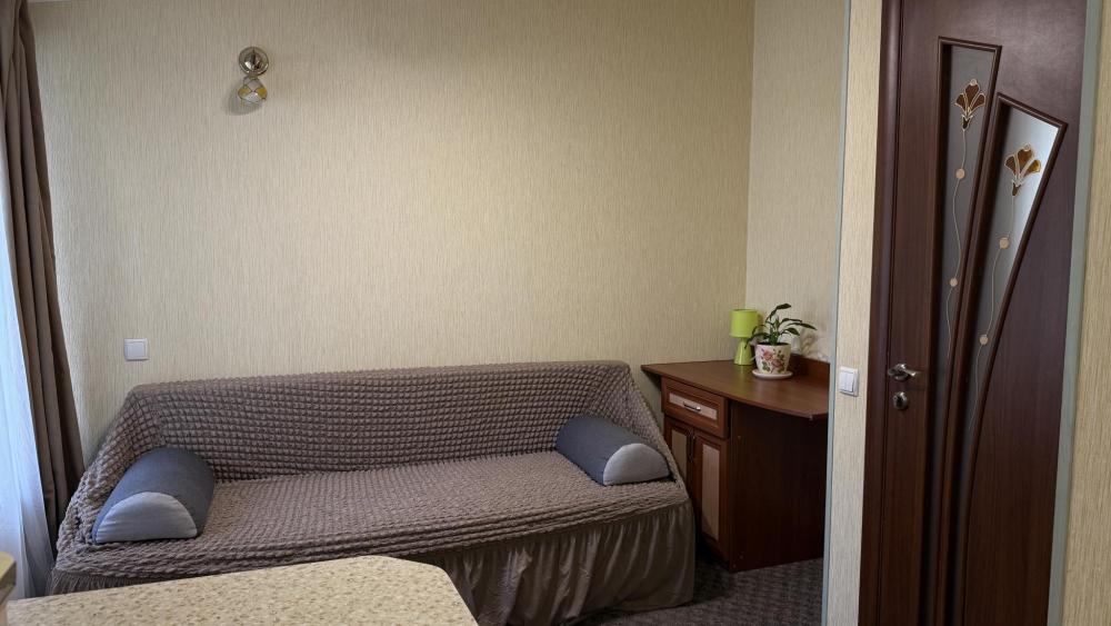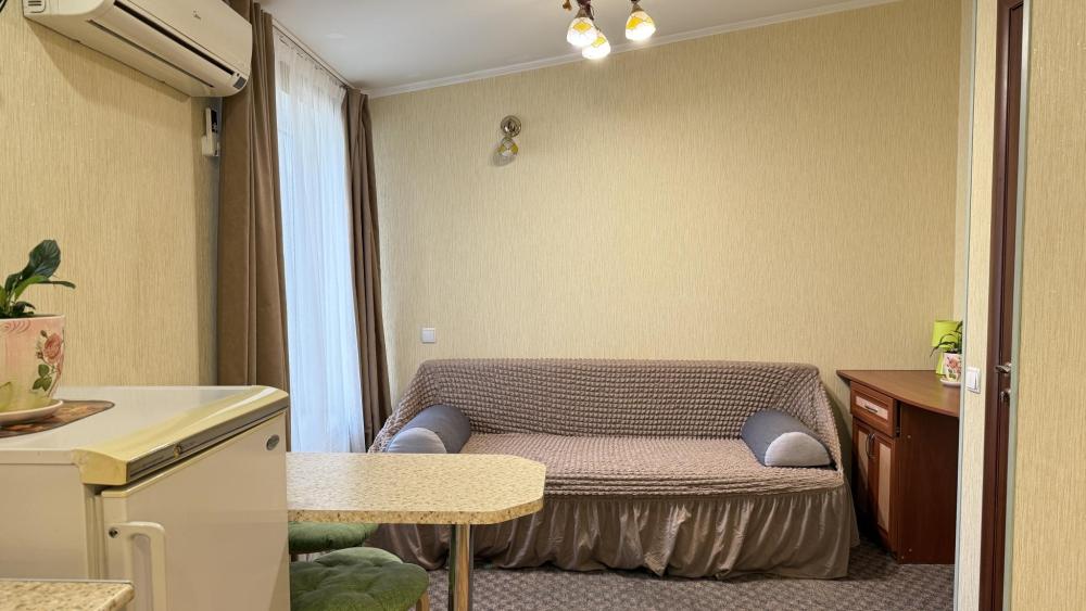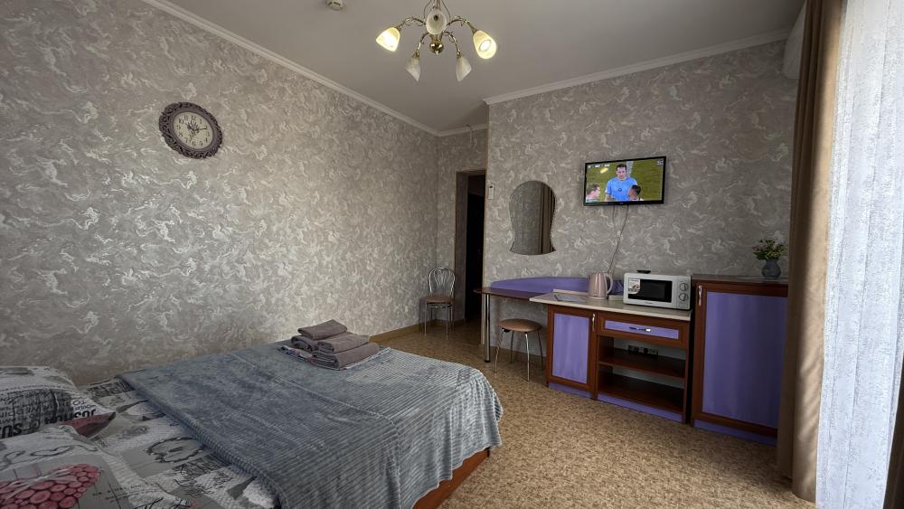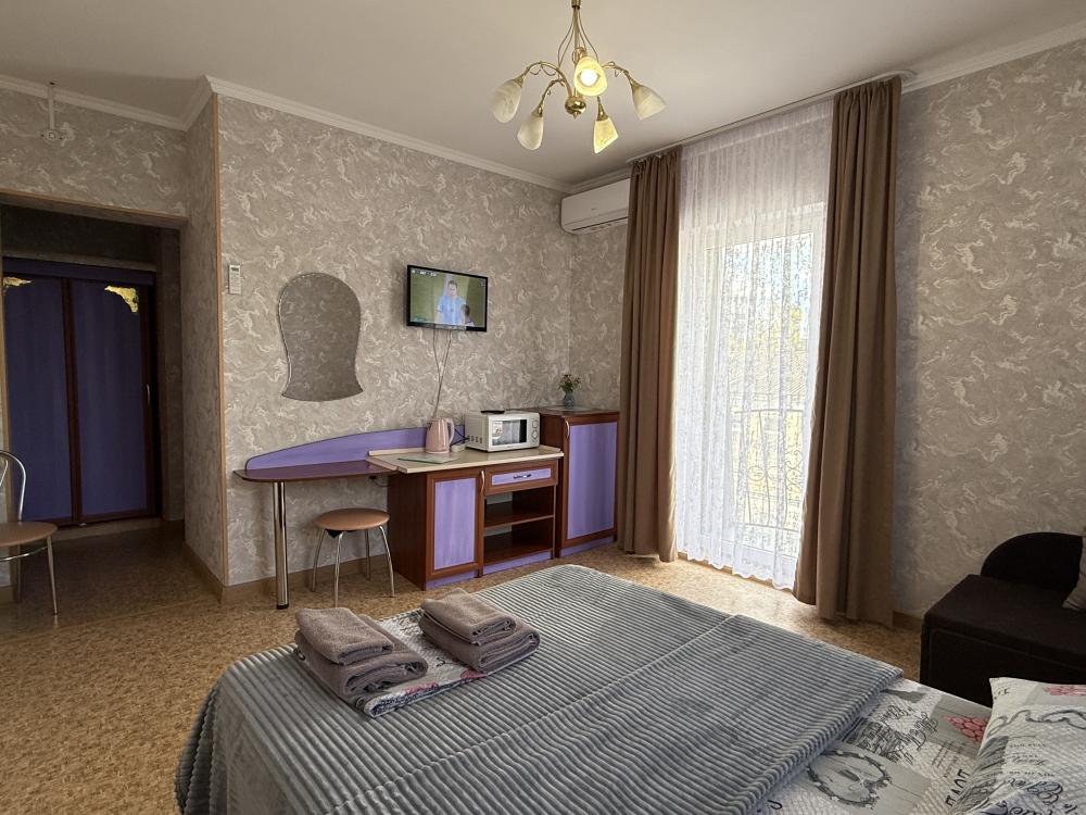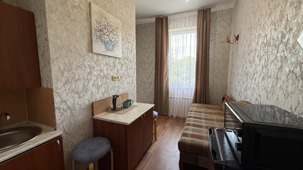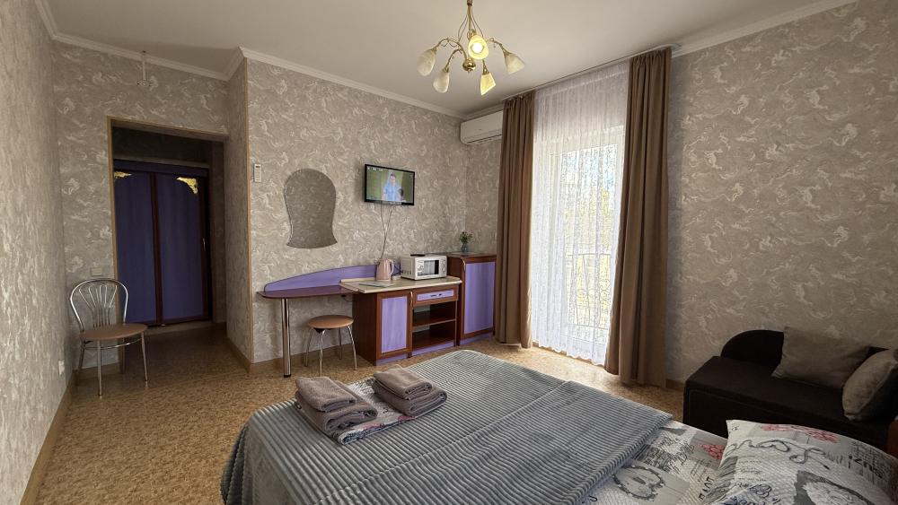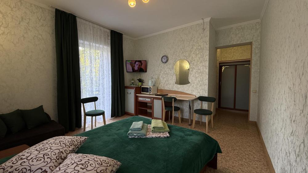 Удобный номер для комфортного проживания вдвоем и + одно дополнительное место. Кухонная зона имеет все необходимое: холодильник, встроенная электроплита, микроволновая печь, электрочайник, мультиварка (по требованию), посуда, стаканы, чашки, фраже на каждого проживающего гостя. Предоставляется чистый комплект белья, полотенец. Номер оборудован кондиционером. Санузел с современной душевой. Подача горячей и холодной воды бесперебойная. WI-FI, ТV. Преимущества: Дополнительное место- диван со спинкой .