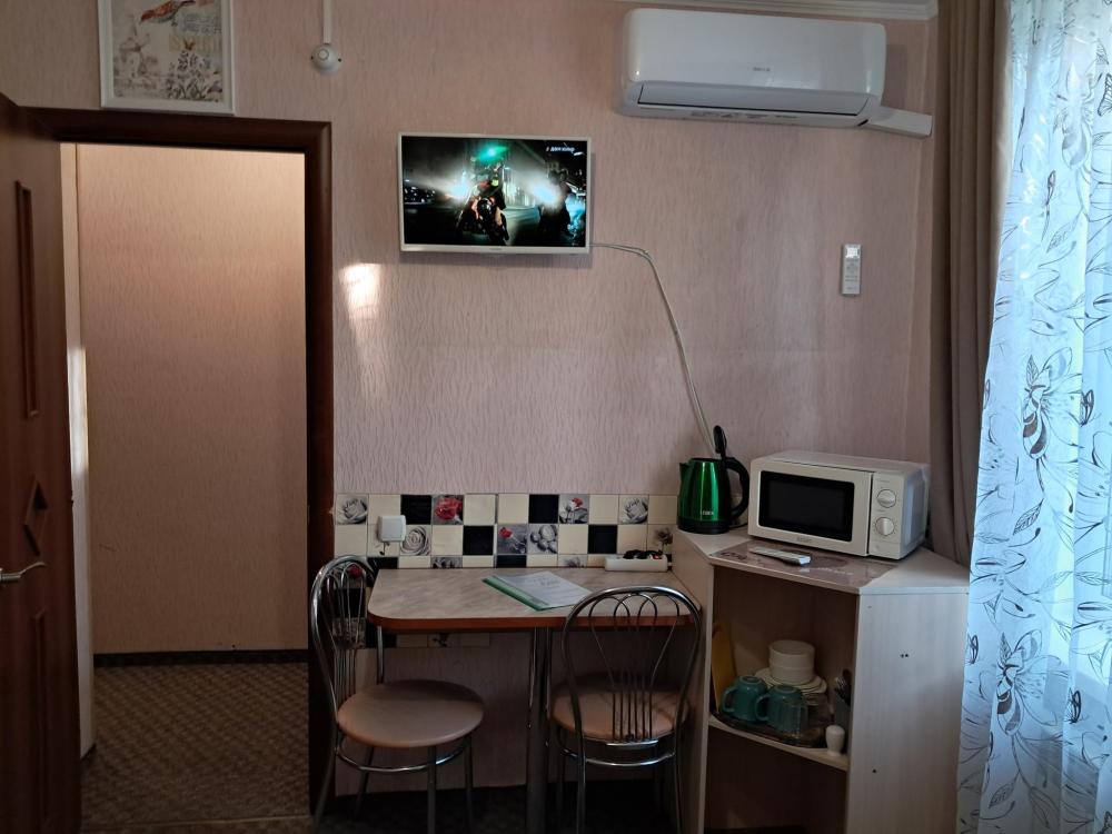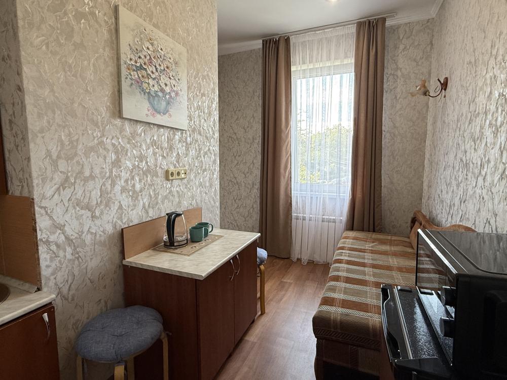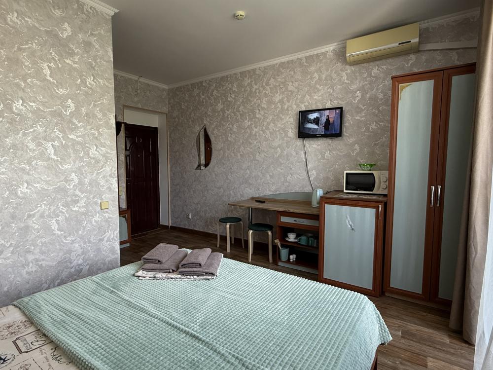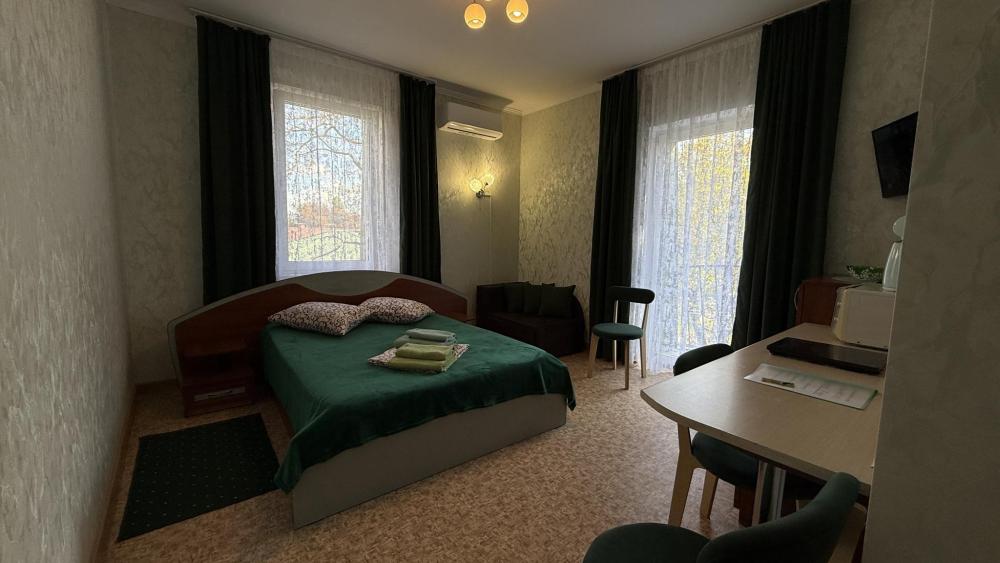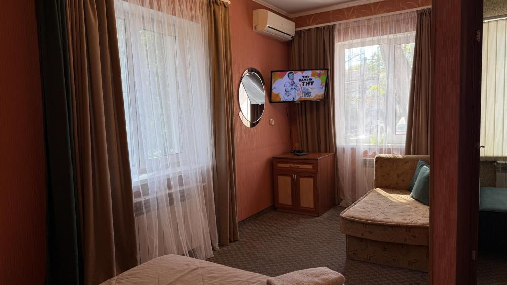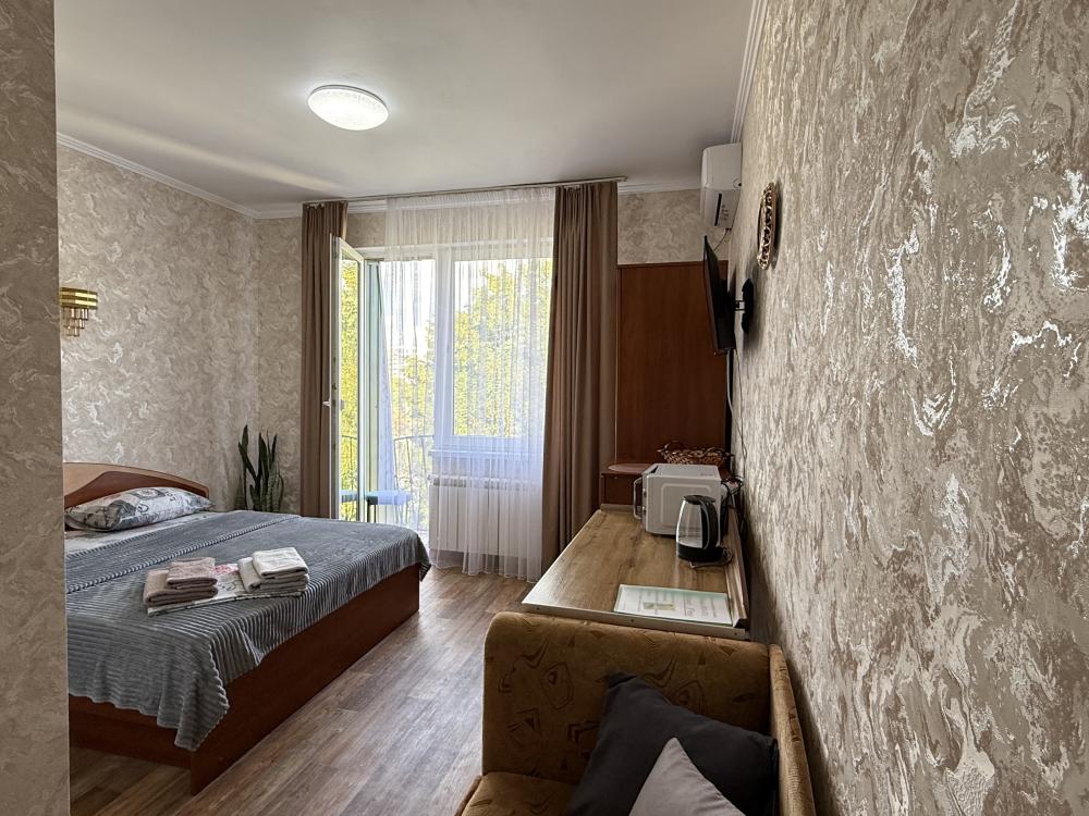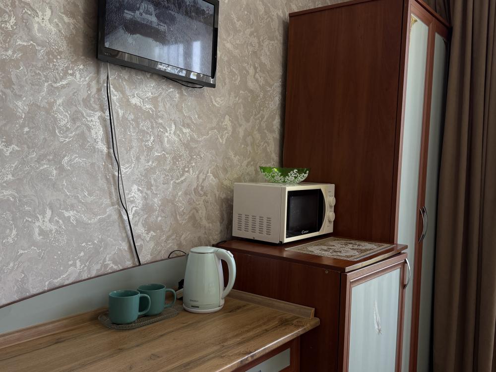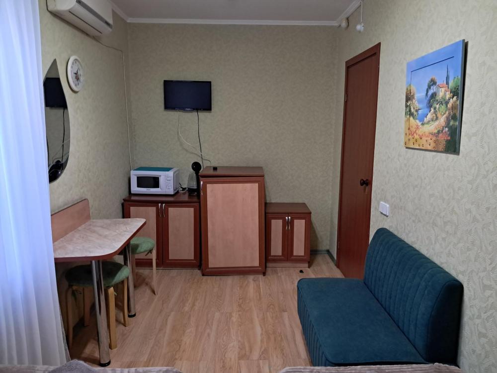 Удобный номер для комфортного проживания вдвоем и + одно дополнительное место. Кухонная зона имеет все необходимое: холодильник, встроенная электроплита, микроволновая печь, электрочайник, мультиварка (по требованию), посуда, стаканы, чашки, фраже на каждого проживающего гостя. Предоставляется чистый комплект белья, полотенец. Номер оборудован кондиционером. Санузел с современной душевой. Подача горячей и холодной воды бесперебойная. WI-FI, ТV. Преимущества: Дополнительное место- диван со спинкой .