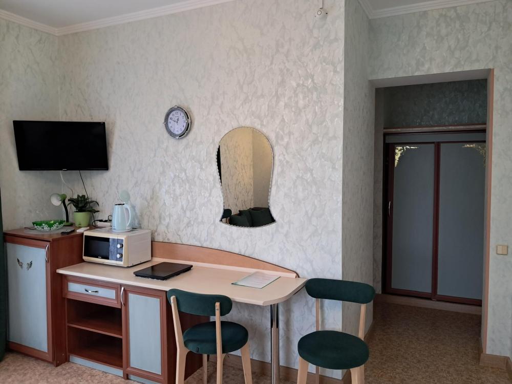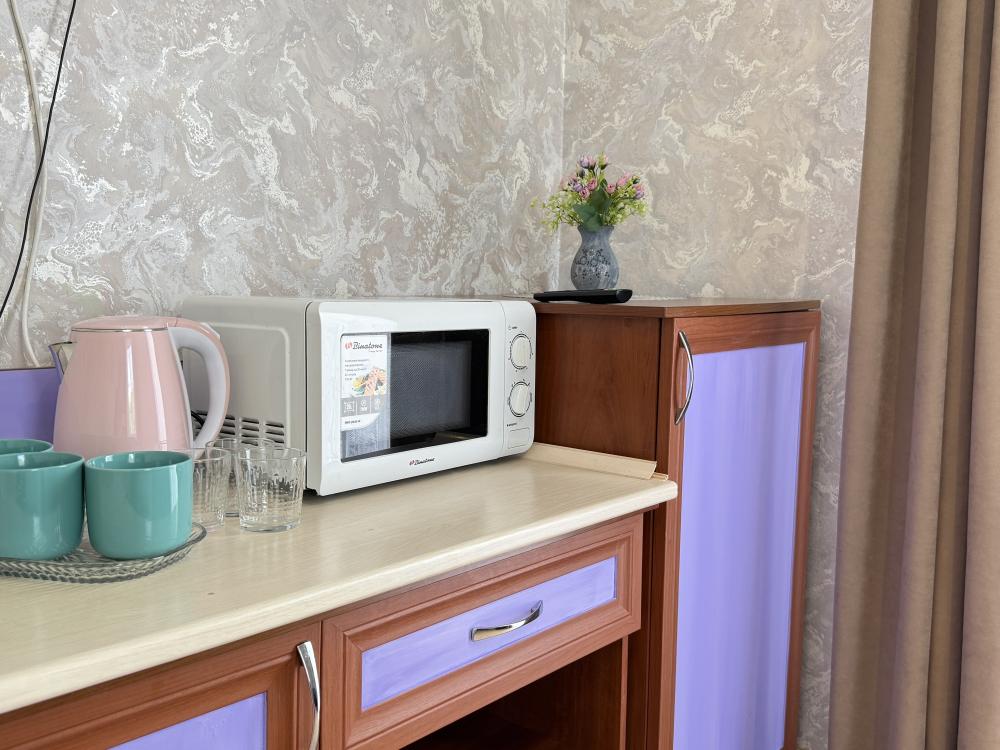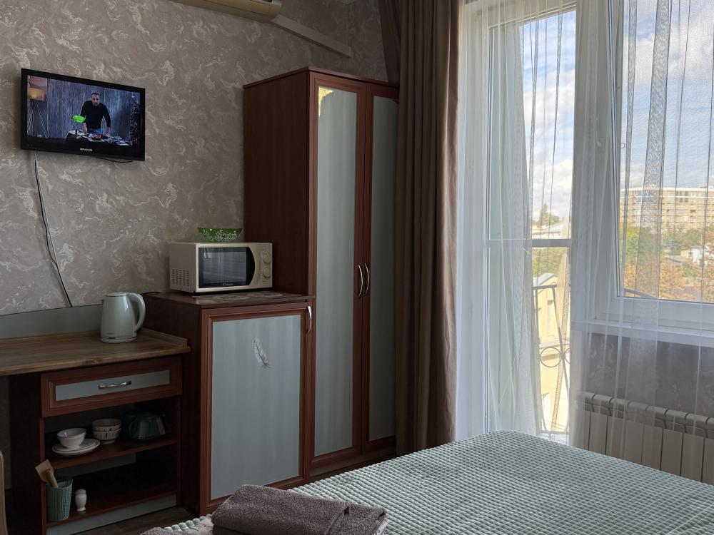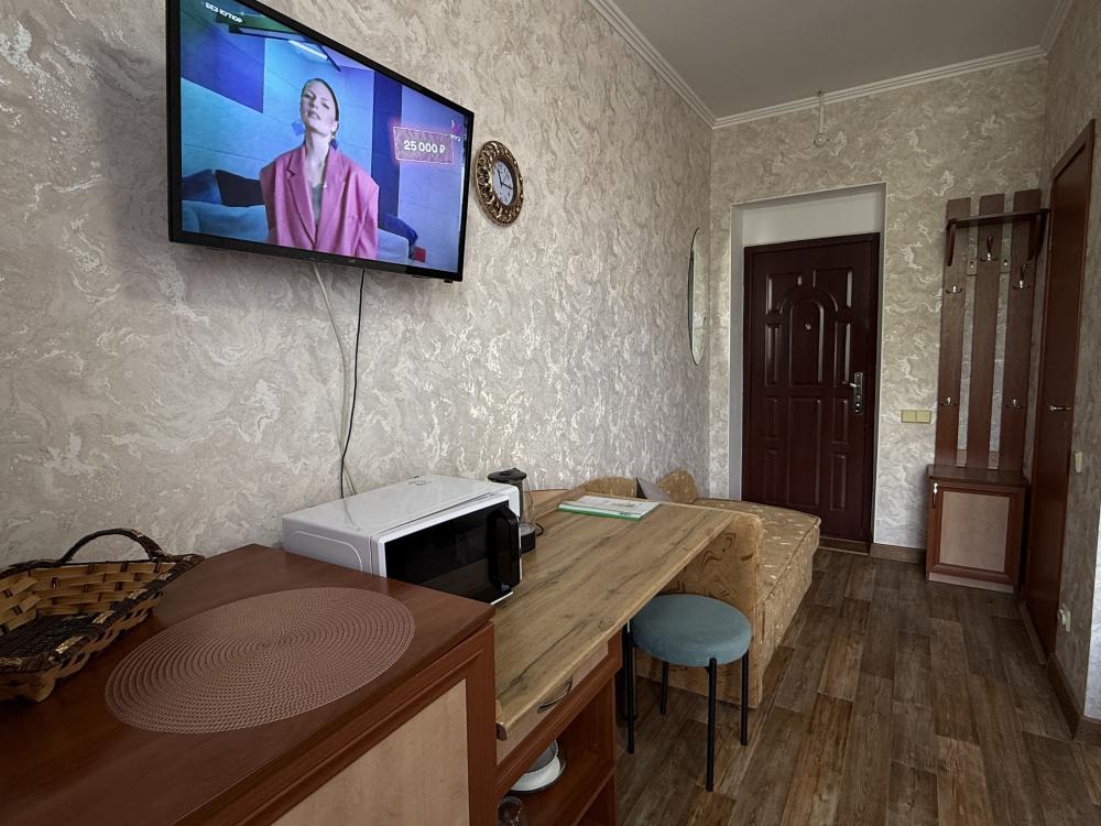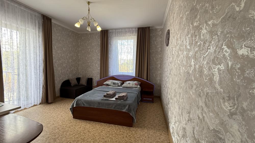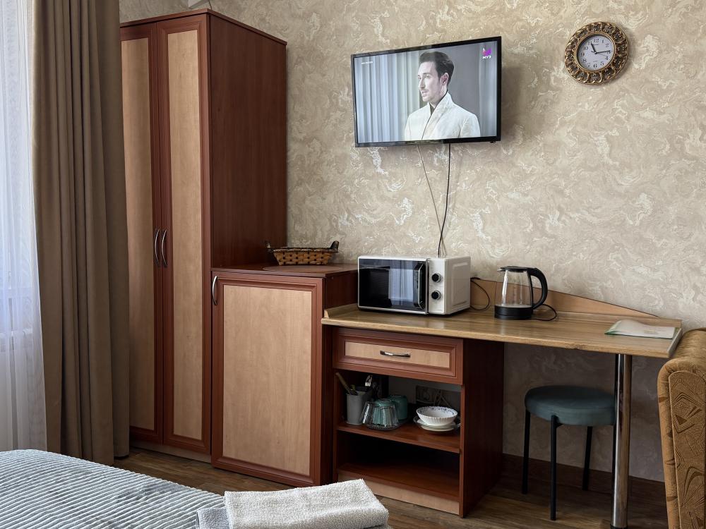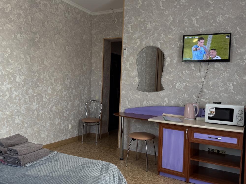 Удобный номер для комфортного проживания вдвоем и + одно дополнительное место. Кухонная зона имеет все необходимое: холодильник, встроенная электроплита, микроволновая печь, электрочайник, мультиварка (по требованию), посуда, стаканы, чашки, фраже на каждого проживающего гостя. Предоставляется чистый комплект белья, полотенец. Номер оборудован кондиционером. Санузел с современной душевой. Подача горячей и холодной воды бесперебойная. WI-FI, ТV. Преимущества: Дополнительное место- диван со спинкой .
