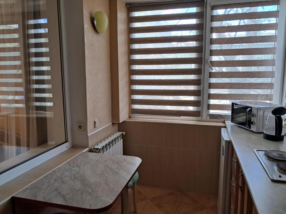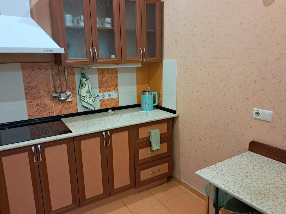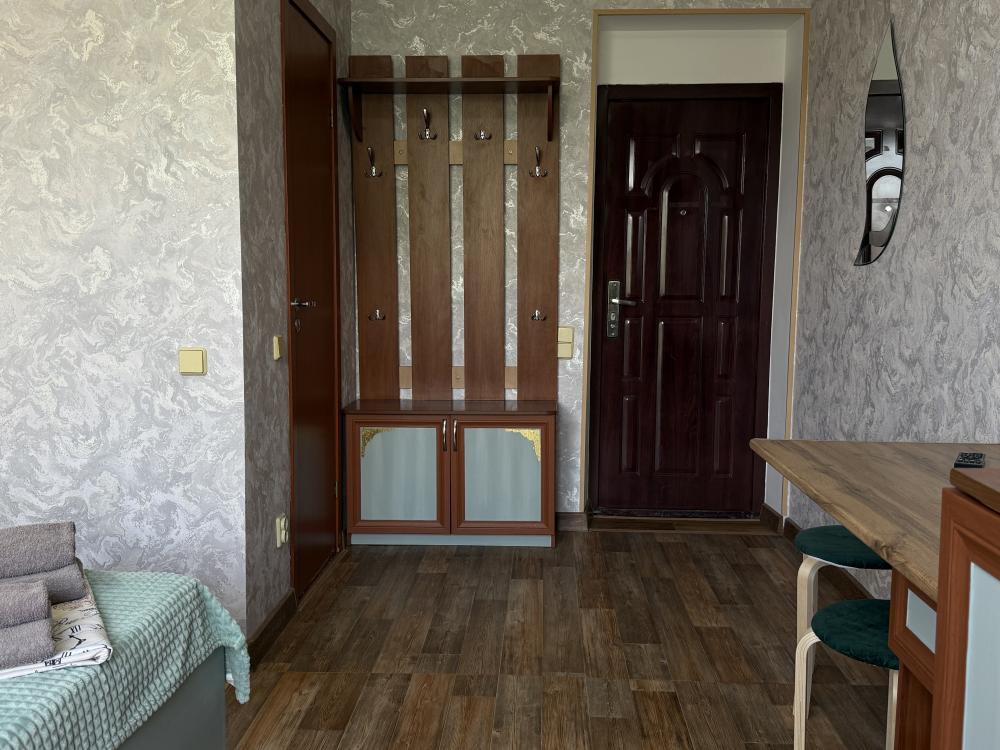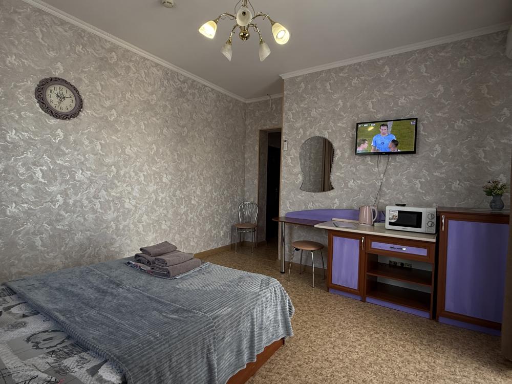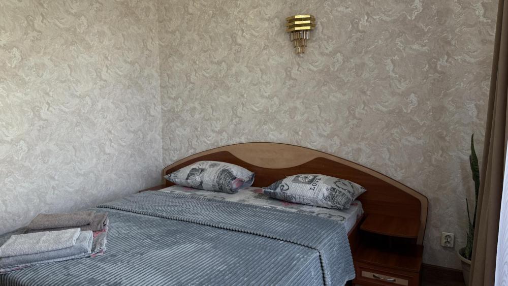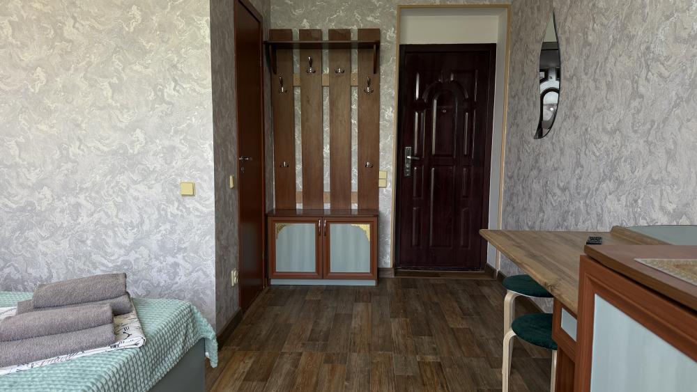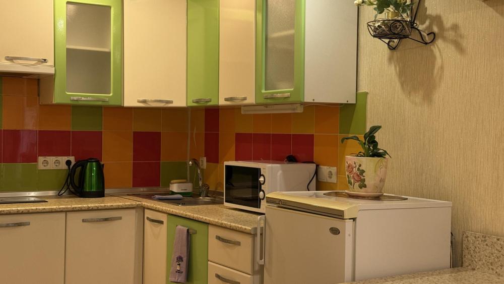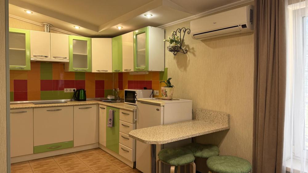 Уютные апартаменты оснащены всем необходимым для проживания. Простой светлый интерьер в светлых зеленых и коричневых тонах, качественная компактная мебель. Большой современный санузел с душем, феном, зеркалом, унитазом, умывальником, набором шампуни и мыла, тапочек. Двуспальная удобная кровать, прикроватные тумбочки, плазменный телевизор, тумба, шкаф для одежды, плотные светонепроницаемы шторы - все для вашего комфортного отдыха. Кухня оснащена всей необходимой бытовой техникой и кухонными принадлежностями. Встроенная электроплита, холодильник, микроволновка, мультиварка (по требованию). Зона кухни-гостиной может комфортно разместить до 4 человек. Диван, стулья, тумбы - прекрасно дополняют интерьер кухонной зоны. У нас полное соблюдение "Закона о Тишине" с 23- до 8-00.