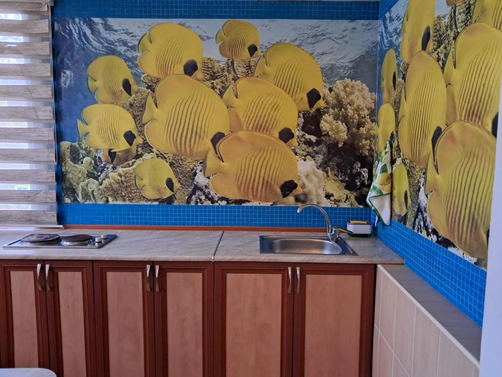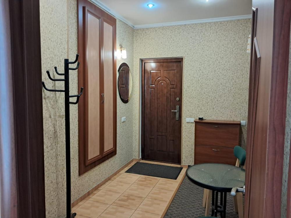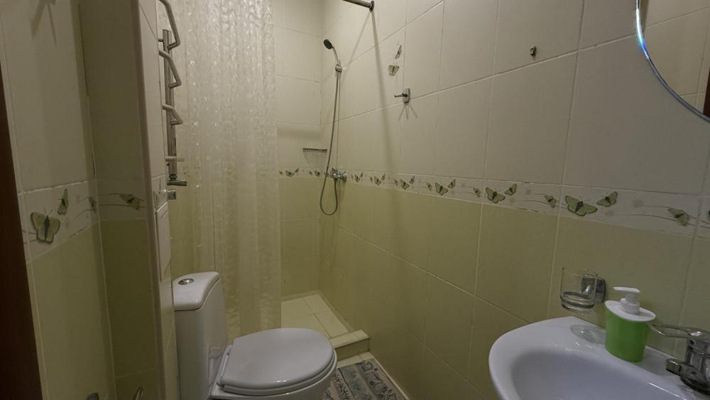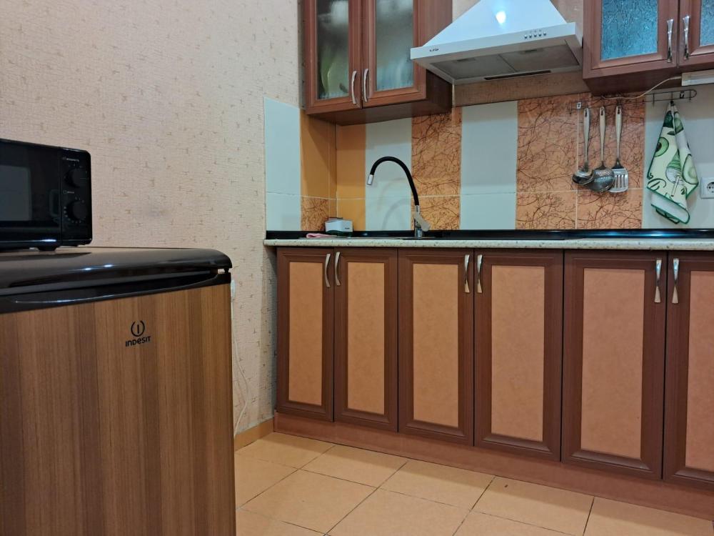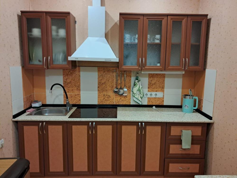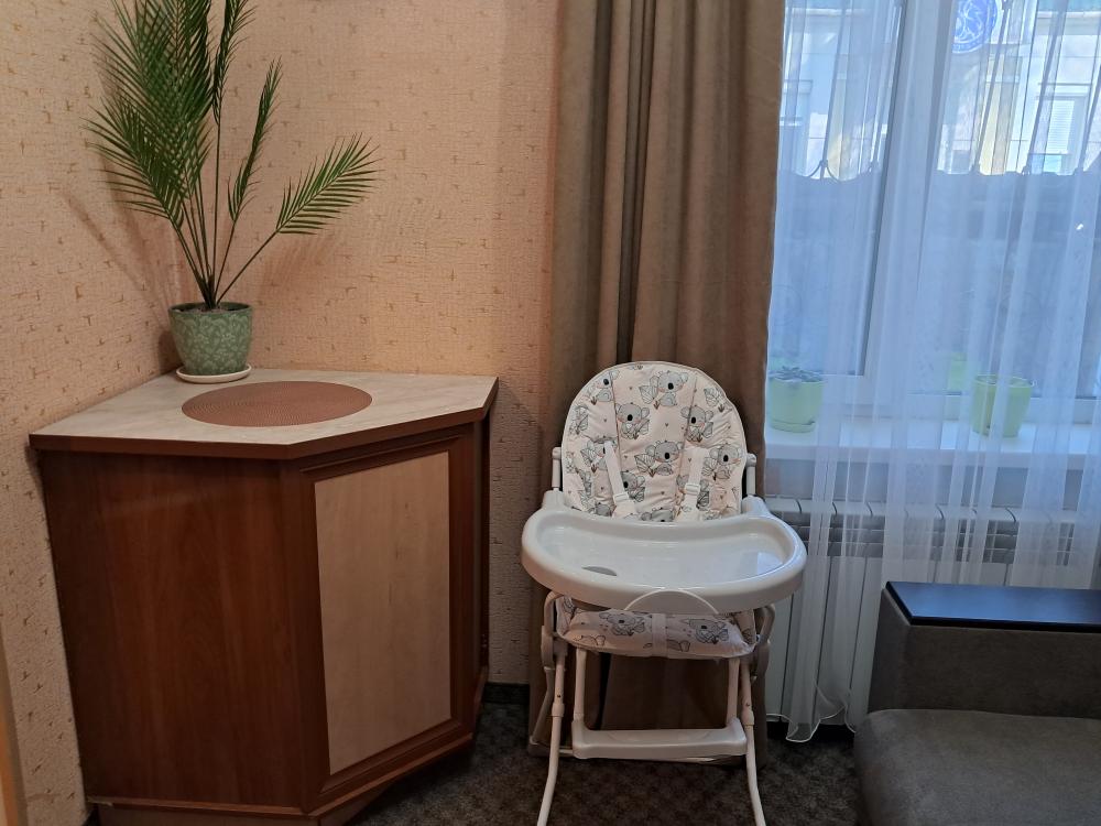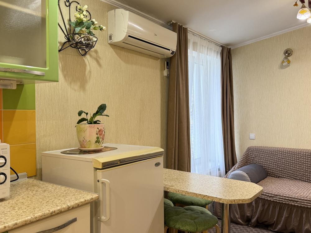 Уютные апартаменты оснащены всем необходимым для проживания. Простой светлый интерьер в светлых зеленых и коричневых тонах, качественная компактная мебель. Большой современный санузел с душем, феном, зеркалом, унитазом, умывальником, набором шампуни и мыла, тапочек. Двуспальная удобная кровать, прикроватные тумбочки, плазменный телевизор, тумба, шкаф для одежды, плотные светонепроницаемы шторы - все для вашего комфортного отдыха. Кухня оснащена всей необходимой бытовой техникой и кухонными принадлежностями. Встроенная электроплита, холодильник, микроволновка, мультиварка (по требованию). Зона кухни-гостиной может комфортно разместить до 4 человек. Диван, стулья, тумбы - прекрасно дополняют интерьер кухонной зоны. У нас полное соблюдение "Закона о Тишине" с 23- до 8-00.