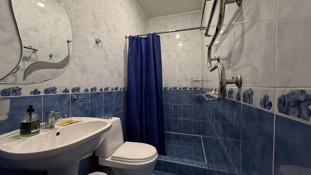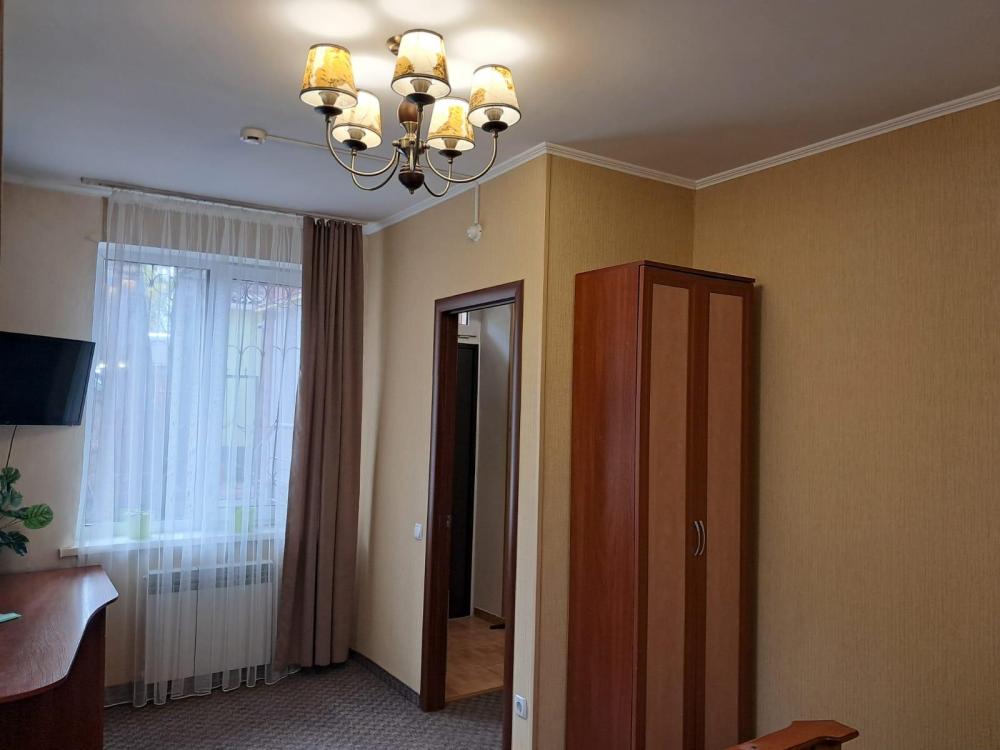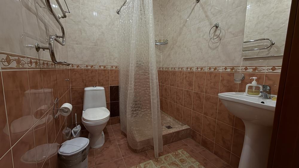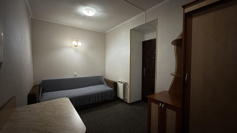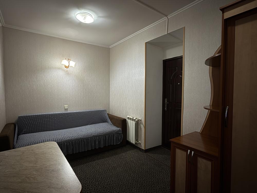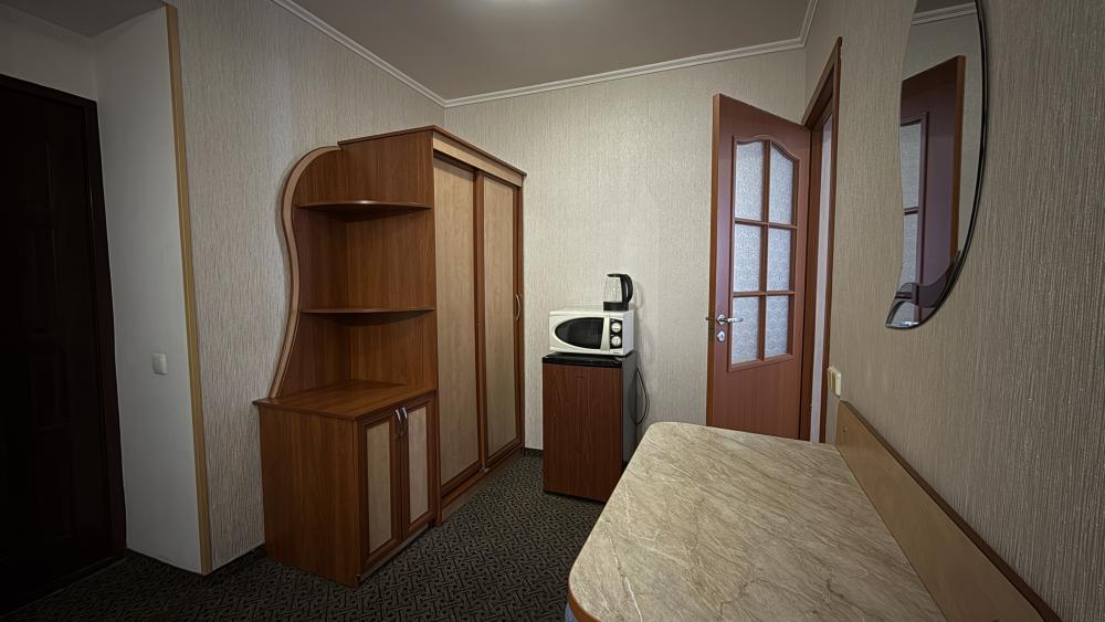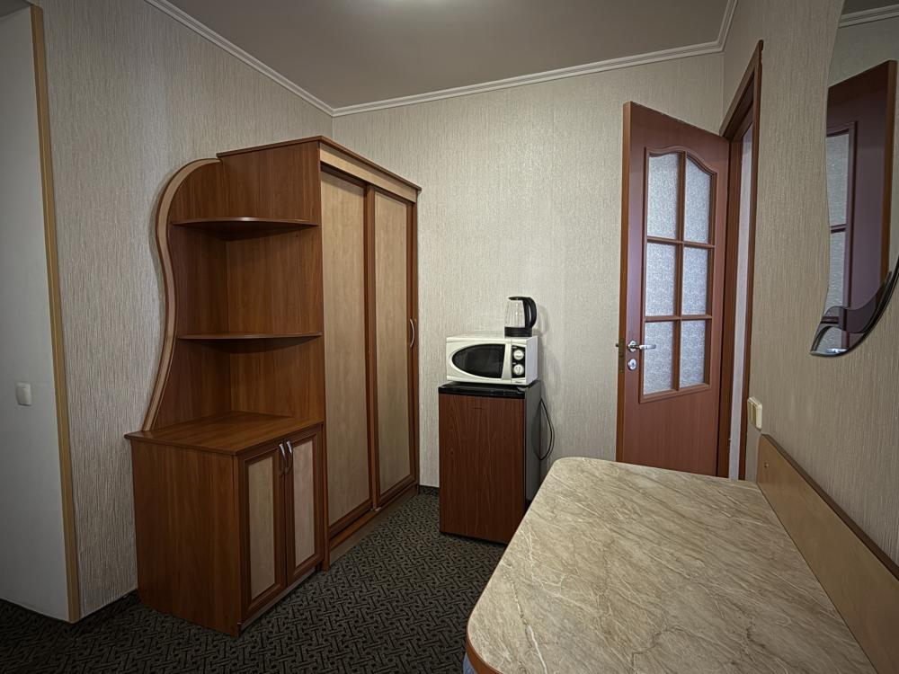 Отличный номер на первом этаже, рядом с ресепшен. Тумба, шкаф, зеркало, стул, холодильник, микроволновка, электрочайник, два стакана и салфетки. Прихожая с вешалками для верхней одежды, шкаф для обуви. Номер оборудован кондиционером. Санузел с душевой кабиной, фен (по требованию). Подача горячей и холодной воды бесперебойная. Особенность этого Номера в том, что ОКНО выходит во внутренний двор, что обеспечит вам полноценный отдых. Кому нравиться тишина, без городской суеты - тогда это самый отличный вариант!