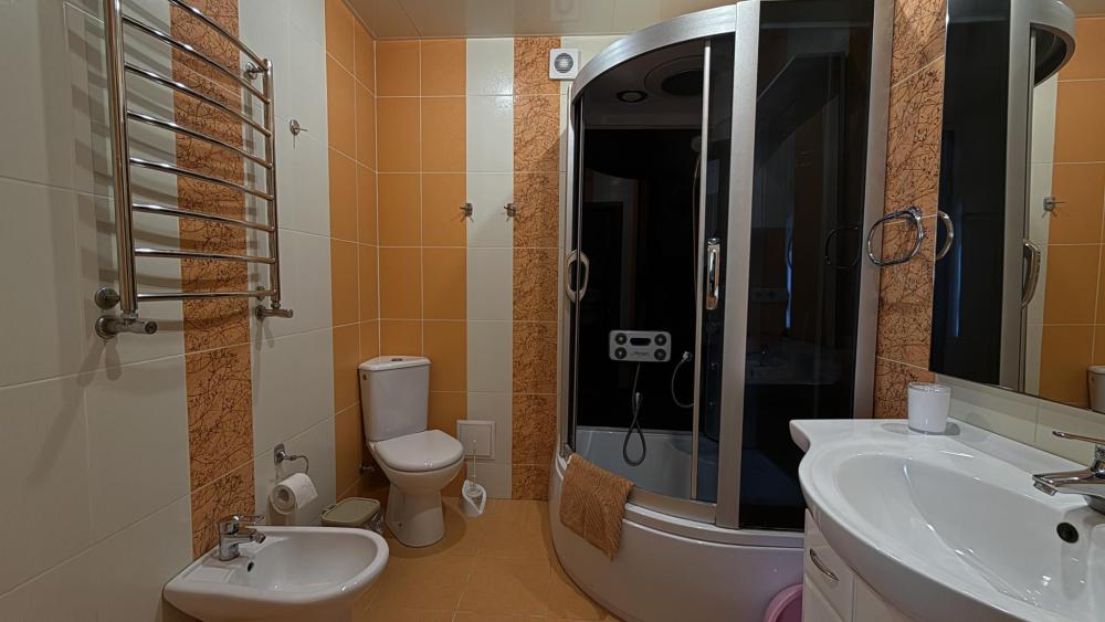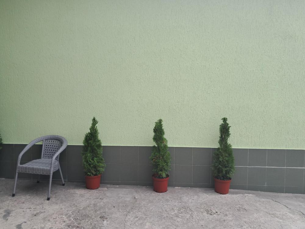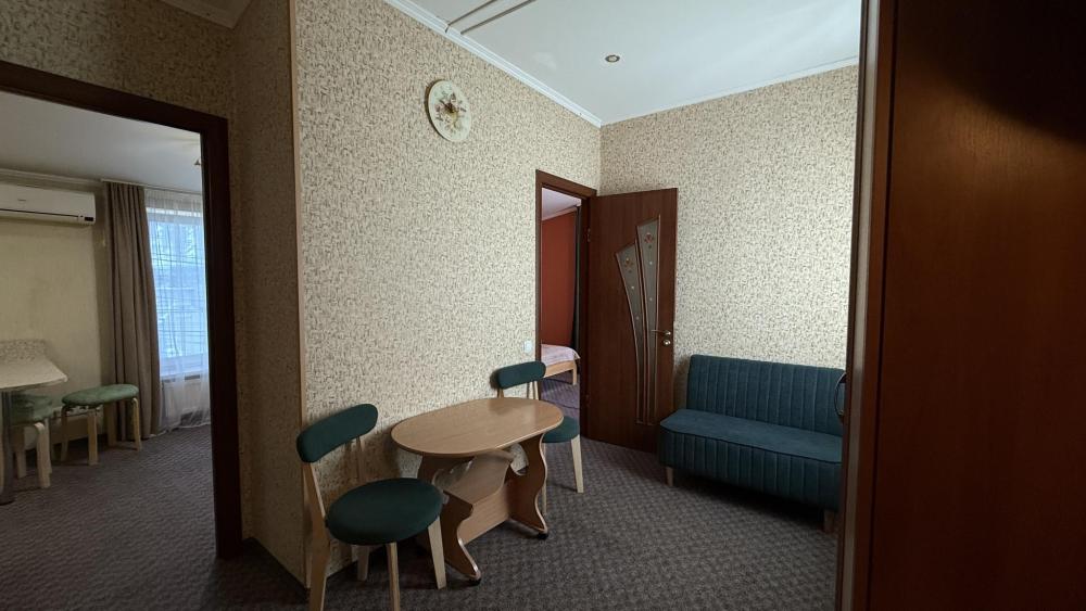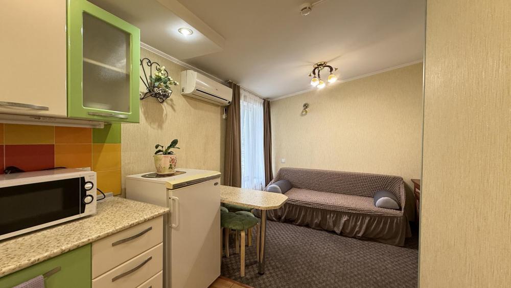 Уютные апартаменты оснащены всем необходимым для проживания. Простой интерьер в светлых зеленых и коричневых тонах, люстра и бра в эко-стиле, качественная компактная мебель. Большой современный санузел с душем, феном, зеркалом, унитазом, умывальником, набором шампуни и мыла. Двуспальная удобная кровать, прикроватные тумбочки, плазменный телевизор, тумба, шкаф для одежды, плотные светонепроницаемы шторы - все для вашего полноценного отдыха. Кухня оснащена всей необходимой бытовой техникой и кухонными принадлежностями. Встроенная электроплита, холодильник, микроволновка, мультиварка. Кухня-гостиная может комфортно разместить до 5 человек. Диван, стулья, тумбы - прекрасно дополняют интерьер этой зоны. Из холла номера, вы можете выйти в свой отдельный дворик. Удобная уличная мебель - для приятного проведения отдыха на свежем воздухе. У нас полное соблюдение "Закона о Тишине" с 23- до 8-00.