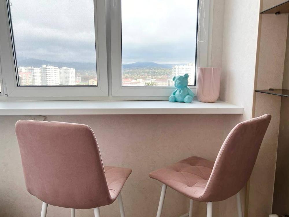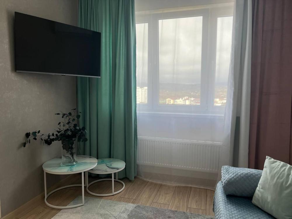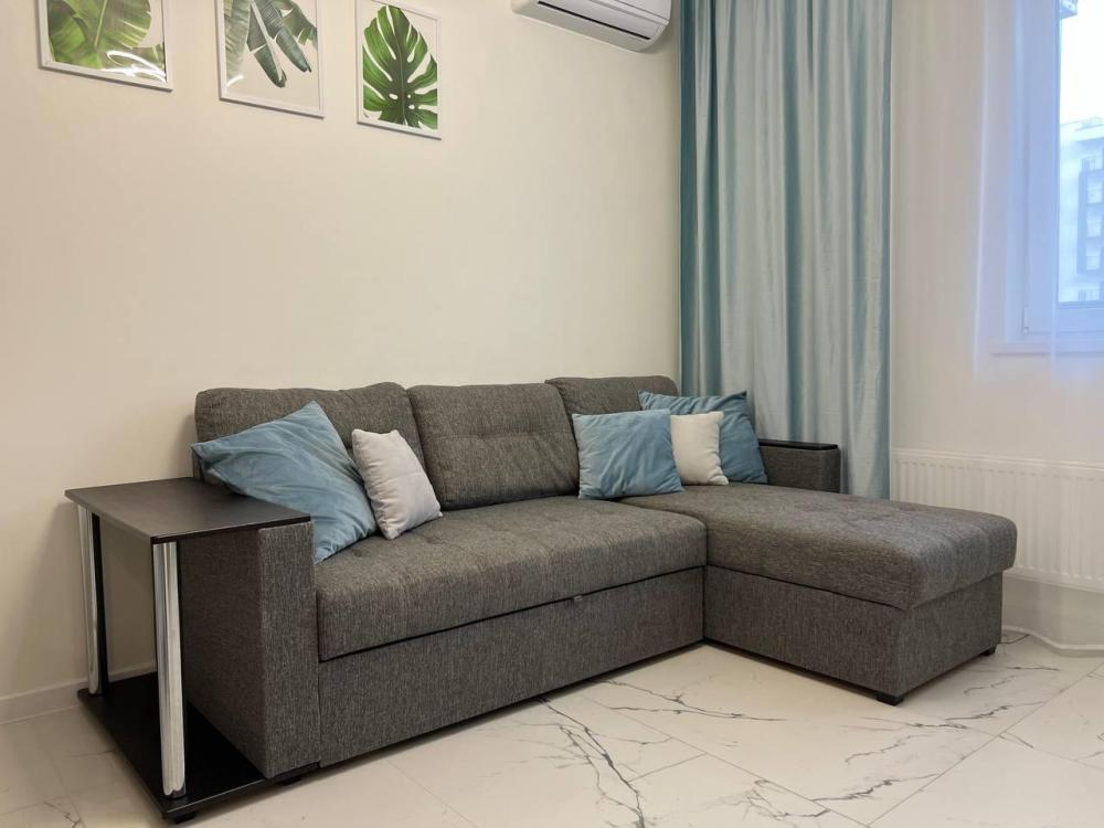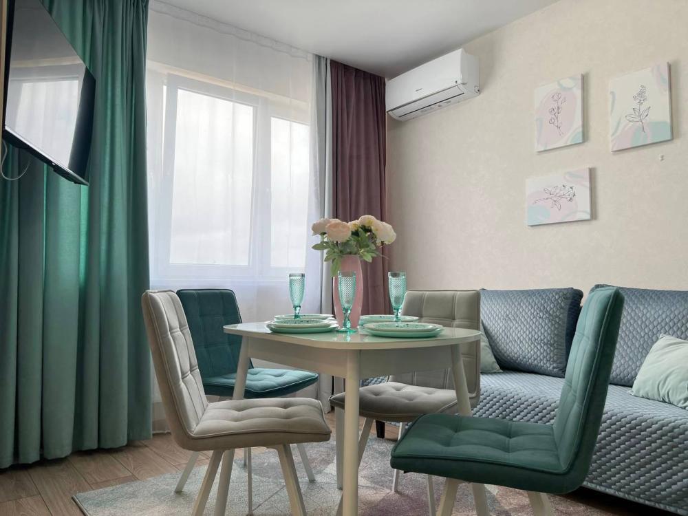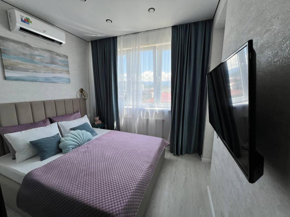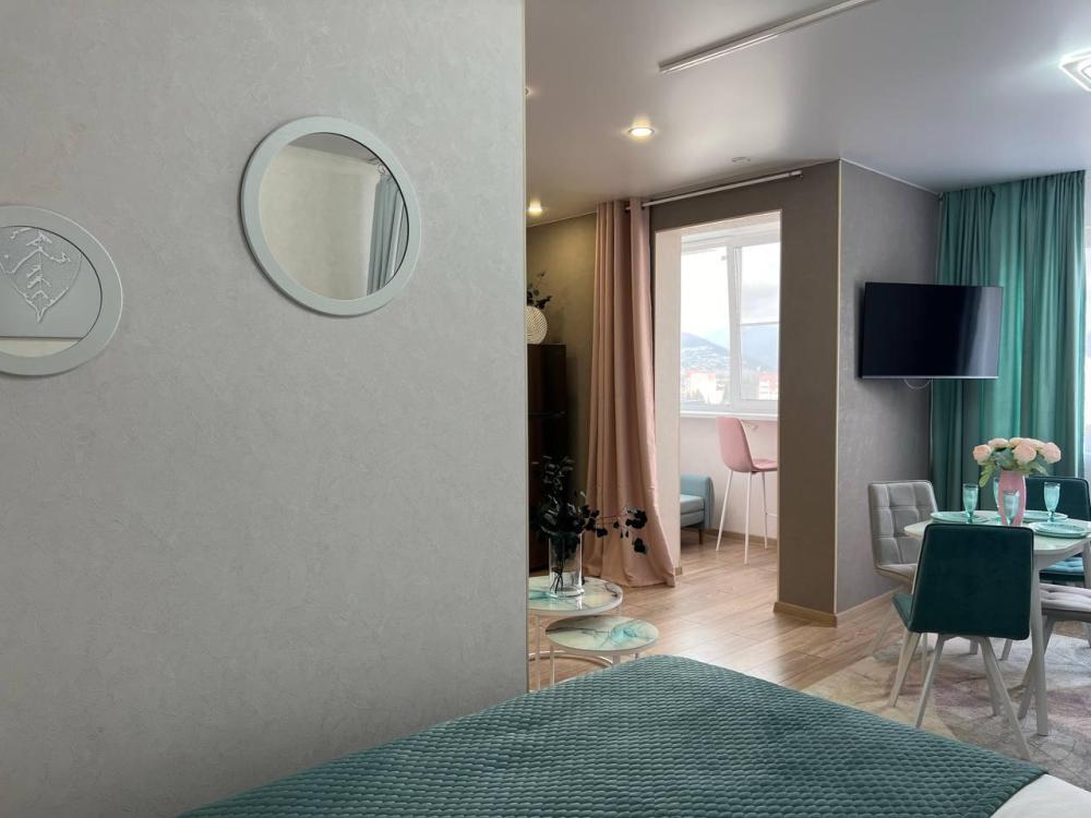 Уютная студия с восхитительным видом на горы в клубном ЖК. Подходит для комфортного проживания пары или семьи из 4-х человек. Кровать 140*200см диван-кровать 140*200см оснащение кухни: индукционная плита, холодильник, эл. чайник) Посуда и кухонная утварь Совмещённый санузел с душевой кабиной, стиральной машиной, феном. WiFi, телевизор, Кондиционер Шкаф, плечики для одежды, гладильная доска, утюг, сушилка. постельное белье и полотенца. Средства гигиены, чистящие/моющие средства.