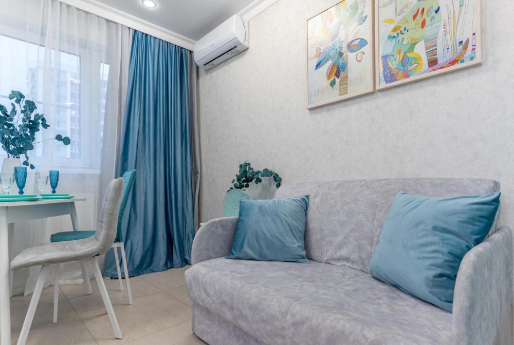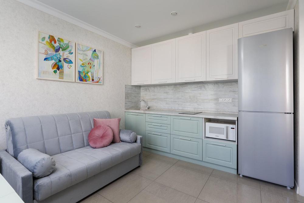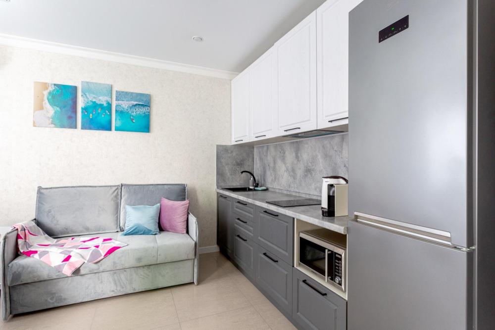 Комфортабельная студия с лоджией в клубном ЖК. Подходит для комфортного проживания пары или семьи из 4-х человек. оснащение кухни: индукционная плита, холодильник, эл.чайник, микроволновая печь) Посуда и кухонная утварь Совмещённый санузел с душевой кабиной, стиральной машиной, феном. WiFi, телевизор, Кондиционер Шкаф, плечики для одежды, гладильная доска, утюг, сушилка. постельное белье и полотенца. Средства гигиены, чистящие/моющие средства.