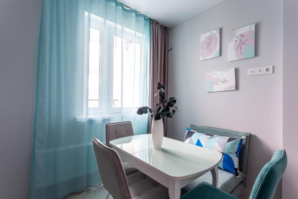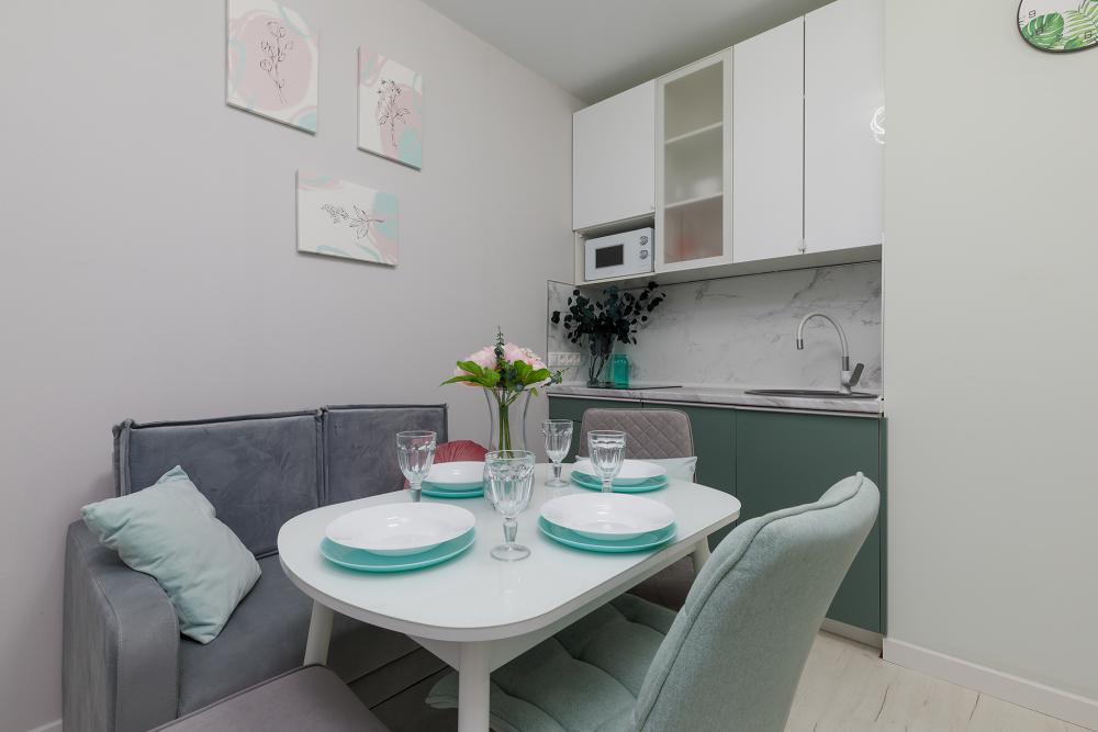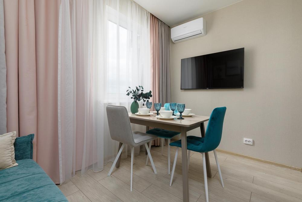Милая однокомнатная квартира в клубном ЖК. Подходит для комфортного проживания семьи до 5-х человек. оснащение кухни: индукционная плита, холодильник, эл.чайник, микроволновая печь) Посуда и кухонная утварь Совмещённый санузел с душевой кабиной, стиральной машиной, феном. WiFi, телевизор, Кондиционер Шкаф, плечики для одежды, гладильная доска, утюг, сушилка. постельное белье и полотенца. Средства гигиены, чистящие/моющие средства.