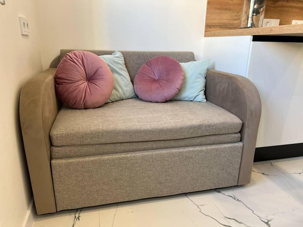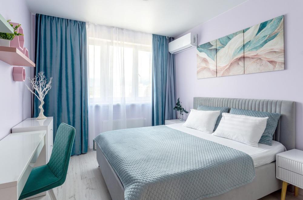 Стильная студия Делюкс с видом на горы в клубном ЖК. Подходит для комфортного проживания пары или семьи из 4-х человек. Кровать 140*200см диван-кровать 140*200см оснащение кухни: индукционная плита, холодильник, эл. чайник) Посуда и кухонная утварь Совмещённый санузел с душевой кабиной, стиральной машиной, феном. WiFi, телевизор, Кондиционер Шкаф, плечики для одежды, гладильная доска, утюг, сушилка. постельное белье и полотенца. Средства гигиены, чистящие/моющие средства.