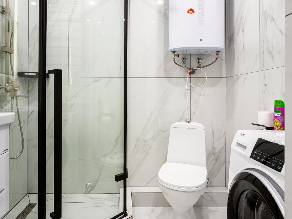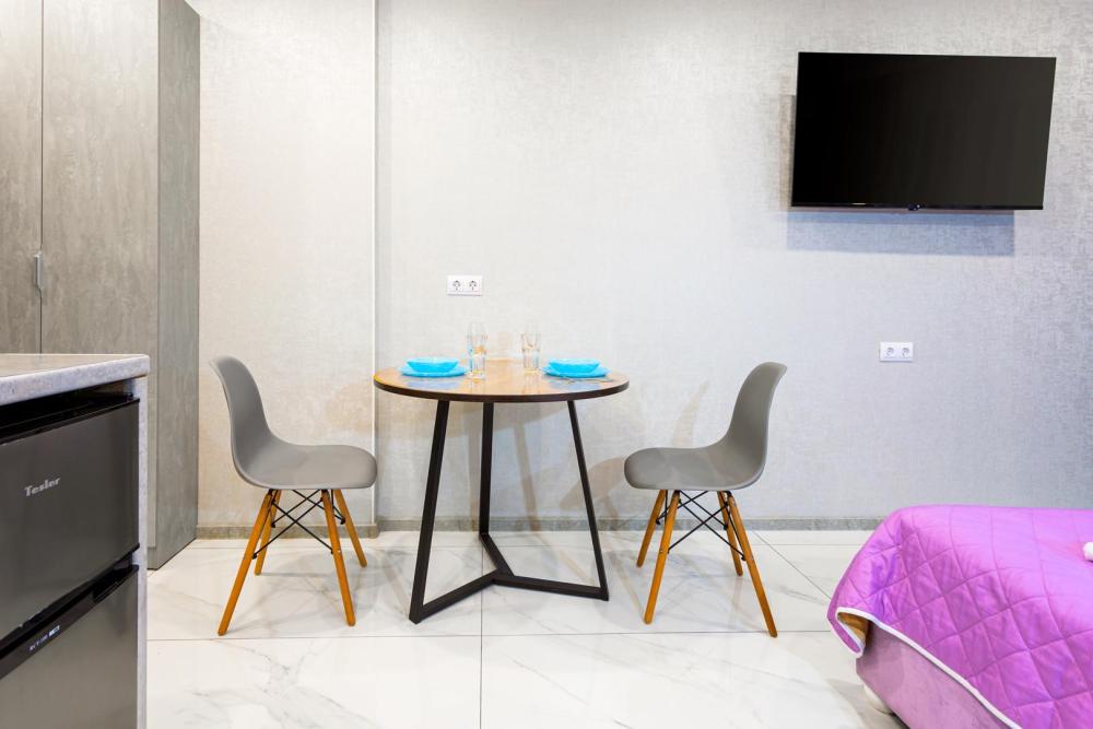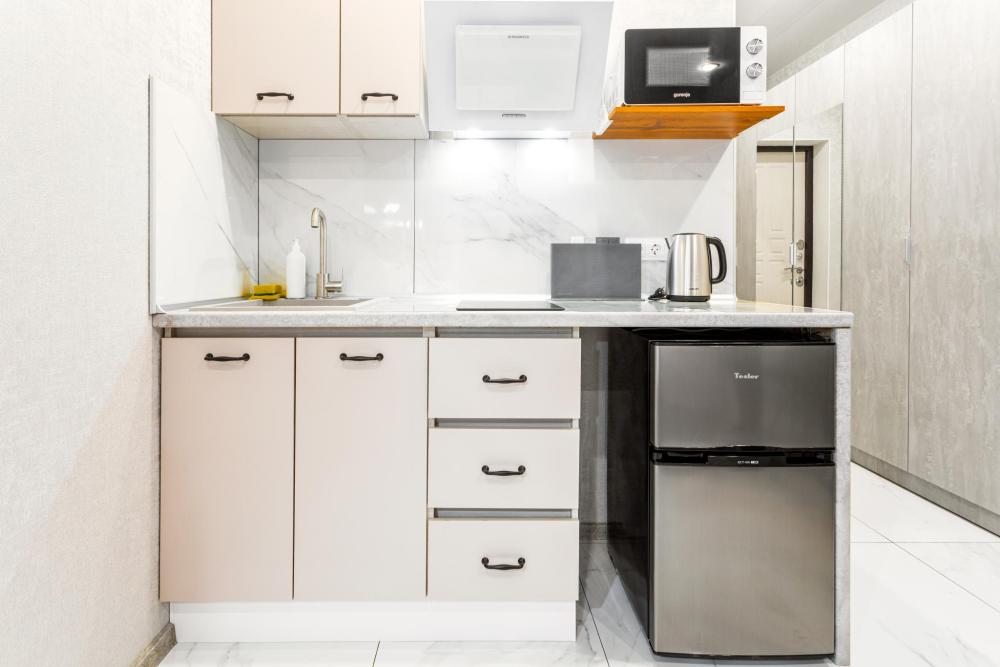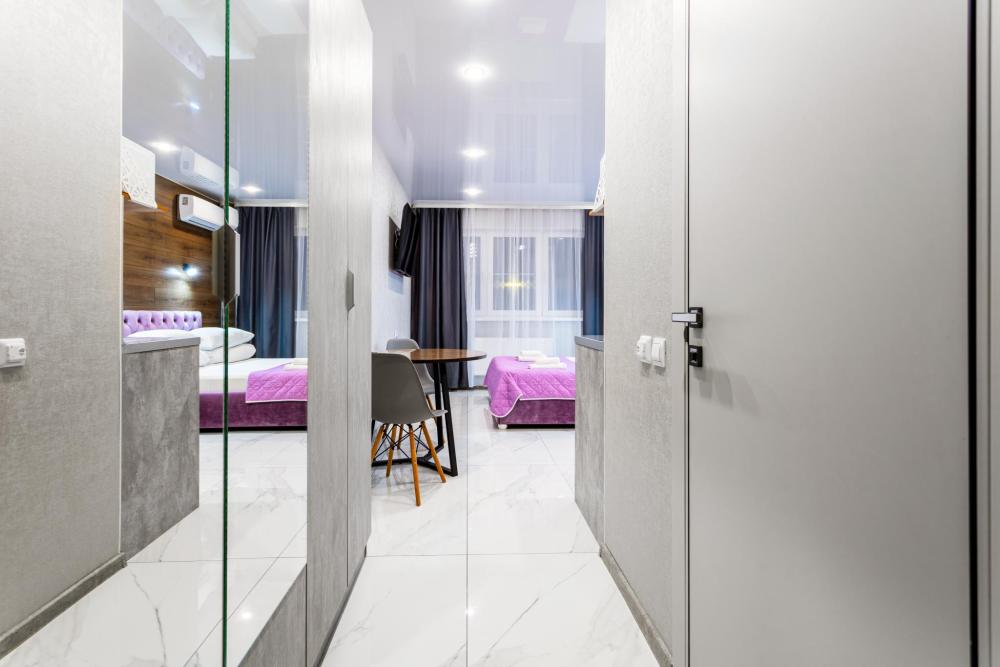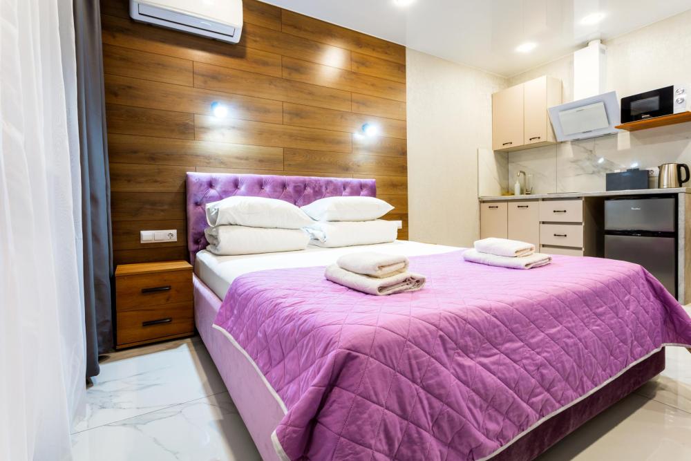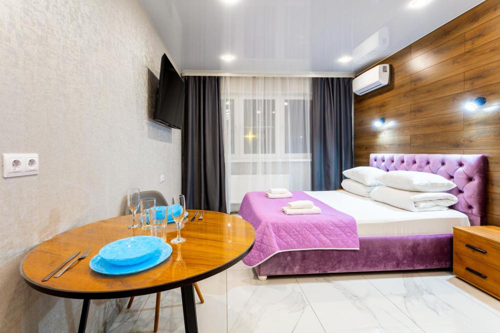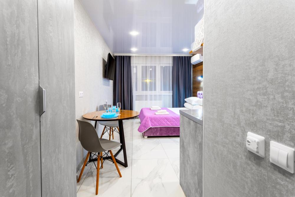 Квартира студия общей площади 27кв.м. находится на 1 этаже 10-ти этажного дома. Оснащение: большая двуспальная кровать 160*200 с мягким изголовьем и ортопедическим матрацем и кресло-кровать с ортопедическим основанием 120*195. Шкаф для хранения вещей. Квартира полностью оборудована всем необходимым для комфортного пребывания: кухонный гарнитур, варочная поверхность, СВЧ печь, холодильник, эл. чайник, посуда, столовые приборы, обеденный стол. Централизованная бесперебойная подача горячей воды, электрический полотенцесушитель, фен, зеркало с подсветкой и антизапотеванием, тропический душ. Гладильная доска, утюг, сушилка для белья. Стабильный WI-FI, телевидение.