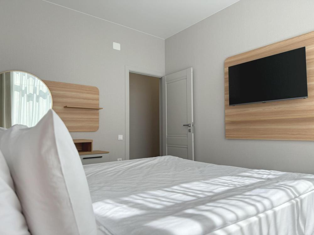 Апартаменты комфорт оснащены: двуспальной кроватью, диваном, холодильником, кондиционером, телевизором, обеденной зоной, ванной комнатой.