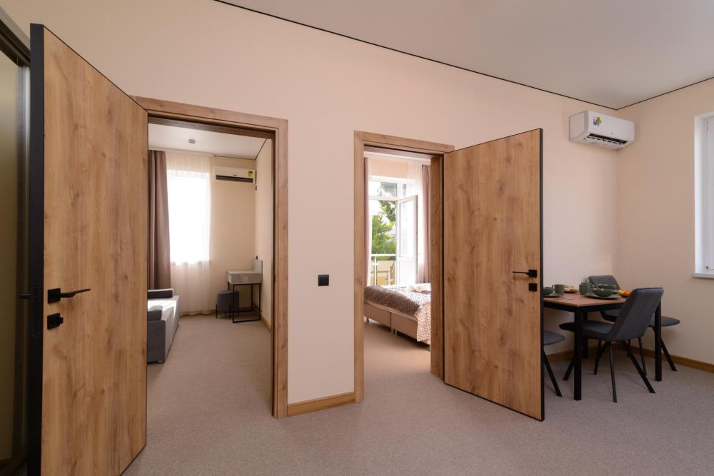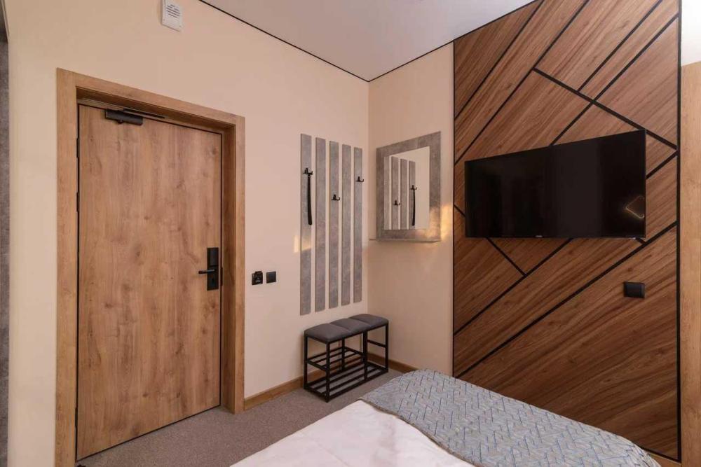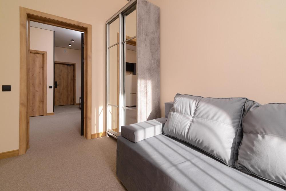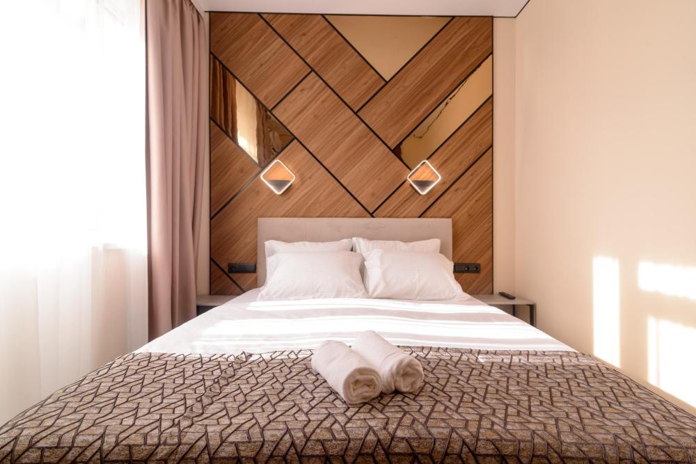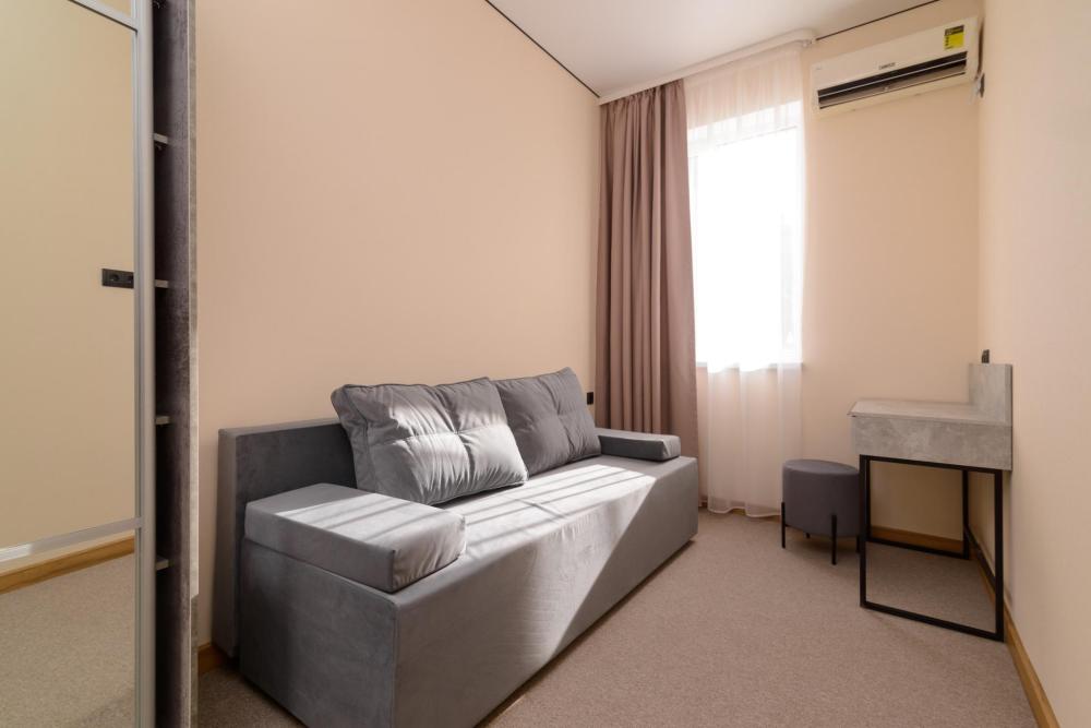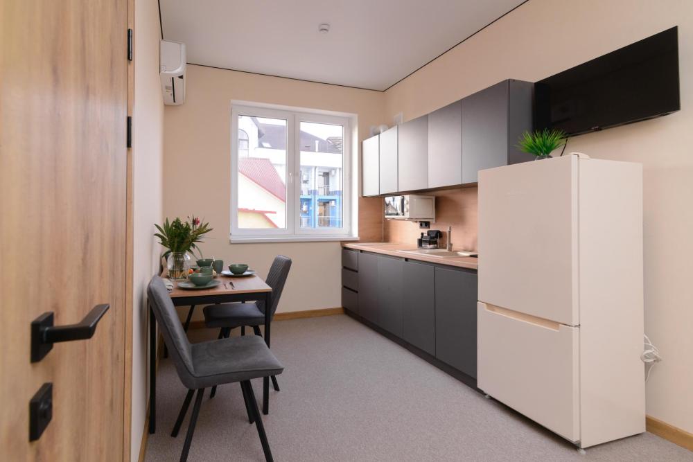 Комната "Комфорт" с кухонной зоной. Каждая комната продумана до мелочей: современный эргономичный дизайн гармонично сочетается с теплыми цветовыми гаммами — бежевыми и коричневыми тонами, создающими атмосферу уюта и спокойствия. Спальные места: двуспальная или две односпальные кровати. Для удобства в предусмотрена полностью оборудованная кухонная зона, с посудой и техникой. Постельное белье и полотенца предоставляются. Ванная комната с душем. Есть сейф, фен, лампа для чтения, телевизор.