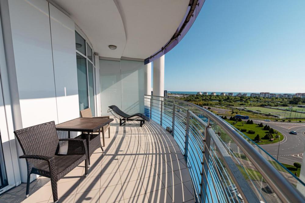 В элегантных и просторных номерах с комфортом разместится большая компания или семья с детьми (вместимость до 5 человек). Номер состоит из спальни с двуспальной кроватью и функциональной гостиной с мягким раскладывающимся диваном. Номер оборудован балконом с потрясающим видом на Чёрное море, имеется ротанговая мебель. Высшая категория «Люкс».