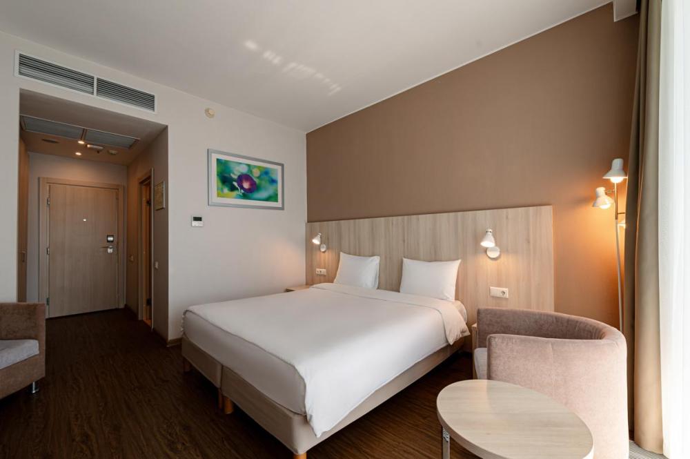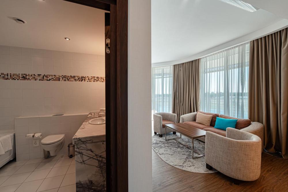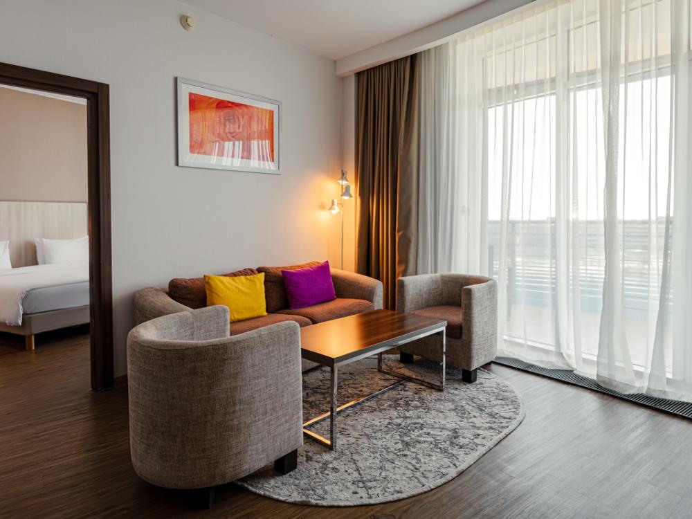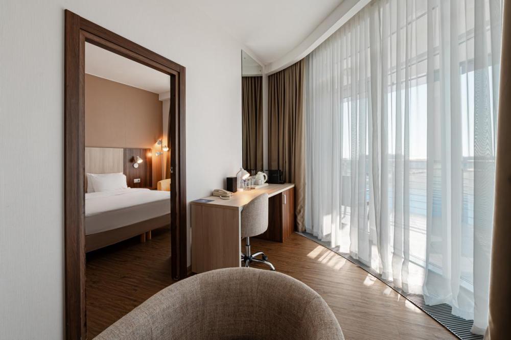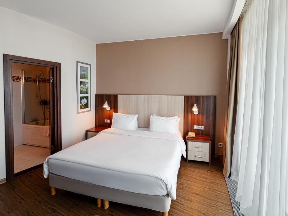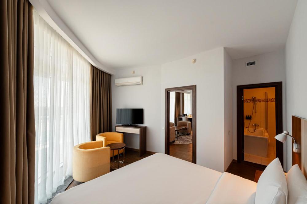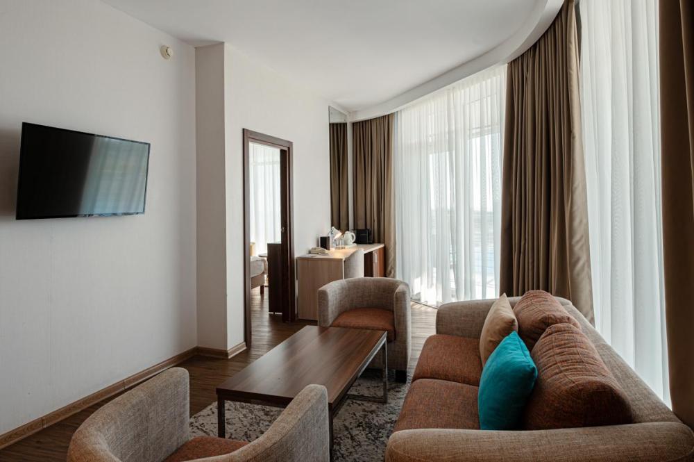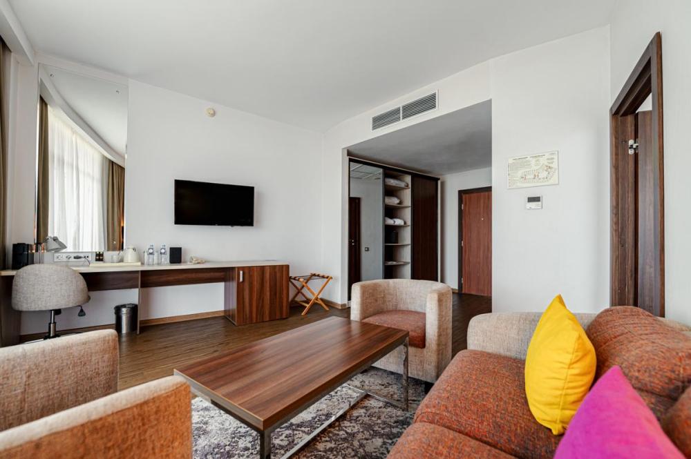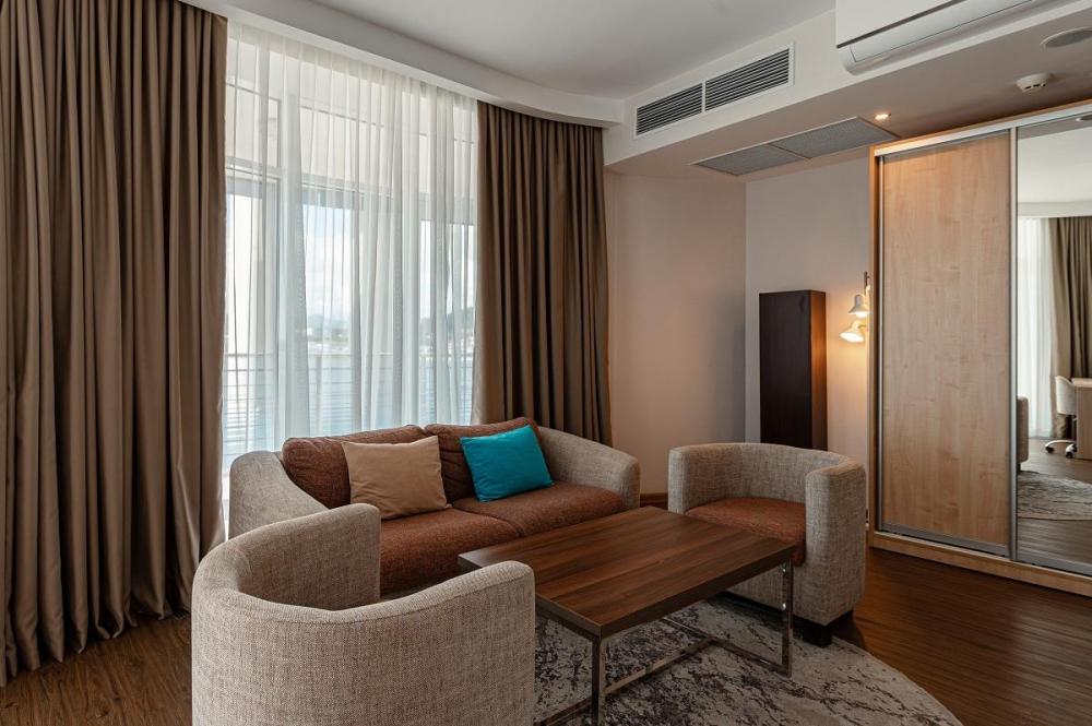 Просторный двухкомнатный номер улучшенной комплектации расположен на 7 этаже отеля. Номер состоит из спальни с двуспальной кроватью и функциональной гостиной с мягким раскладывающимся диваном в каждой комнате находится санузел. Оборудован балконом с видом на Олимпийский парк. Высшая категория «Люкс».