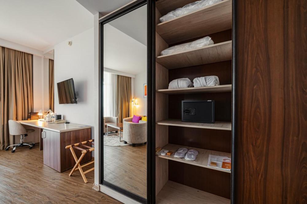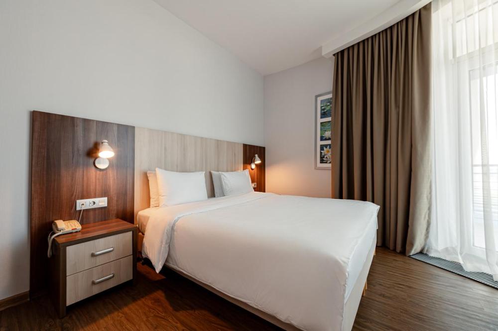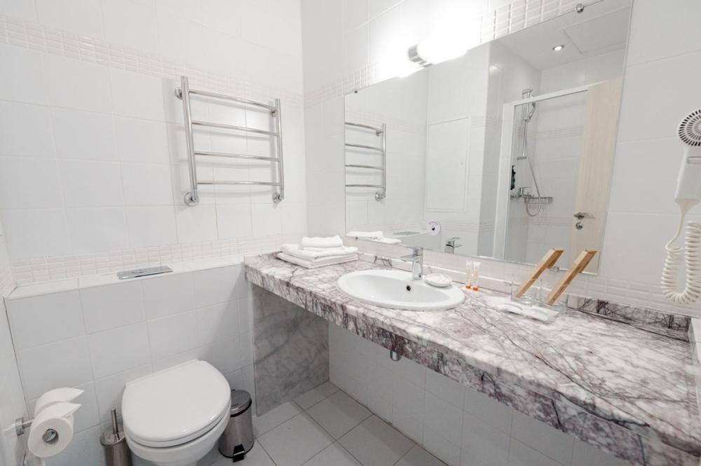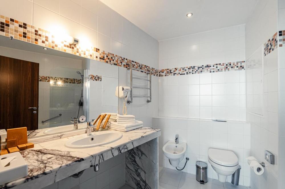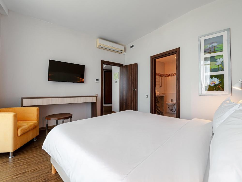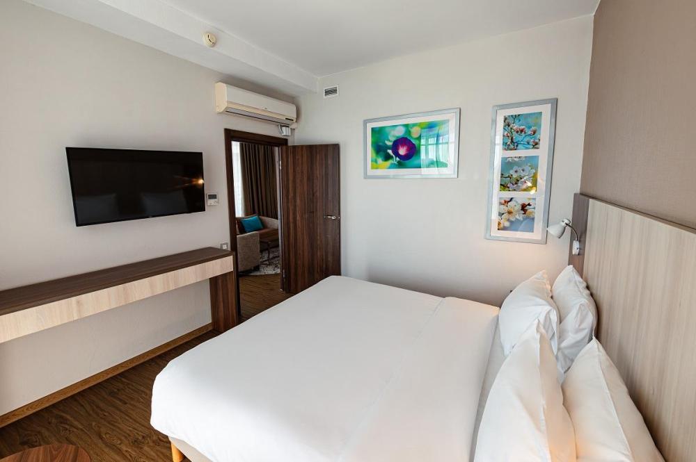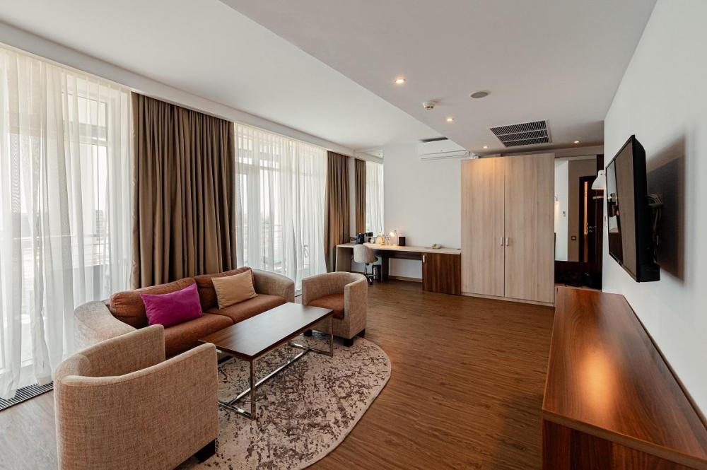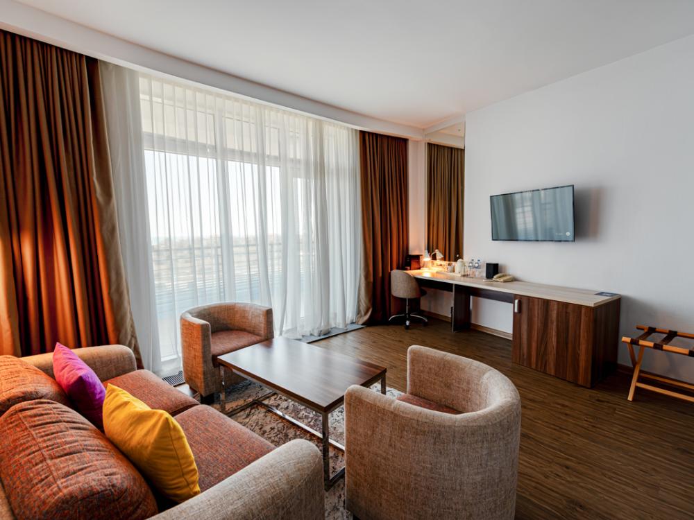 Просторный двухкомнатный номер улучшенной комплектации расположен на 7 этаже отеля. Номер состоит из спальни с двуспальной кроватью и функциональной гостиной с мягким раскладывающимся диваном в каждой комнате находится санузел. Оборудован балконом с видом на Олимпийский парк. Высшая категория «Люкс».