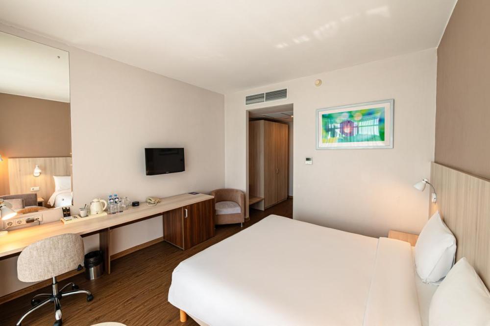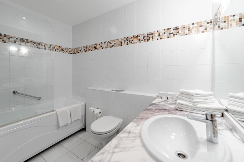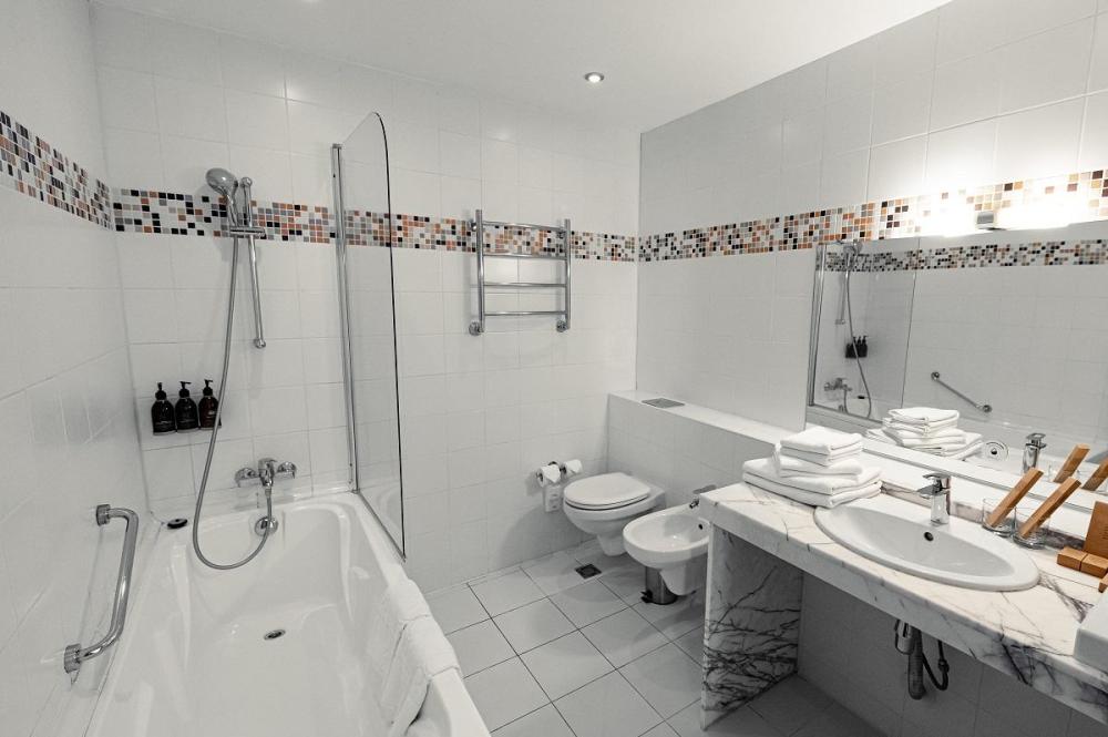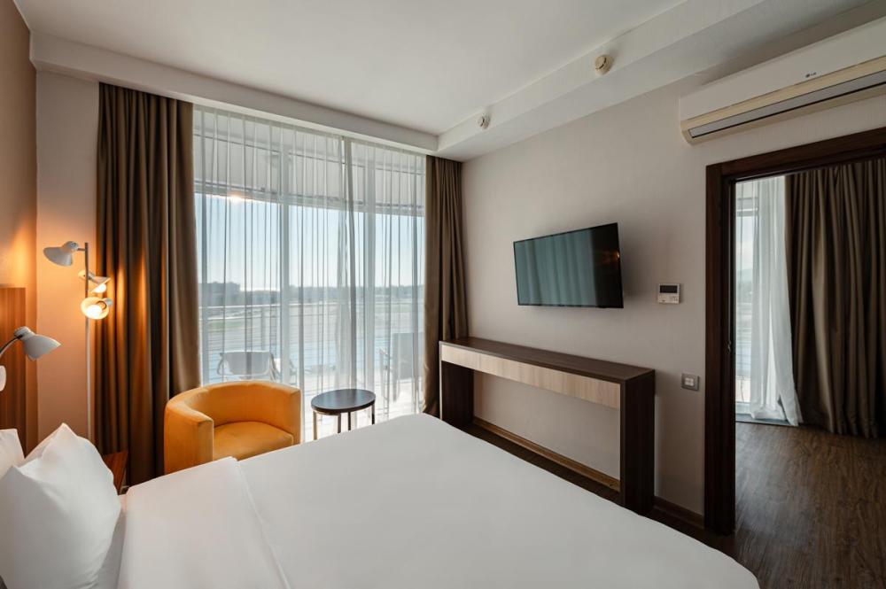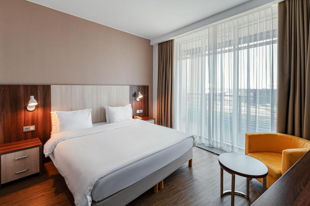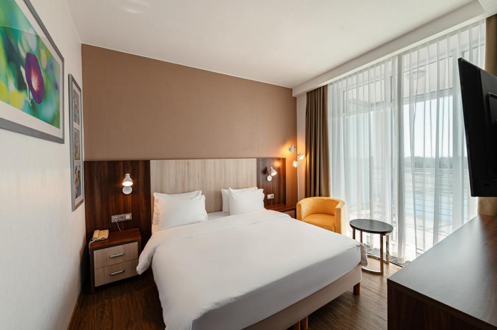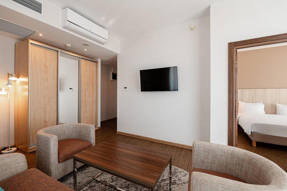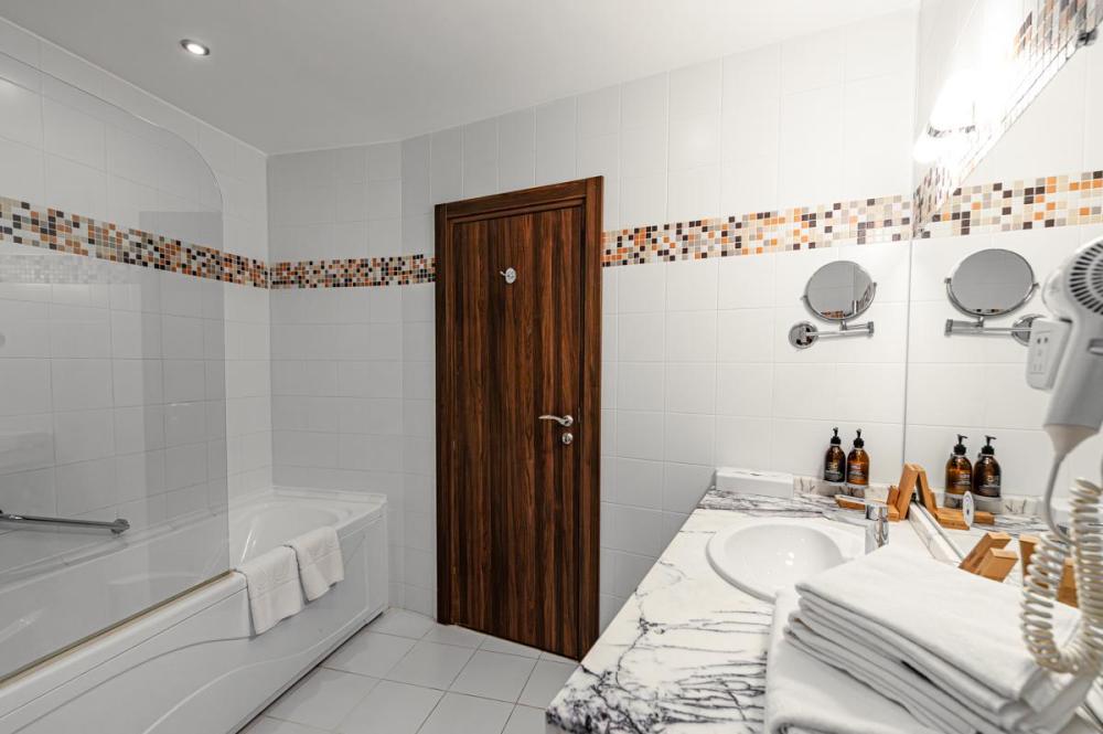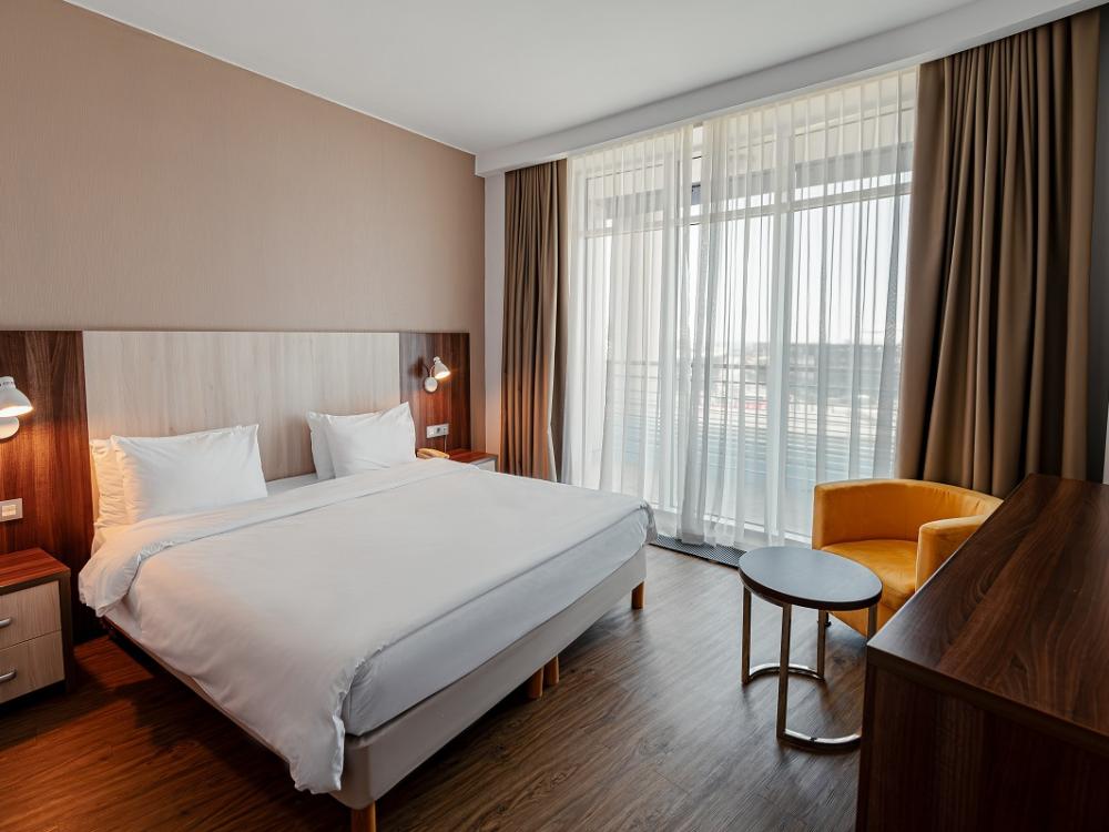 Просторный двухкомнатный номер улучшенной комплектации расположен на 7 этаже отеля. Номер состоит из спальни с двуспальной кроватью и функциональной гостиной с мягким раскладывающимся диваном в каждой комнате находится санузел. Оборудован балконом с видом на Олимпийский парк. Высшая категория «Люкс».