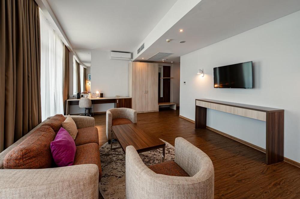 В элегантных и просторных номерах улучшенной комплектации с комфортом разместится большая компания или семья с детьми (вместимость до 5 человек). Номер состоит из спальни с двуспальной кроватью и функциональной гостиной с мягким раскладывающимся диваном, в каждой комнате находится санузел. Номер оборудован балконом с потрясающим видом на Чёрное море, имеется ротанговая мебель. Высшая категория «Люкс».