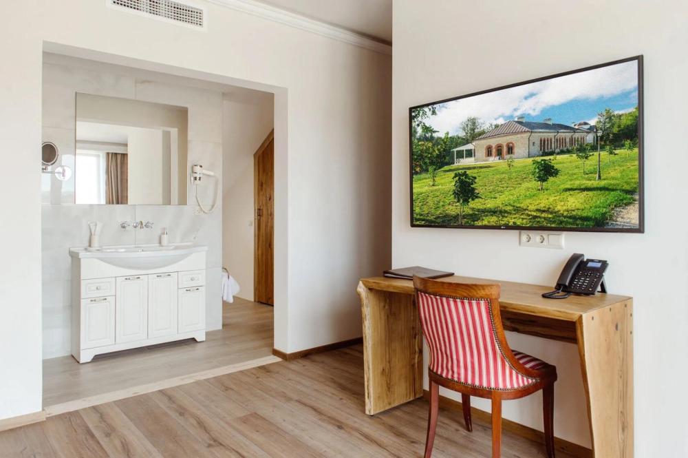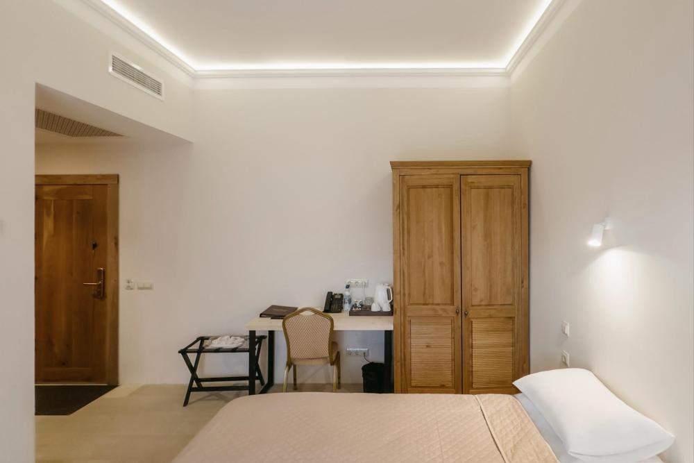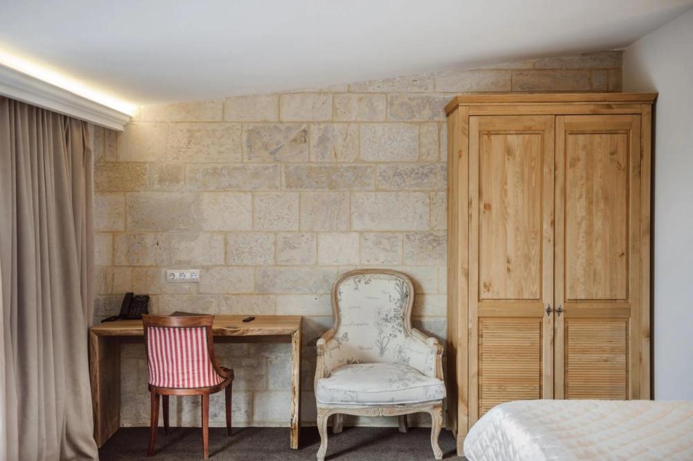 5 номеров категории « сюит» находятся на первом этаже в Крепости; Однокомнатный номер - 34-42 кв.м.; Двухспальная кровать 180*200см; Мягкое кресло, антикварные письменный стол и стул; Отдельно стоящая ванная, душ, амбарная дверь в санузел; Кондиционер, Smart-ТВ, Wi-Fi, чайник, шкаф, минибар; Вид во внутренний дворик; Лаунж-зона рядом с номером во внутреннем дворике; Номера одной категории могут отличаться ввиду исторических планировок. Размещение с домашними животными в номерах данной категории запрещено.