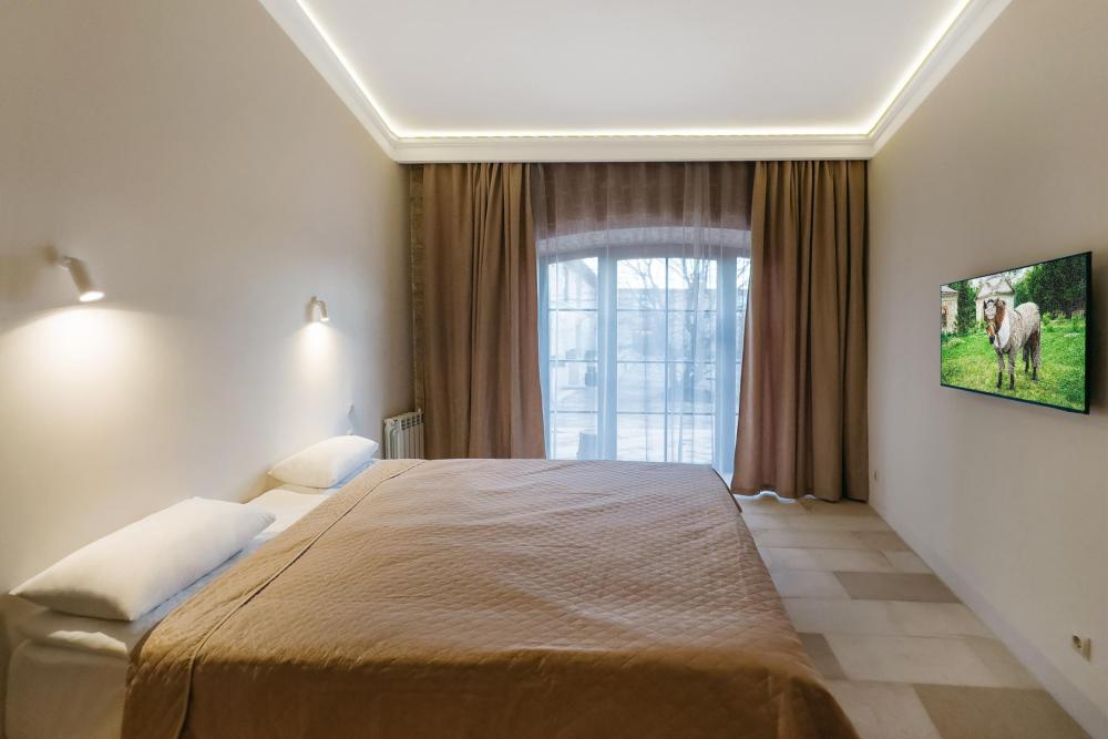 1 номера категории «Люкс с двумя спальными» находится на втором этаже в Крепости; Трехкомнатный номер - 65 кв.м.; Двухспальная кровать 180*200см в одной комнате; Две односпальных кровати 90*200см во второй комнате; Мягкий раскладной диван (спальное место 140*200см) в гостиной; Ванная, душ, 2 санузла в разных комнатах; Кондиционер, Smart-ТВ, Wi-Fi, чайник, шкаф, стол, стул, минибар; Вид во внутренний дворик; Лаунж-зона на балконе с шезлонгами; Номера одной категории могут отличаться ввиду исторических планировок. Размещение с животными в номерах данной категории запрещено.