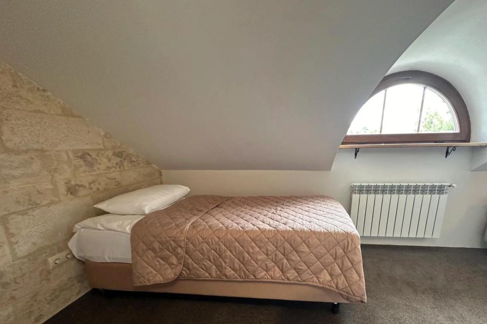 Вместимость номера до 4-х гостей (двухспальная кровать 180сх200см + две односпальных кровати 90х200см на полуэтаже). Номер расположен в восстановленной крепости XIX века на втором этаже. Вид из номера на аллею. Размещение с домашними животными в номерах данной категории запрещено.