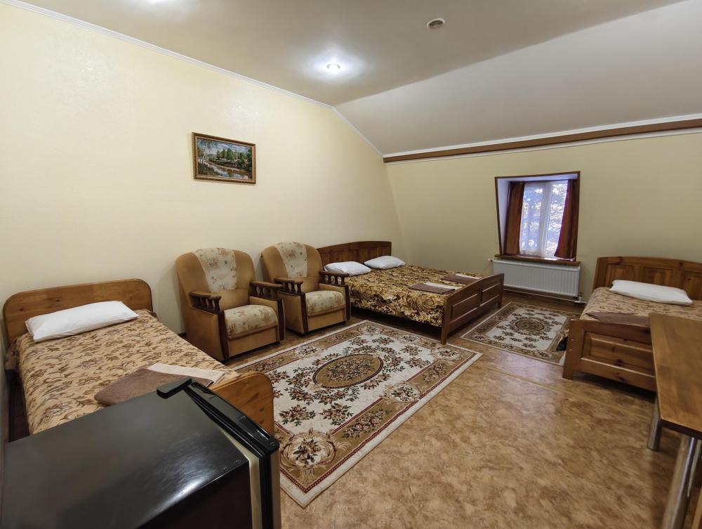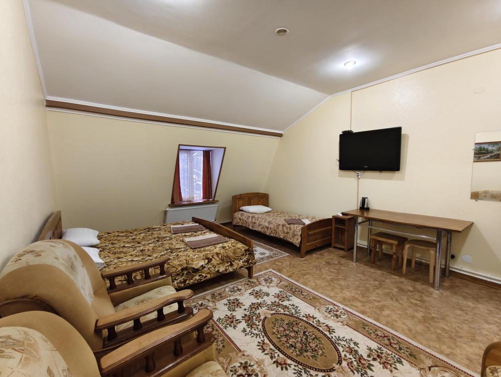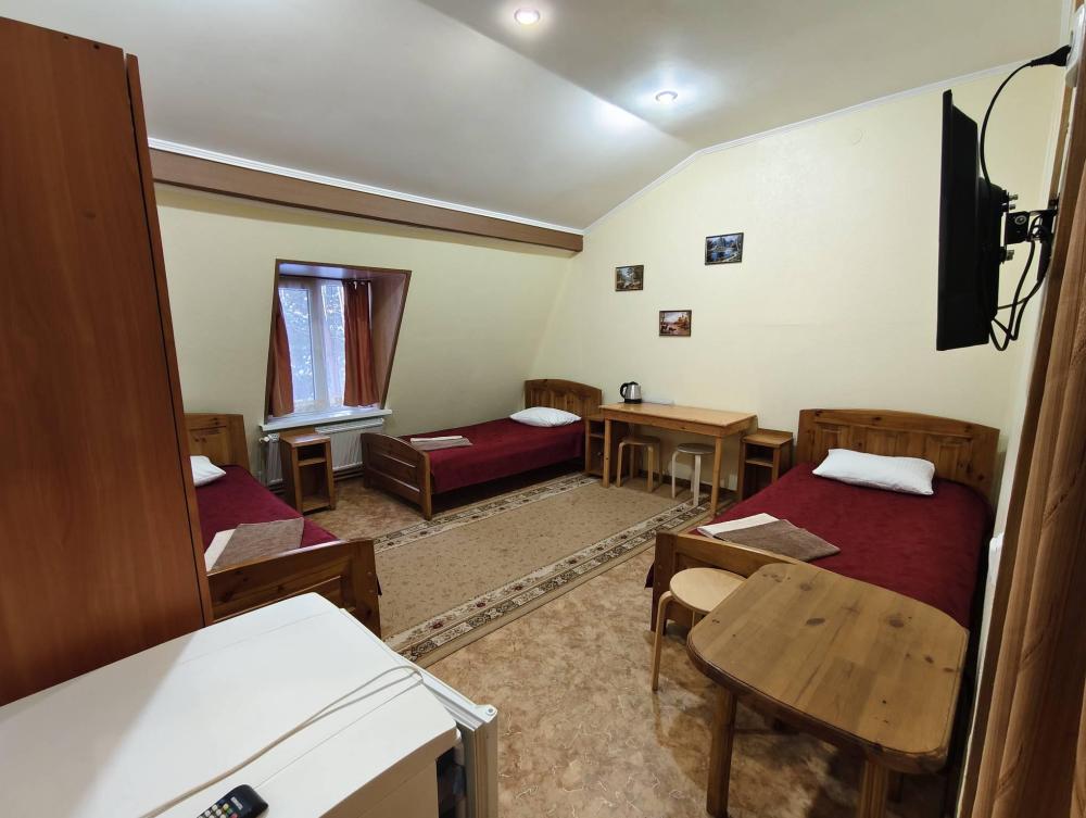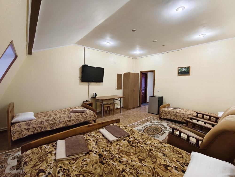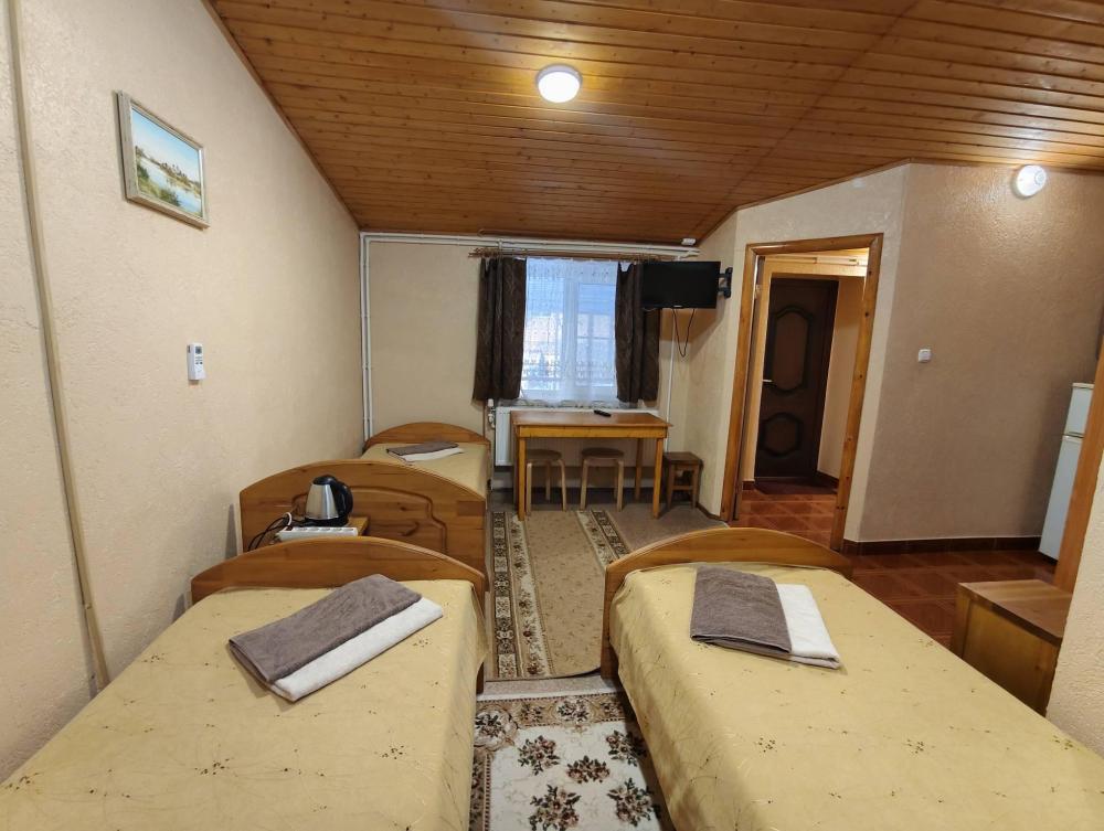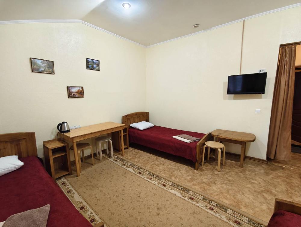 Трехместный однокомнатный номер со всеми удобствами: качественное белье и полотенца ,Душ ,туалет ,умывальник, мыло шампунь гель для душа ,холодильник ТВ,стол,шкаф ,чайник. На на территории гостевого дома есть беседки,мангалы. Есть большая общая кухня полностью укомплектованная -можно готовить, большой зал для приема пищи ,бесплатная парковка на территории под видео наблюдением. Бесплатный чай и кофе для гостей .