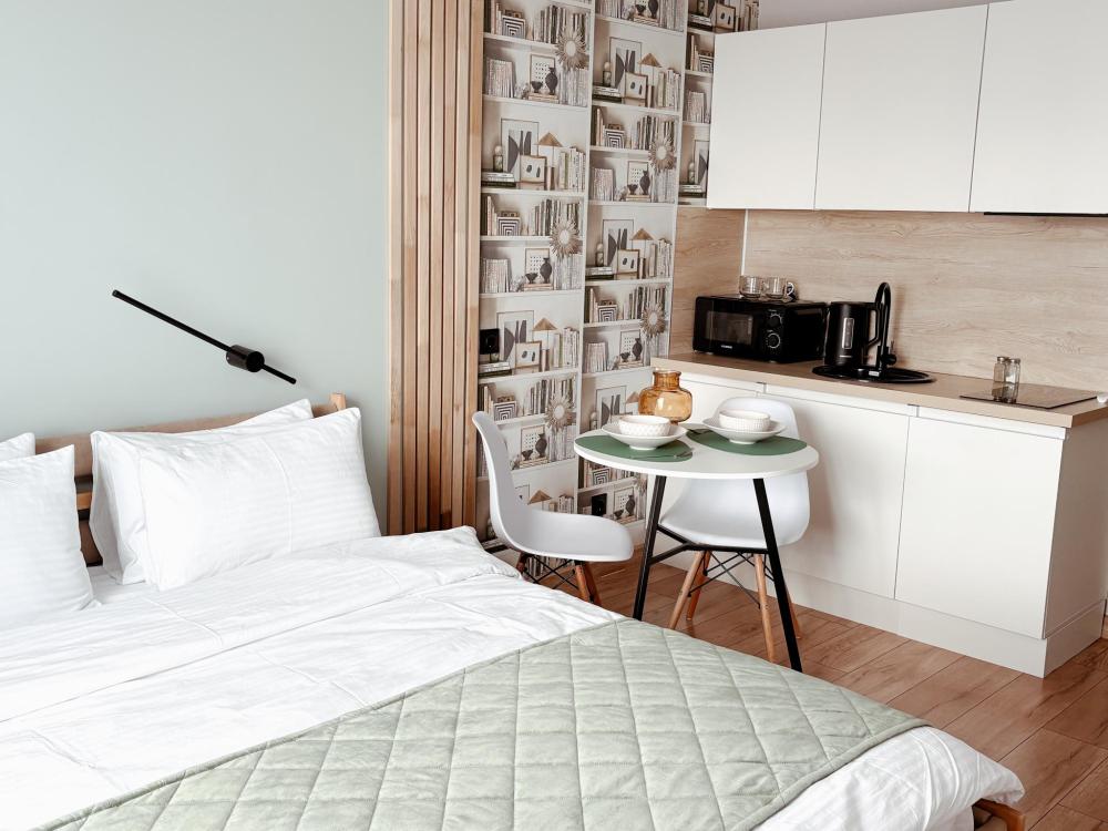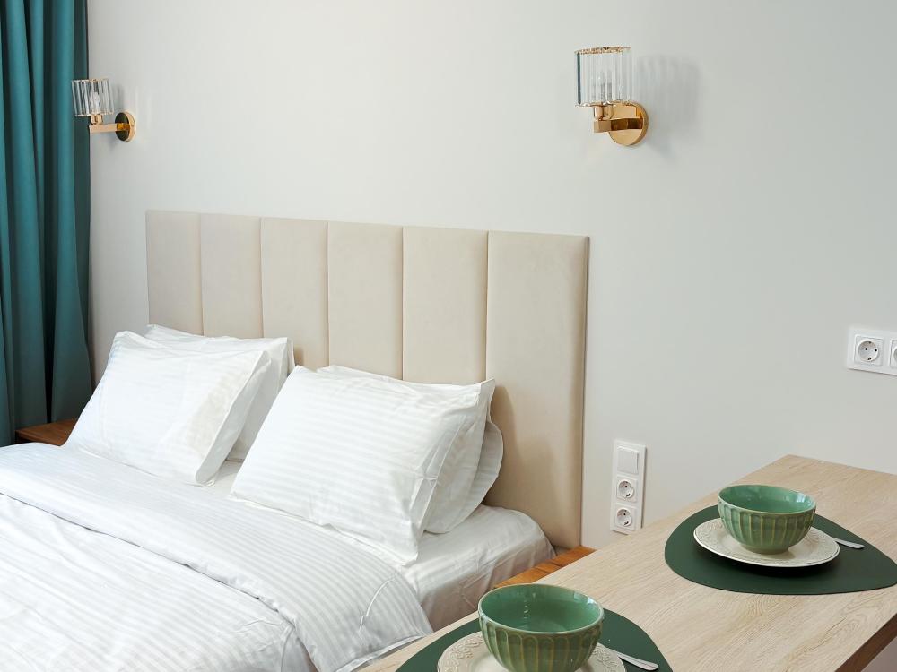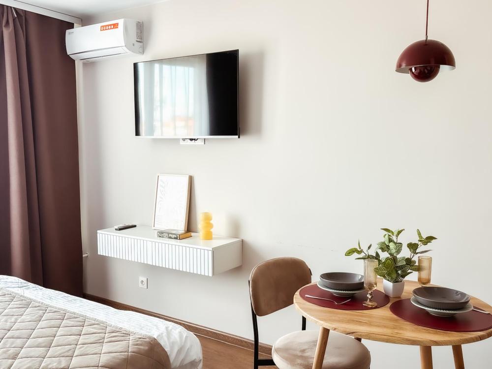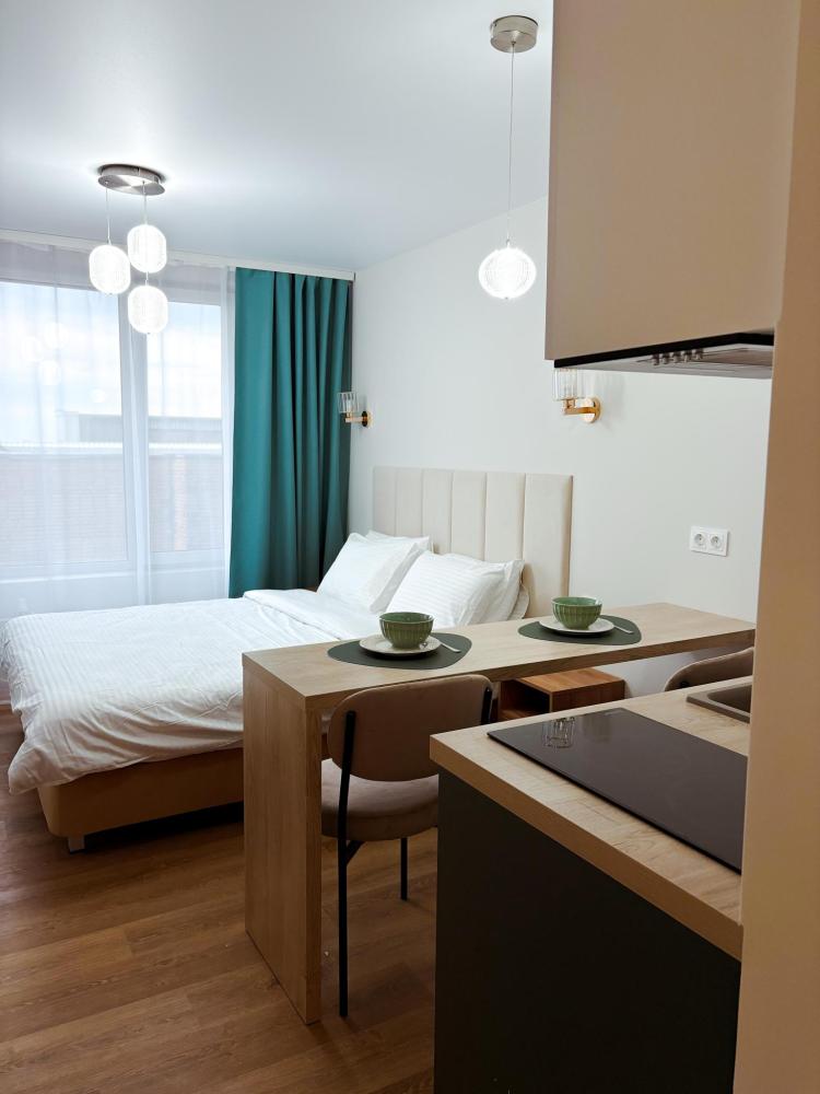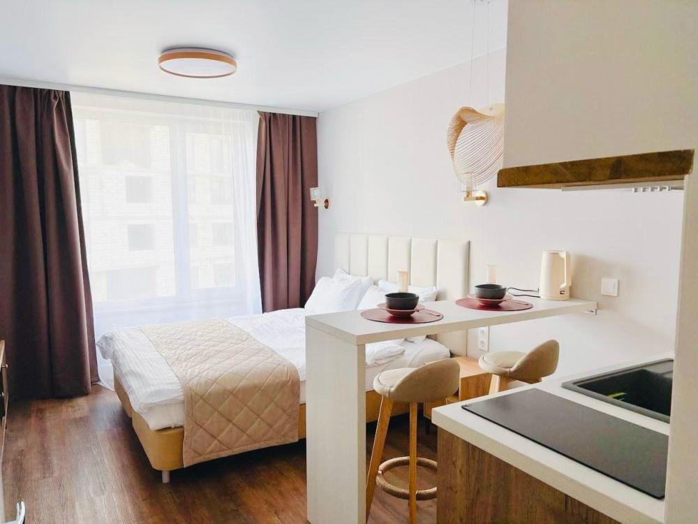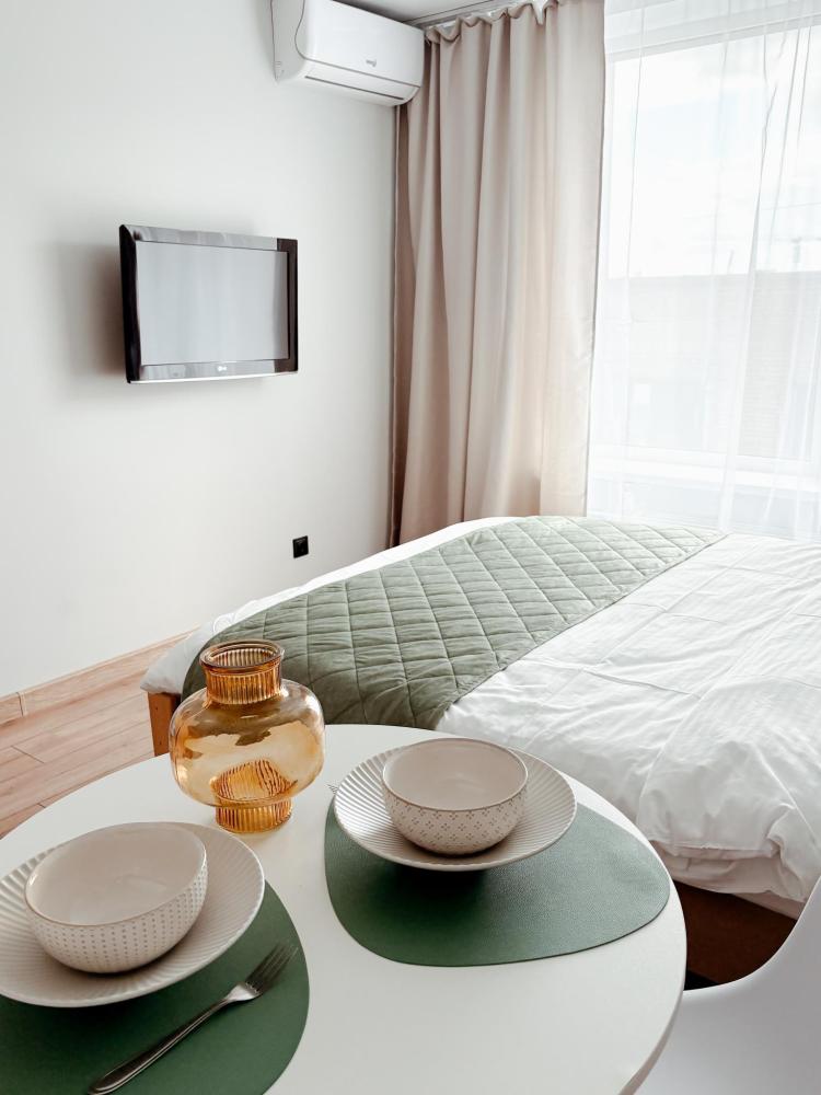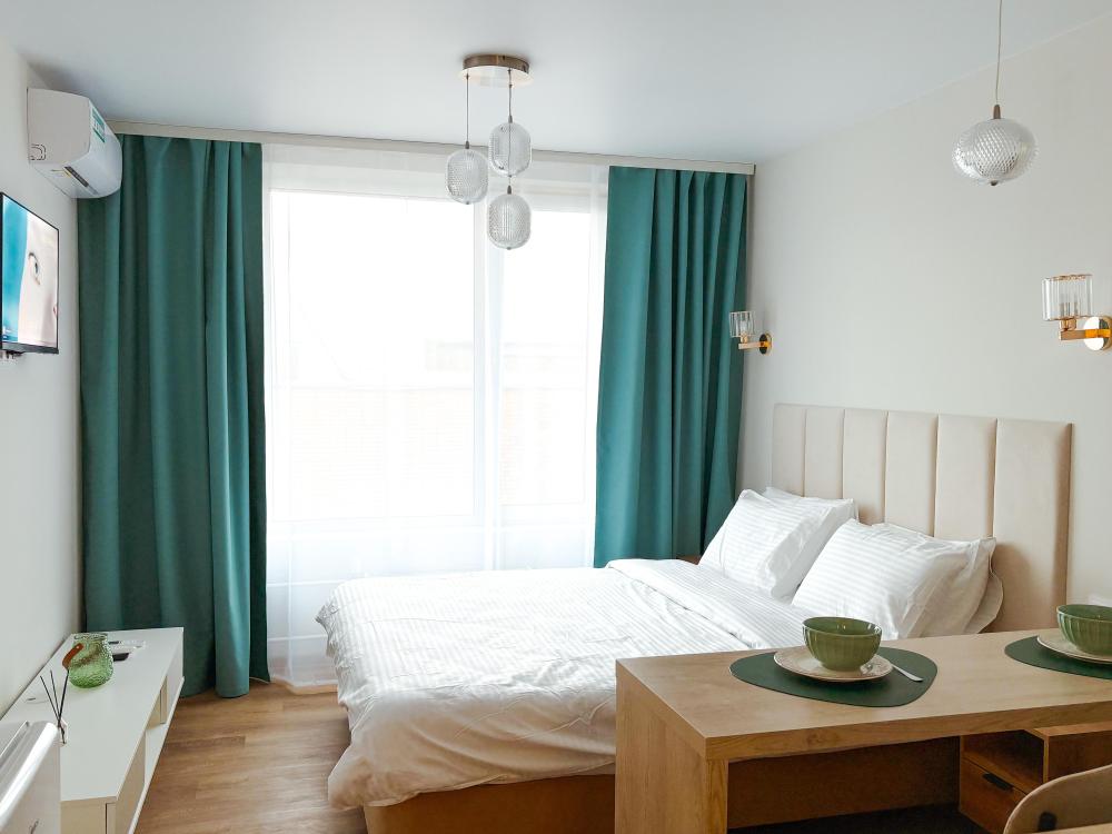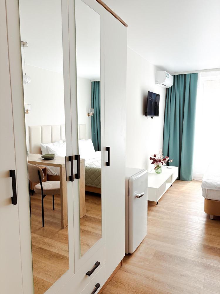 Уютные апартаменты студия. В апартаментах возможно как размещение с двуспальной кроватью, так и размещение с раздельными кроватями. Качественный текстиль, интернет и телевидение (ULTRA HD), стиральная машина, кондиционер, шторы настоящий блэкаут. Апартаменты полностью укомплектованы, чтобы гости могли получить максимальный комфорт. В апартаментах есть: утюг и гладильная доска, электрический чайник, холодильник, кондиционер, полотенца для тела, лица, гигиенический душ, гель для душа, качественный шампунь и кондиционер для волос, а также куча приятных мелочей как ватные диски, предметы гигиены и прочее.
