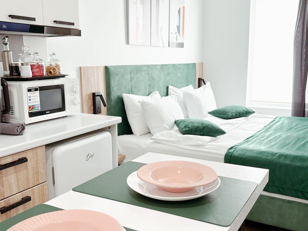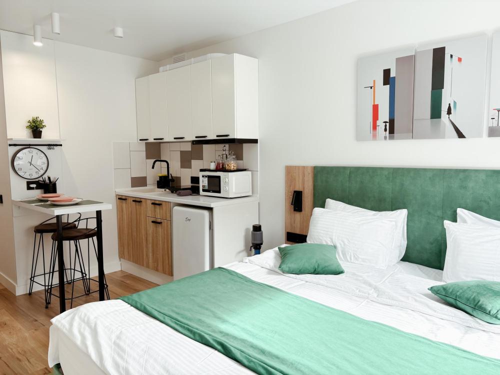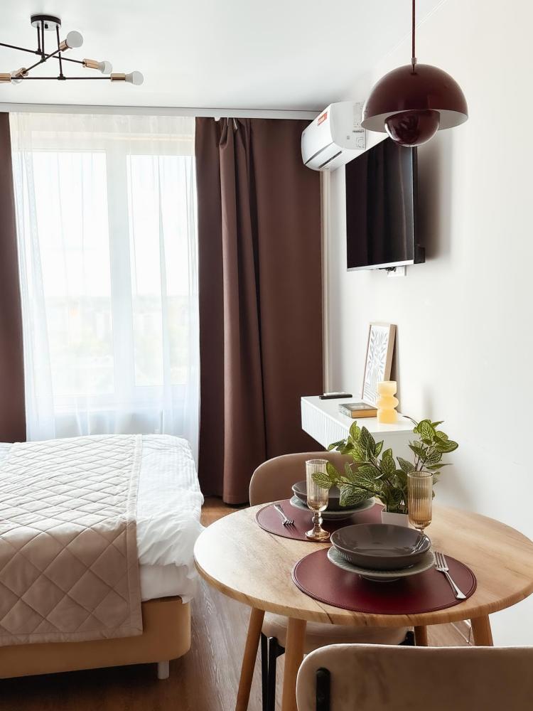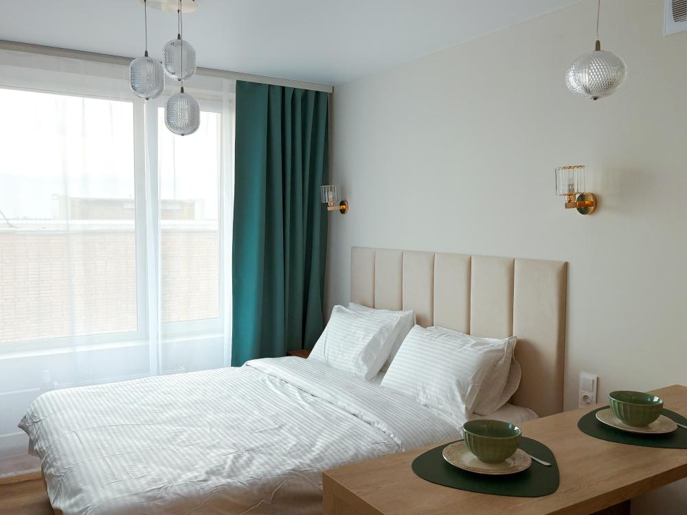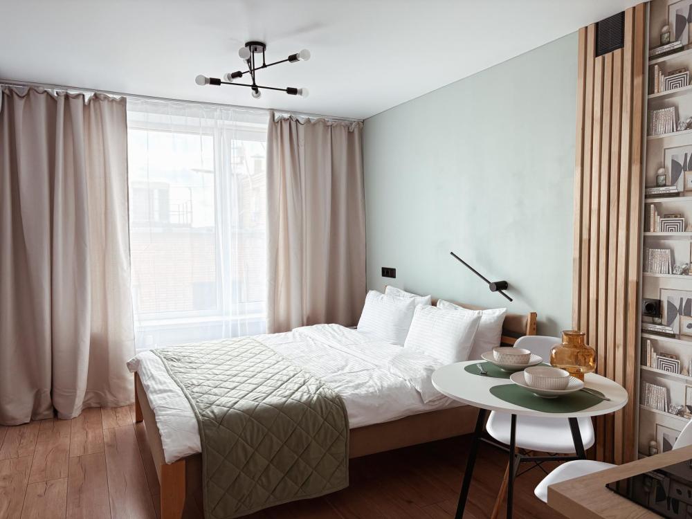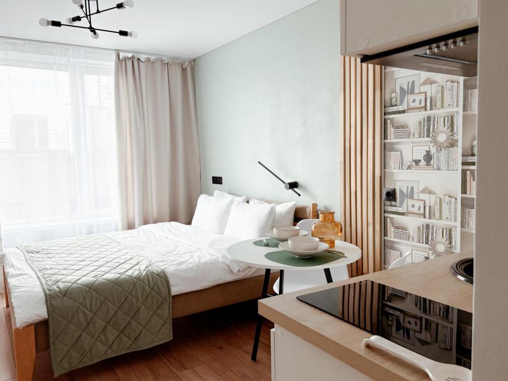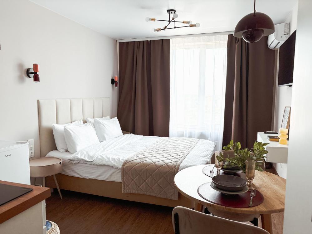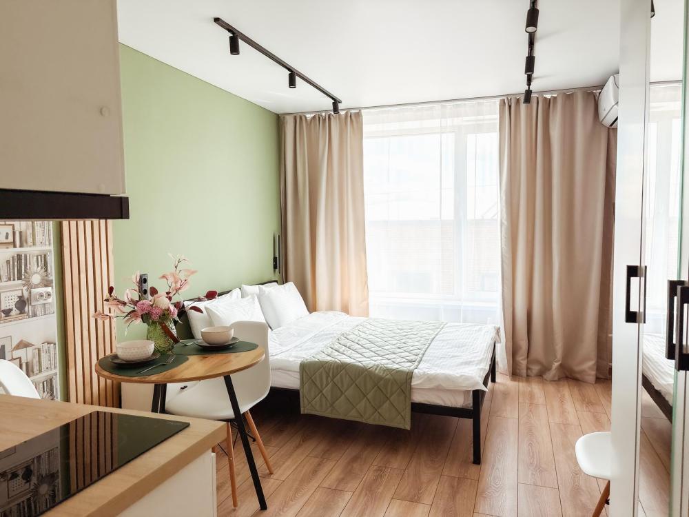 Уютные апартаменты студия. В апартаментах возможно как размещение с двуспальной кроватью, так и размещение с раздельными кроватями. Качественный текстиль, интернет и телевидение (ULTRA HD), стиральная машина, кондиционер, шторы настоящий блэкаут. Апартаменты полностью укомплектованы, чтобы гости могли получить максимальный комфорт. В апартаментах есть: утюг и гладильная доска, электрический чайник, холодильник, кондиционер, полотенца для тела, лица, гигиенический душ, гель для душа, качественный шампунь и кондиционер для волос, а также куча приятных мелочей как ватные диски, предметы гигиены и прочее.